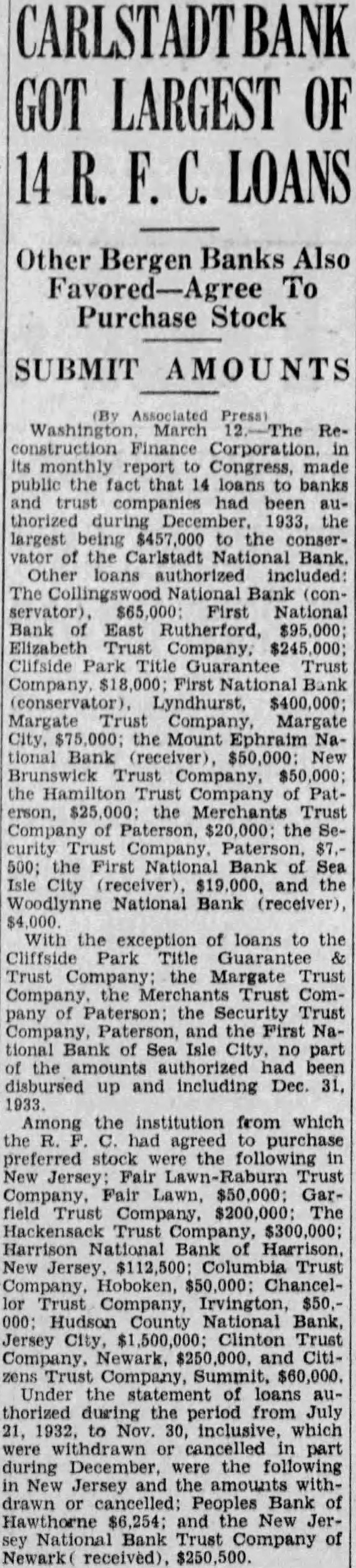 Loans Authorized For Jersey Banks RFC Report to Congress Says 14 Sanctioned In December WASHINGTON, March 12 (P).-The Reconstruction Finance Corporation, in its monthly report to Congress, made public the fact that 14 loans to New Jersey banks and trust companies had been authorized during December, 1933, the largest being $457,000 to the conservator of the Carlstadt National Bank. Other loans authorized included: Collingswood National Bank (conservator), $65,000; First National Bank of East Rutherford, $95,000; Elizabeth Trust Company, $245,000: Cliffside Park Title Guarantee Trust Company, $18,000; First National Bank (conservator), of Lyndhurst, $400,000; Margate Trust Company of Margate City, $75,000; Mount Ephraim National Bank (receiver), $50,000; New Brunswick Trust Company, $50,000; Hamilton Trust Company of Paterson, $25,000; Merchants Trust Company of Paterson, $20,000; Security Trust Company of Paterson, $7,500; First National Bank of Sea Isle City (receiver) $19,000; Woodlynne National Bank (receiver), $4,000. Exception for loans to the CliffPark Title Guarantee & Trust Company the Margate Trust Company, the Merchants Trust Company of Paterson. the Security Trust Company of Paterson, and the First National Bank of Sea Isle City, no part of the had been disbursed up to and including December 31.
