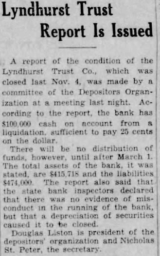 While thousands of depositors of closed state banks will get Christmas offerings in the shape of dividends before end of this month, according Banking Commissioner William Kelly's there be no dividend this year for creditors of the Steneck Trust Co., in Hoboseries of about to move to untangle the Steneck in various parts of the the week after will called on sign orders permitting payment of five per cent Kelly expects that will be creditors time for Trust Co. of Jersey City, depositors already received cent. will get ditional five per cent dividend The Bergenline Trust Co. of Union City, whose depositors have already 50 per cent, will get five cent more per before the of according to present The Lyndhurst Trust Co. deposialready per cent and they will get five this month, plan to ask Lewis for the necessary order Dec. Next Tuesday there will be an plication to Francis Davis Camden for an order permitting ten dividend for of Haddon Heights Trust Co. In other the there expected nearly million dollars will paid out in dividends In the case of the Steneck Trust series suits about to be brought in will aim settiement of the question as to whether depositors or the holders mortgage certificates prior whether are par There now Steneck Trust Co. The number depositors The money hand total dividend about 35 per cent. but that dividend not be declaruntil the courts the matter prior rights. Those who invested in Steneck Trust Co. certifleates their should come ahead of those of depositors. Those put in the bank say their claims should ahead the holders. claims these two kinds of should the same one should not preferred the other. There are also various having to with the handling these mortgage certificate will come for an airing in the coming test It the new ligitstion will get under in Milton, legal adviser Commissioner Kelly will direct this litigation on behalf the state. the Title Mortgage Co. affairs Ridgewood and can be paid for some time. affairs of that company also much inbut some progress toward settlement will be made soon the market takes on new life it possible sell property held by the company at some advantage