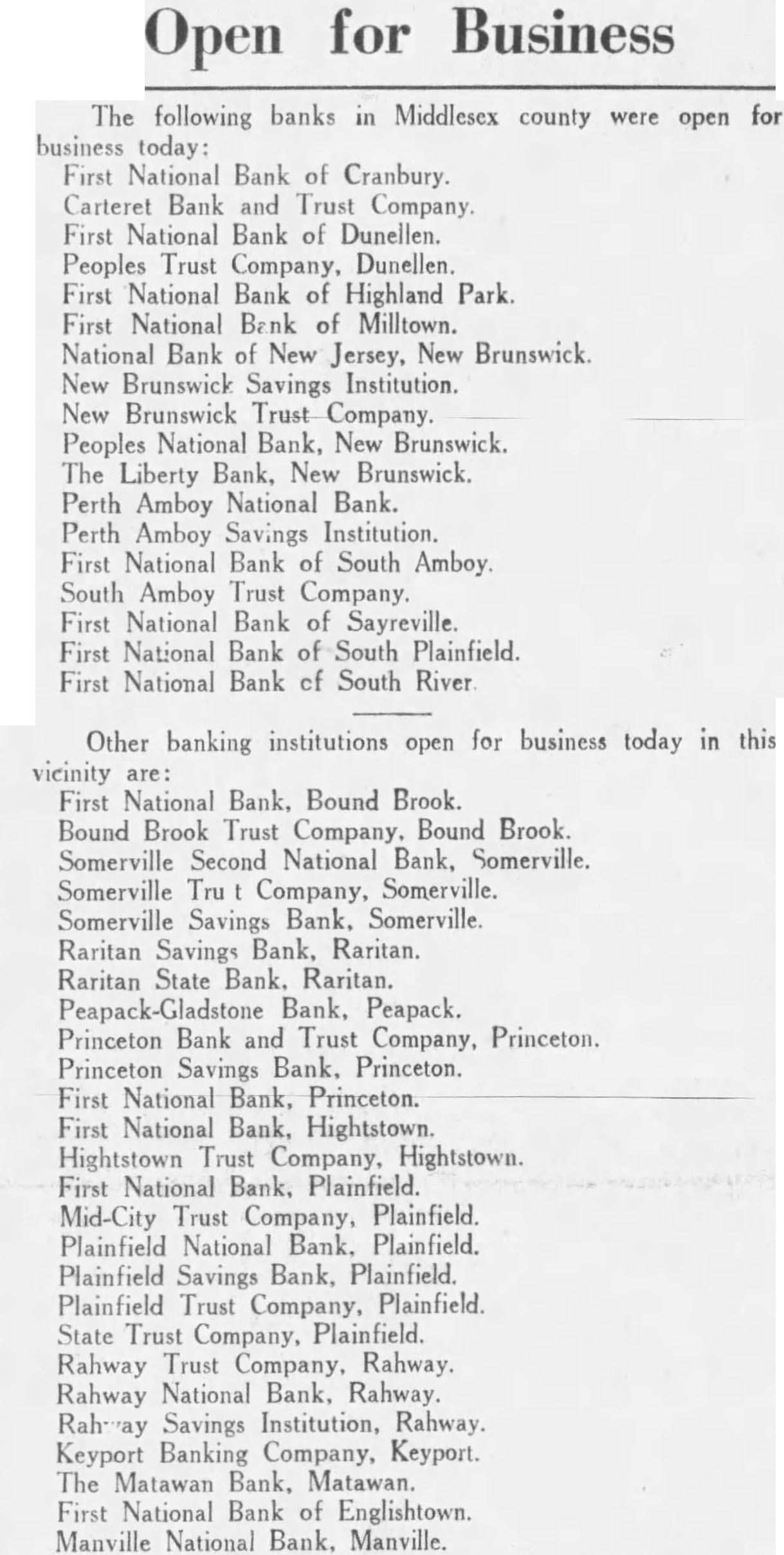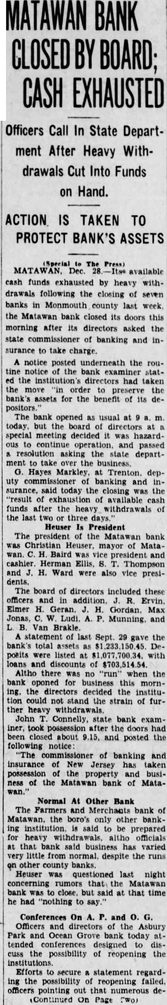 MATAWAN BANK CASH EXHAUSTED Officers Call In State Department After Heavy Withdrawals Cut Into Funds on Hand. ACTION IS TAKEN TO PROTECT BANK'S ASSETS Press) Dec. available funds exhausted by heavy withdrawals following the closing of seven banks Monmouth county last the Matawan bank closed its doors this morning after its directors asked the state commissioner of banking and surance to take notice posted underneath the the bank the had taken move order bank's assets for the benefit of its positors. The bank opened usual but the board special meeting decided ous continue operation. and passed resolution asking the department over the business. Hayes Trenton. deputy commissioner banking and surance, today the closing the "result exhaustion available cash funds after the heavy withdrawals the last two three days.' Heuser President The president the Matawan bank was Christian Heuser. mayor MataBaird vice president cashier. Herman Ellis, Thompson and H. Ward were also vice presidents. The board of directors included these officers Elmer Geran. Gordan. Max Jonas, Ludi. Munning, Van Brakle. statement last Sept. 29 the gave total assets posits were listed with and Altho there was when the oponed for business this mornthe decided the institucould not stand the strain of furheavy John Connelly, bank examiner, after the doors closed about and posted the notice "The of banking and insurance New Jersey has taken the property and business of the bank of Mata- Normal At Other Bank The and bank the only other banking said be prepared for officials that bank varied very little from normal. despite the runs other county banks. Heuser questioned last night rumors that bank close, but said at that time he had "nothing to Conferences On and Officers and directors of the Asbury Park Ocean Grove bank today tended conferences designed cuss possibility of reopening the Efforts secure statement regarding the possibility reopening officers pointing out that Continued On Page