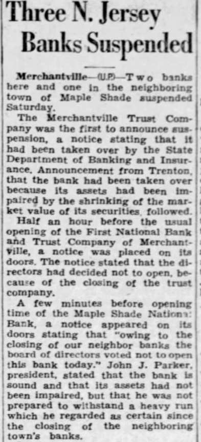 Three N. Jersey Banks Suspended banks here and in the town of Maple Shade suspended Saturday The Merchantville Trust Company was the first pension, notice stating that been taken over the State of and Insurance. from Trenton, that the bank had been taken over because its assets had been paired the shrinking of the marvalue of its securities followed. Half an hour before the usual opening of the First National Bank and Trust Company of Merchantville, notice was placed on its stated that the rectors had not open, cause of the closing of the trust company. minutes before opening time of the Maple Shade National Bank, notice appeared doors stating that "owing to the closing of our neighbor banks board voted not to open this bank John president, stated that the bank sound that its assets had not been but that he prepared to withstand heavy run which regarded certain since the closing of the neighboring town's banks.
