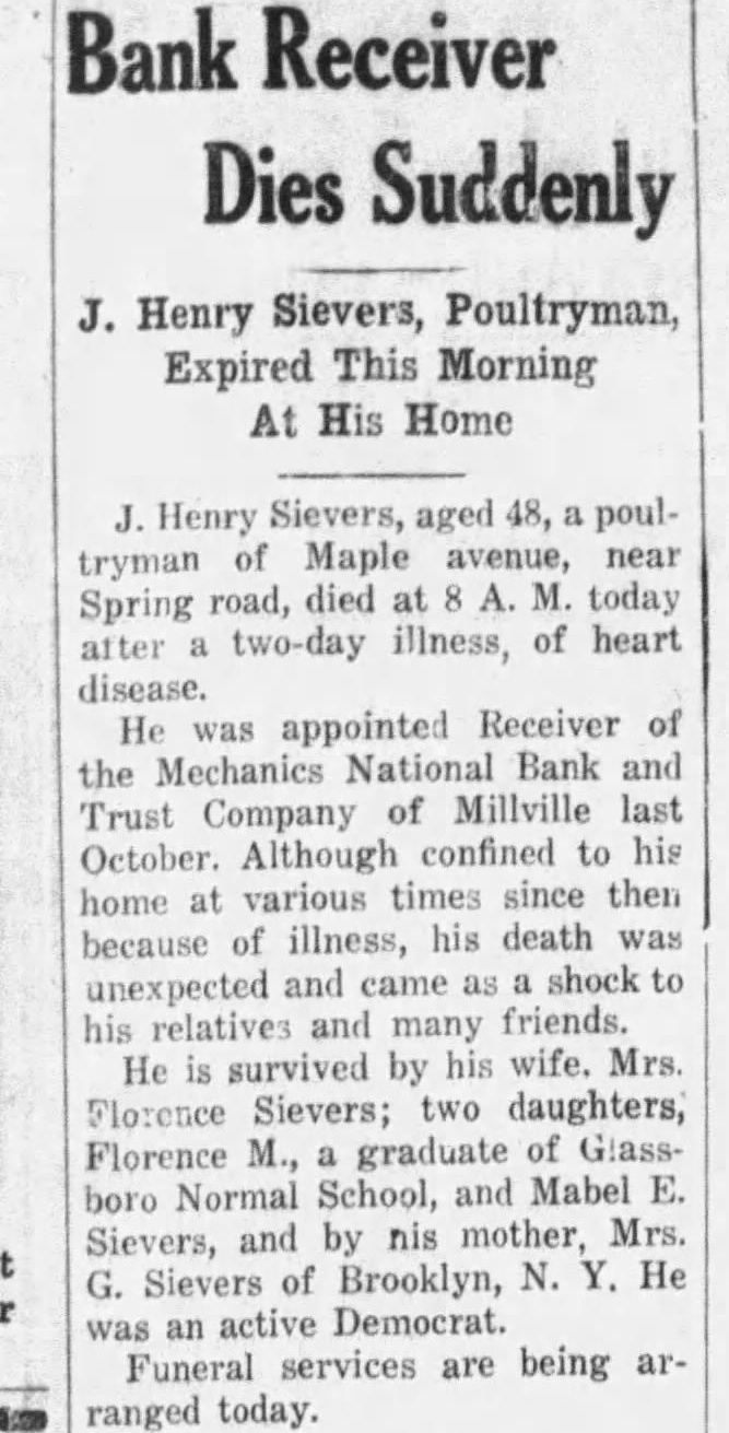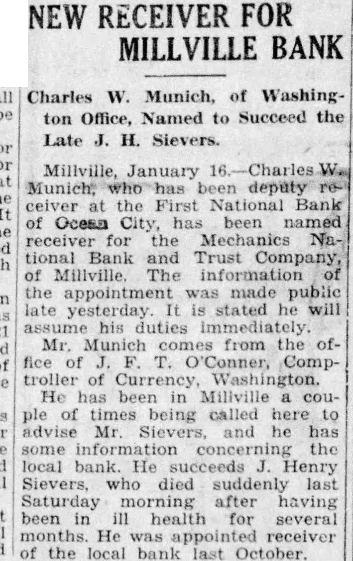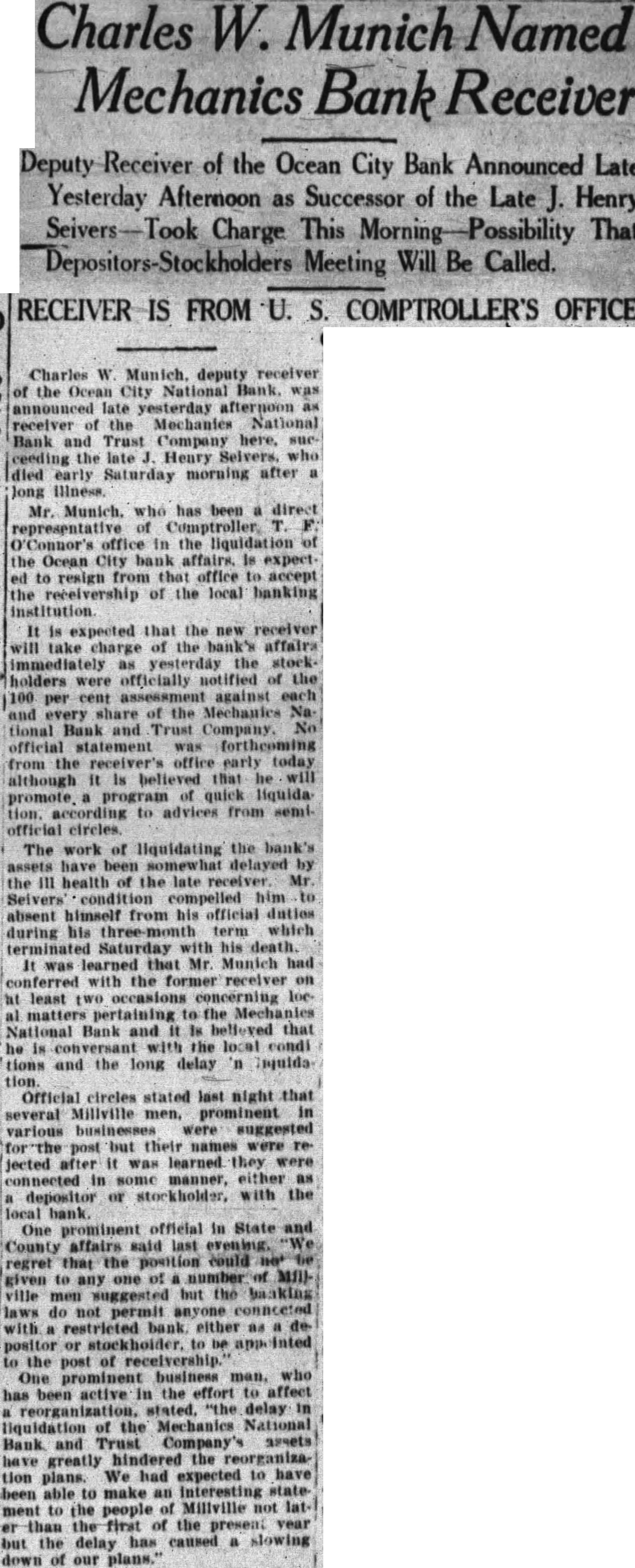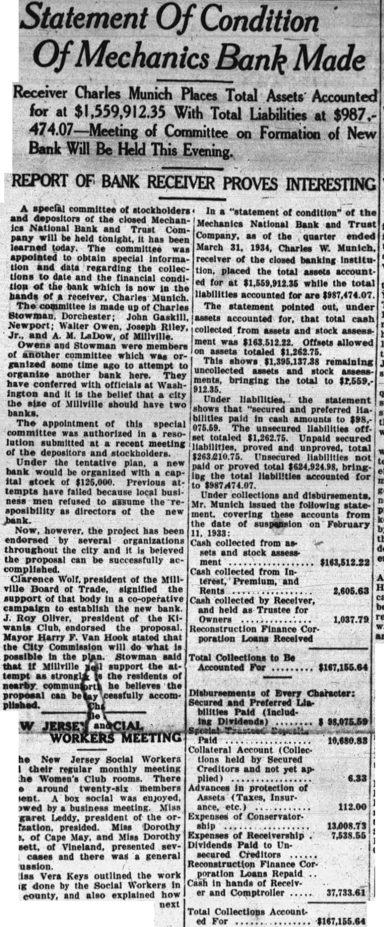 A special committee of stockholders In and depositors of the closed MechanMechanics ics National Bank and Trust Company will be held tonight, been learned today. The March committee was appointed to obtain special information and data regarding the collection, tions to date and the financial condition the bank which is now in the hands of receiver, Charles Munich. committee is made Charles The Stowman, Dorchester: John Gaskill, assets Newport; Walter Owen, Joseph Riley, Jr., and LaDow, of Miliville. ment was Owens and Stowman were members of another committee which was organized some time ago to attempt to organize another bank here. They have conferred with officials at Wash912.35. ington and the belief that city Under the size of Millville should have two shows banks. The appointment of this special committee was authorized in resolution submitted at recent meeting of the depositors and stockholders. Under the tentative plan, new bank would organized with capital stock of $125,000. Previous tempts have failed because local business men refused to assume the sposibility as directors of the new bank. the date Now, however. the project has been 1933: endorsed by several organizations throughout the city and it beleved the proposal can be successfully acment complished. Clarence Wolf. president of the Millville Board of Trade, signified the Rents support of that body in co-operative campaign to establish the new bank. Roy Oliver, president of the Owners wants Club, the proposal. Mayor Harry Van Hook stated that the City will do what possible in the plan. Stowman said that support the at- Accounted tempt the residents of he believes the proposal can cessfully accomplished.