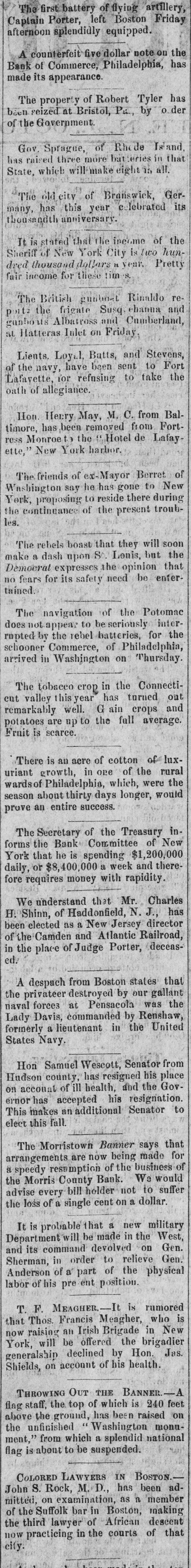 The first battery of flying artillery, Captain Porter, left Boston Friday afternoon splendidly equipped. A counterfeit five dollar note on the Bank of Commerce, Philadelphia, has made its appearance. The property of Robert Tyler has been reized at Bristol, Pa, by o.der of the Government Gov. Sprague, of Rhc Island, has raised three more but teries in that State, which will make eight is all. The icity of Branswick, Germany, has this year c elebrated its thousandth anniversary. It stated that the income of the Sheriff of New York City is two hunPretty fair income for these :im The British gunbat Rinaldo rethe frigate Susq poitz Cumberland, channa and gunhoits Albatross and at Hatteras Inlet on Friday, Lients, Loyal, Batts, and Stevens, of have been sent for refusing to Lafayette, the navy, take to Fort the oath of allegiance. Hon Herry May, M. c. from Baltimore, has been removed from Fortress Monroet the e Hotel de Lafay ette," New York harbor. The friends of ex Mayor Berret of Washington say he has gone to New York, proposing to reside there during the continuance of the present troubles. The rebels boast that they will soon a dash upon S the the make Democrat expresses Lonis, opinion but that no fears for its safety need be entertained. The navigation of the Potomac does not appear to be seriously interropted by the rebel batteries, for the schooner Commerce, of Philadelphia, arrived in Washington on Thursday. The tobacco crop in the Connecticut valley this year has turned and out remarkably well. G ain crops potatoes are up to the full average. Fruit is scarce. There is an acre of cotton of luxuriant growth, in one of the rural wardsof Philadelphia, which, were the season about thirty days longer, would prove an entire success. The Secretary of the Treasury informs the Bank Committee of New York that he is spending $1,200,000 theredaily, or $8,400,000 a week and fore requires money with rapidity. We understand that Mr. Charles Shinn, of Haddonfield, N. J., has been H. elected as a New Jersey director of the Camden and Atlantic Railroad, in the place of Judge Porter, deceased. A despach from Boston states that the privateer destroyed by our gallant the naval force3 at Pensacola was Lady Davis, commanded by Renshaw, United formerly a lieutenant in the States Navy. Hon Samuel Wescott, Senator from Hudson county, has resigned his place Govaccount of ill health, and the on has accepted his resignation. to ernor This makes an additional Senator elect this fall. The Morristown Banner says that for arrangements are now being business made of speedy resemption of the We would a Morris County Bank. suffer the advise every bill holder not dollar to the loss of a single cent on a It is probable that a new military West, Department will be made in the Gen. its command devolved on and in order to relieve Gen. Sherman, Anderson of a part of the physical labor of his pre ent position. F. MEAGHER It is rumored is T. Thos Francis Meagher, who New that raising an Irish Brigade in now will be offered the brigadier Jas. generalship York, declined by health. Hon. Shields, on account of his THROWING OUT THE BANNER feet staff, the top of which is 240 flag above the ground, has been raised on the unfinished " Washington national monument," from which a splendid flag is about to be suspended. COLORED LAWYERS IN BOSTON.- adS. Rock, M.D., has been member mitted, John on examination, as n making the Suffolk bar in Boston, descent of third lawyer of African that the now practicing in the courts of city.