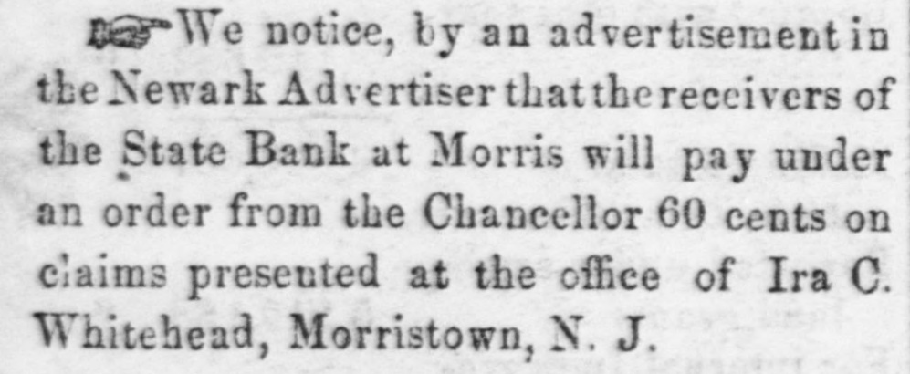D We notice, by an advertisement in the Newark Advertiser thatthereceivers of the State Bank at Morris will pay under an order from the Chancellor 60 cents on claims presented at the office of Ira C. Whitehead, Morristown, N. J.
