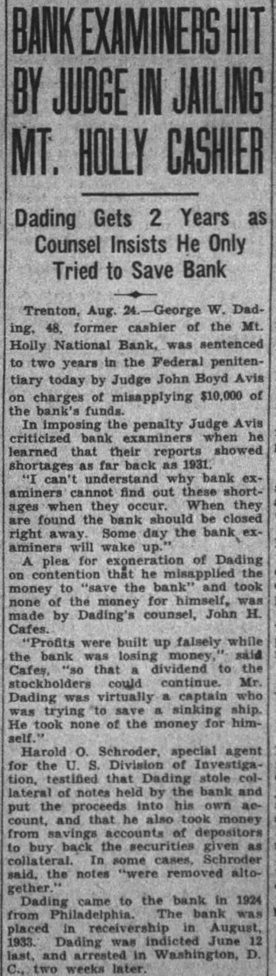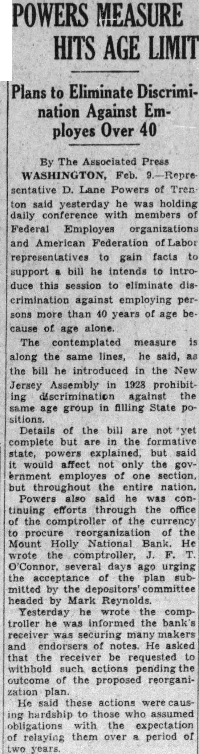 POWERS MEASURE HITS AGE LIMIT Plans to Eliminate Discrimination Against Employes Over 40 By The Associated Press WASHINGTON, Feb. Repre sentative D. Lane Powers of Tren ton said yesterday he was holding daily conference with members of Federal Employes organizations and American Federation of Labor representatives to gain facts to support a bill he intends to introduce this session to eliminate discrimination against employing persons more than 40 years of age because of age alone. The contemplated measure is along the same lines, he said, as the bill he introduced in the New Jersey Assembly in 1928 prohibiting discrimination against the same age group in filling State positions. Details of the bill are not yet complete but are in the formative state, powers explained, but said it would affect not only the government employes of one section, but throughout the entire nation. Powers also said he was continuing efforts through the office of the comptroller of the currency to procure reorganization of the Mount Holly National Bank. He wrote the comptroller, J. F. T O'Connor, several days ago urging the acceptance of the plan submitted by the depositors' committee headed by Mark Reynolds. Yesterday he wrote the comptroller he was informed the bank's receiver was securing many makers and endorsers of notes. He asked that the receiver be requested to withhold such actions pending the outcome of the proposed reorganization plan. He said these actions were causing hardship to those who assumed obligations with the expectation of relaying them over a period of two years.