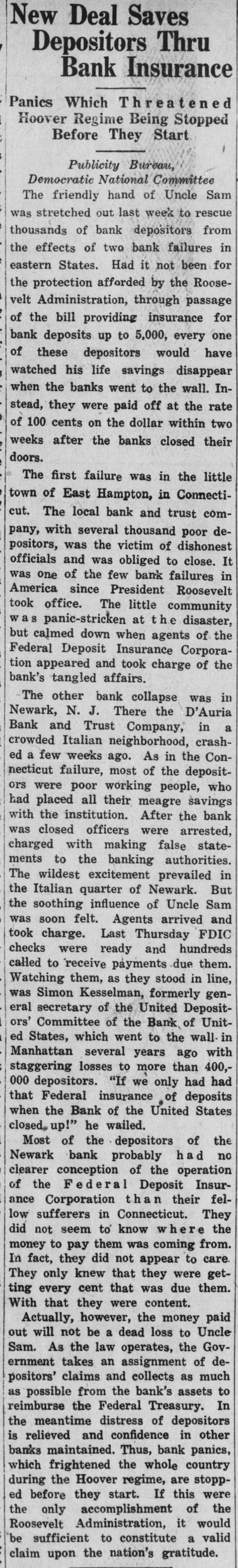 New Deal Saves Depositors Thru Bank Insurance Panics Which Threatened Hoover Regime Being Stopped Before They Start Publicity Bureau, Democratic National Committee The friendly hand of Uncle Sam was stretched out last week to rescue thousands of bank depositors from the effects of two bank failures in eastern States. Had it not been for the protection afforded by the Roosevelt Administration, through passage of the bill providing insurance for bank deposits up to 5,000, every one of these depositors would have watched his life savings disappear when the banks went to the wall. Instead, they were paid off at the rate of 100 cents on the dollar within two weeks after the banks closed their doors. The first failure was in the little town of East Hampton, in Connecticut. The local bank and trust company, with several thousand poor depositors, was the victim of dishonest officials and was obliged to close. It was one of the few bank failures in America since President Roosevelt took office. The little community was panic-stricken at the disaster, but calmed down when agents of the Federal Deposit Insurance Corporation appeared and took charge of the bank's tangled affairs. The other bank collapse was in Newark, N. J. There the D'Auria Bank and Trust Company, in a crowded Italian neighborhood, crashed a few weeks ago. As in the Connecticut failure, most of the depositors were poor working people, who had placed all their meagre savings with the institution. After the bank was closed officers were arrested, charged with making false statements to the banking authorities. The wildest excitement prevailed in the Italian quarter of Newark. But the soothing influence of Uncle Sam was soon felt. Agents arrived and took charge. Last Thursday FDIC checks were ready and hundreds called to receive påyments due them. Watching them, as they stood in line, was Simon Kesselman, formerly general secretary of the United Depositors' Committee of the Bank of United States, which went to the wall. in Manhattan several years ago with staggering losses to more than 400,000 depositors. "If we only had had that Federal insurance of deposits when the Bank of the United States closed up!" he wailed. Most of the depositors of the Newark bank probably had no clearer conception of the operation of the Federal Deposit Insurance Corporation than their fellow sufferers in Connecticut. They did not seem to' know where the money to pay them was coming from. In fact, they did not appear to care They only knew that they were getting every cent that was due them. With that they were content. Actually, however, the money paid out will not be a dead loss to Uncle Sam. As the law operates, the Government takes an assignment of depositors' claims and collects as much as possible from the bank's assets to reimburse the Federal Treasury. In the meantime distress of depositors is relieved and confidence in other banks maintained. Thus, bank panics, which frightened the whole country during the Hoover regime, are stopped before they start. If this were the only accomplishment of the Roosevelt Administration, it would be sufficient to constitute a valid claim upon the nation's gratitude.