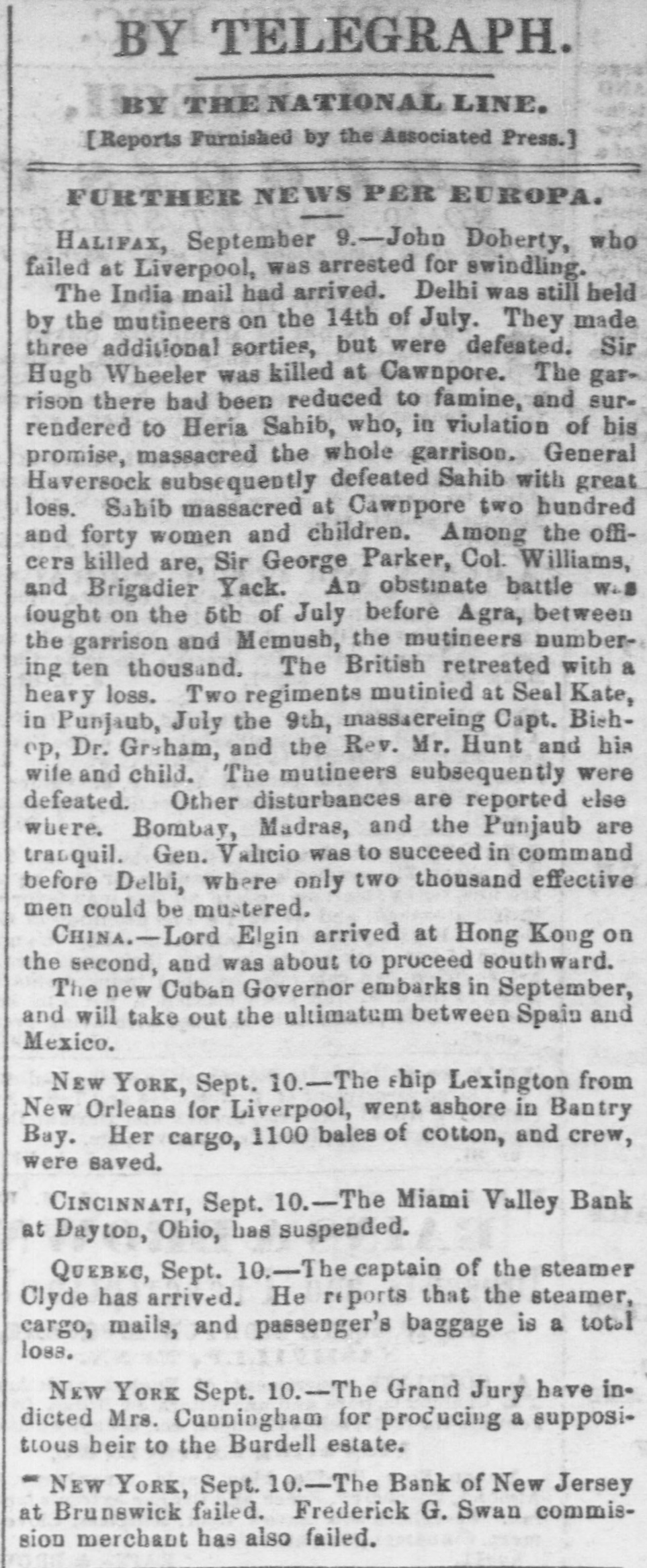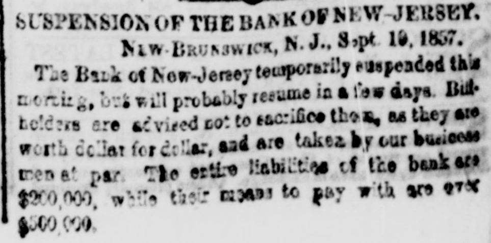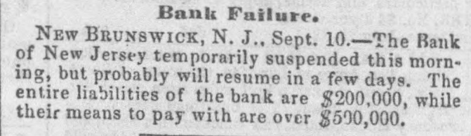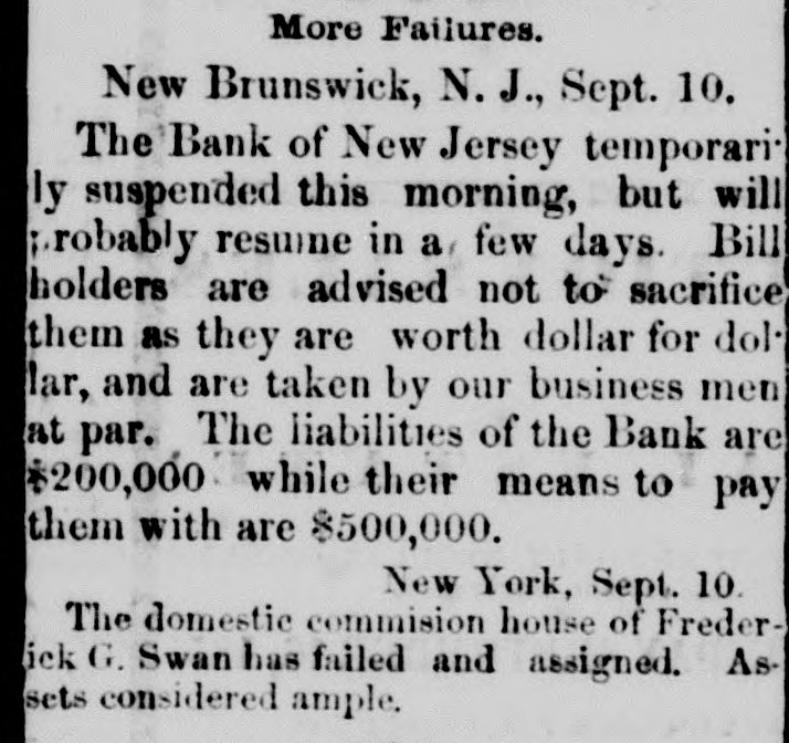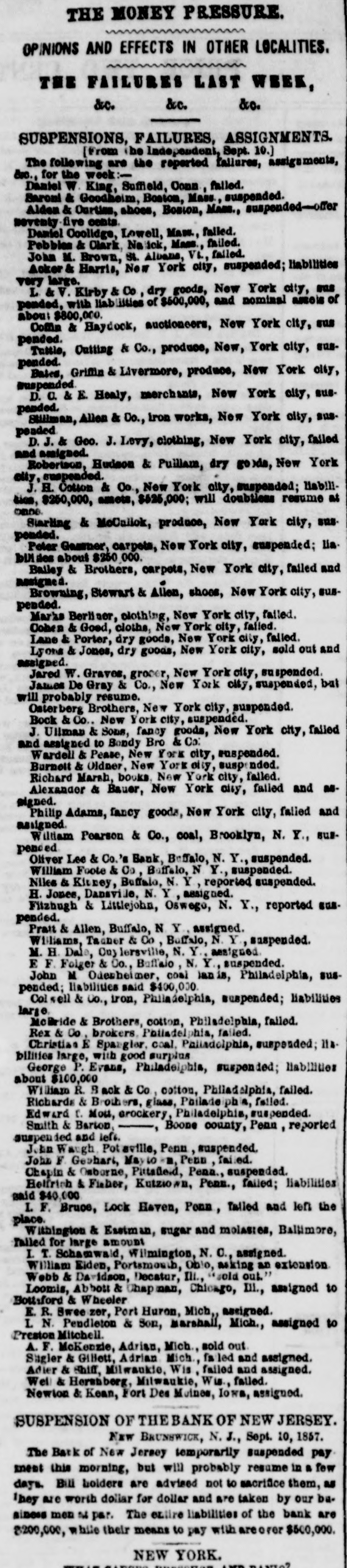 THE FINANCIAL PRESSURE. SUSPENSIONS, FAILURES, ASSIGNMENTS. [From the Insependent. Sept. 17.] The following are the reported failures, assignments, &re. :Ruggles & Co, Pouliney, Vt, failed. Eaton, Hill and Candier, crugs, Boston, failed. W. F. Freeman, Boston, Mass., failed. Freeman Orne, Boston, Mass, gone into inselvency. Philip Allen & Sons. Providence, R. I., suspended. Z. Allen, Providence, R. L, suspended on endorsed paper. Loger & Pecknap, Palmer's Corners, Conn., assigned. Nesmith & Co, New York city, suspended. Carpenter, Ide & Co., straw goods, New York city, suspended. Frederick G. Swan, New York city, assigned; liabilities said about $1,200,000. Foster & Nickerson, New York city, suspended. Joseph F. Moyses, dry goods, New York city, suspended. Grant, Sayles & Ford, produce, New York city, suspended. W. T. Hicks & Do., New York city, surpended. Welslar & Tunnsis, New York city, failed. Walker P. Jones, liquors, New York city, suspended. William J. Bell & Oo,, bankers, New York city, suspended. Frost & Pierce, hats, New York, suspended. Bayaud & Treadwell, liquors, New York city, sus. pended. G. H. Swords, Walton & Co., hardware, New York city, suspended. C. B. Conant, Dodge & Co., hardware, New York city, suspended. Thomas Douglass, hardware, New York city, assigned to Cha les Douglass and John M. Eagar. Carpenter & Fullerton, New York city, assigned; caused, at lemid, by failure of Acker & Harris. Street & Emanuel Brothers, New York city, falled. Salmon & Meyer, New York city, suspended. Stephen Potter, Jumber, New York city, assigned. Geo. W. Alwaier, New York city, suspended. Rich & Lou'rel, New York city, suspended. Clark, Guthrie & Ssurgis, Buffalo, N. Y., suspended. E.K. Bruce, Buffalo, N. Y, falled William Penfield, Buffalo, N. Y falled. Prait & Perrine, Rochester, N. Y., assigned. Orange Cassin, Rochester, N. Y., failed. Justin Forbes, Mount Morris, N. Y., failed and assigned. Bank of New Jersey, New Brunswick, N. J., suspended. John G. Kitchen. Newark N J., failed. I. D. Hail & Oo., Trenton, N. J., failed. M. B. Canfield, Orange, N. J., suspended and said to have compromised. Dawson & Hancock, iron and crockery, Philadelphia, suspended; liabilities very heavy. John Y. Rushton & Co., crockery, Philadelphia, suspended. Themas White & Co, straw goods, Philadelphia, suspended; liabilities said to be $300,000. F aiberhoff, Montgomery & Co., grocers, Philadelphia, failed. W. P. & G. Hacker, crockery, Philadelphia, suspended. W. W. & H Smith, Philadelphia. Hayes & Smith, coal, Philadelphia, suspended. Joseph Ripka, Philadelphia, suspended; liabilities about $500,000. Hart, Montgomery & Co., Philadelphia, suspended. Marple, McClure & Co., Philadelphia, suspended. J. & W. Horrock, dyers, Philadelphia suspended. Rockhill & Wilson, clothing Philadelphia, suspended. Hotchkiss & Barton, Scranion, Penn, falled. John Gommell, Patersville, Pean, failed. P. H. Sullivas, broker, Baltimore, Md., failed. Michael Weavel, Cumberland, Md., failed. Pratec & Nourse, bankers, Washington, D. C., sus. pended. Binford, Mayo & Blair, Richmond, Va., suspended. Bonham, Gilbermon and Co., Wheeling, Va, assigned. James Carrigan, Charleston, 8. C suspended. W. B. Beazley, Wilston, S. C., falled 8 Eusell & Sons, Morganfield, Ky., failed. Bisely & Co., St. Louis, Mo., suspended. R.H. Habbard, St. Louis, Mo., suspended. D. Armfield, St. Louis, Mo., assigned. Smead, Callord & Hughes, bankers, Cincinnati, Ohio, suspended. Jesse A. Moore, Cincinnati, Obio, assigned. Rose & Jennings, Columbus, Ohio, suspended and assigned. D.E. Livermore, Sandusky city, Ohio, suspended. E. Franklin & Son, Alexandria, Ohio, failed and assigned. H. M Chandler, Attica, Ohio, failed. J. C Schuyler, Attica, Ohio, failed. Ourtise & Bibbler, Berwick, Ohio, failed. E. Higbee, Attion, Ohio, failed. Stearm, Lcomey & Co., La Porte, Indiana, falled and as. signed. B. F. Farnsworth, Chicago, Illineis, assigned to F. M. Williams. G. F. Hamilton, Chicago, Illinois, failed and assigned. D. C. Norton, Lockport. Illisois, assigned. John C. Forbes, Lane, Illinois, failed. Wm. C. Kyle, Franklin, Michigan, failed. E. Fish pool, New Baltimore, Michigan, assigned. Powell & Bicard, Waterford, Wisconsin, failed. M. Gullen, Beloit, Wisconsin, failed. I. F. Lyon & On, Fairfield, Wiscomsin, failed. E. K. Tribue, Onouna, Iowa, suspended. Albert & Ross, Burris, Iowa, failed. Askew & Cavitn, Grandview, Iowa, failed. H. C. Knowles, Agency City, Iown, failed. Charles Robinson, Teronto, Canada West, suspended.