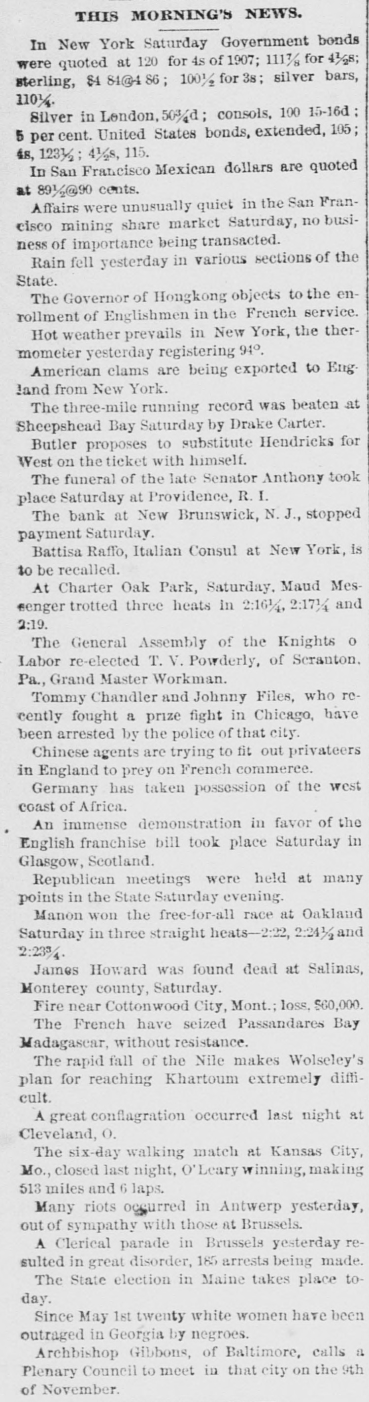 THIS MORNING'S NEWS. In New York Saturday Government bonds were quoted at 120 for 4s of 1907; 111½ for 41/28; sterling, $4 84@4 86; 100½ for 3s; silver bars, 110½.4. Silver in Lendon, 50%/d; consols, 100 15-16d 5 per cent. United States bonds, extended, 105; 4s, 1233/2; 41/28, 115. In San Francisco Mexican dollars are quoted at 89½/2@90 cents. Affairs were unusually quiet in the San Francisco mining share market Saturday, no business of importance being transacted. Rain fell yesterday in various sections of the State. The Governor of Hongkong objects to the enrollment of Englishmen in the French service. Hot weather prevails in New York, the thermometer yesterday registering 94°. American clams are being exported to Eng. land from New York. The three-mile running record was beaten at Sheepshead Bay Saturday by Drake Carter. Butler proposes to substitute Hendricks for West on the ticket with himself. The funeral of the late Senator Anthony took place Saturday at Providence, R. I. The bank at New Brunswick, N. J., stopped payment Saturday. Battisa Raffo, Italian Consul at New York, is to be recalled. At Charter Oak Park, Saturday. Maud Messenger trotted three heats in 2:16½, 2:17½ and 2:19. The General Assembly of the Knights 0 Labor re-elected T. V. Powderly, of Scranton. Pa., Grand Master Workman. Tommy Chandler and Johnny Files, who recently fought a prize fight in Chicago, have been arrested by the police of that city. Chinese agents are trying to fit out privateers in England to prey on French commerce. Germany has taken possession of the west coast of Africa. An immense demonstration in favor of the English franchise bill took place Saturday in Glasgow, Scotland. Republican meetings were held at many points in the State Saturday evening. Manon won the free-for-all race at Oakland Saturday in three straight heats-2:22, 2:24½ and 2:23% James Howard was found dead at Salinas, Monterey county, Saturday. Fire near Cottonwood City, Mont.; loss, $60,000. The French have seized Passandares Bay Madagascar, without resistance. The rapid fall of the Nile makes Wolseley's plan for reaching Khartoum extremely difficult. A great conflagration occurred last night at Cleveland, O. The six-day walking match at Kansas City, Mo., closed last night, O' Leary winning, making 513 miles and 6 laps. Many riots occurred in Antwerp yesterday, out of sympathy with those at Brussels. A Clerical parade in Brussels yesterday resulted in great disorder, 185 arrests being made. The State election in Maine takes place today. Since May 1st twenty white women have been outraged in Georgia by negroes. Archbishop Gibbons, of Baltimore, calls a Plenary Council to meet in that city on the 9th of November.