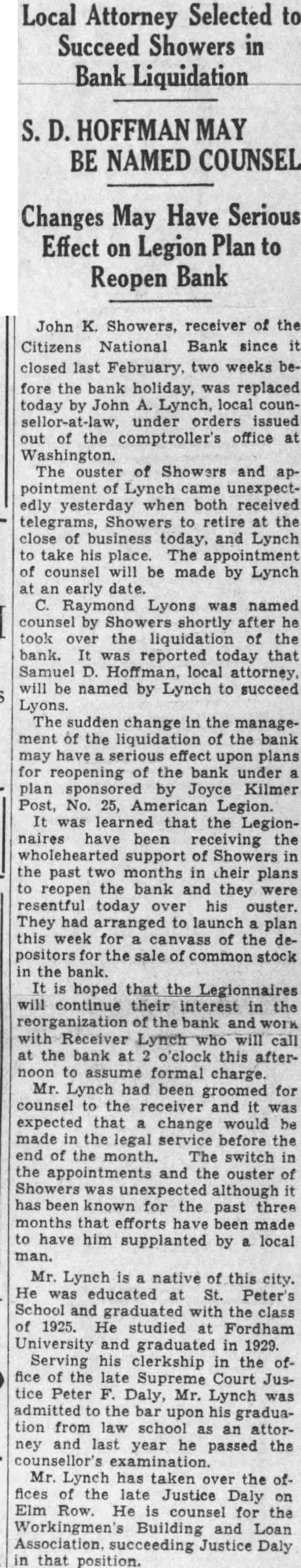 Local Attorney Selected to Succeed Showers in Bank Liquidation BE NAMED COUNSEL Changes May Have Serious Effect on Legion to Reopen Bank John K. Showers, receiver of the Citizens National Bank since closed last February, two weeks before the bank holiday, replaced today John Lynch, local coununder orders issued out of the comptroller's office Washington. The ouster of Showers and pointment Lynch came edly yesterday when both received retire the close business Lynch take place. The appointment counsel will be made by Lynch Lyons named counsel by shortly after took over the liquidation the bank. today that Samuel Hoffman, local attorney. will be named by Lynch to succeed Lyons. The change the management of the liquidation of the may serious effect plans reopening of the bank under sponsored by Joyce Kilmer Post, No. American Legion. was learned that the Legionnaires been receiving the support of Showers the past two months in their plans reopen the bank and they resentful today over ouster. They arranged to launch this week for canvass of the the sale common the bank. hoped that the Legionnaires continue their interest reorganization of the bank Receiver Lynch will the bank o'clock this afterassume formal charge. Mr. Lynch had been groomed for counsel the receiver and expected that change would made the legal service before the end of the month. The switch the appointments and the ouster was unexpected although been known for the past three months efforts been made have him supplanted by local man. Mr. Lynch native this city. He educated School and graduated with the class 1925. studied Fordham University and graduated in 1929. Serving his clerkship the of the Supreme Court Justice Peter Daly, Mr. Lynch admitted the bar upon graduation from law school attorney year passed the counsellor's Mr. Lynch has taken the the late Justice Daly Elm Row. He counsel for the Workingmen's Building and Association. succeeding Justice Daly that position.