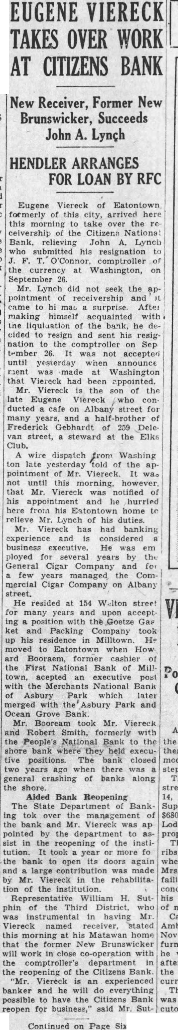 EUGENE VIERECK TAKES OVER WORK AT CITIZENS BANK New Receiver, Former New Brunswicker, Succeeds John A. Lynçh HENDLER ARRANGES FOR LOAN BY RFC Eugene Viereck of Eatontown formerly this city, arrived here this to take over the ceivership the Citizens National Bank, relieving John Lynch who submitted his resignation O'Connor, comptroller currency Washington, on September Mr. Lynch did not seek the pointment came surprise. After making himself acquainted with the of the bank, he decided to resign and his resignation comptroller on Sep tember 26. not accepted until yesterday when announce ment made Washington that Viereck had been appointed. Mr. Viereck the of the Eugene Viereck ducted Albany street for many and Frederick Gebhardt 259 Delevan street, steward the Elks Club. wire dispatch from Washing late yesterday pointment of Mr. Viereck. not until this morning, however Viereck was notified his appointment he hurried from his Eatontown home relieve Mr. Lynch his duties. Viereck has had banking experience and considered business executive. He ployed several years the General Cigar Company and for few years managed the Commercial Cigar Company Albany street. He resided 154 Welton street for many years and upon Goetze Gas Packing Company took up his Milltown. H moved Eatontown when How ard former the First Bank of Mill town, acepted executive with the Merchants National Bank Asbury Park later merged Asbury Park and Ocean Grove Bank Mr. Booream took Mr. Viereck and Robert Smith, with the People's National Bank the the shore bank where held executive positions. The bank closed mody two years when there general crashing of banks along the Aided Bank Reopening The State Department Banking tok over the management the bank and Mr. Viereck was ap Loder pointed by the department to sist in the reopening the institution. took year more fo ribs the bank open doors again when and contribution made Viereck in rehabilitation of institution. Sutphin Third District, instrumental having Mr Viereck named receiver. stated morning at his Matawan home that the former New Brunswicker work in close co-operation he the comptroller's department reopening the Citizens Viereck experienced curred. banker and will everything possible have the Citizens Bank reopen for business," said Mr. Sut- Continued on Page Six