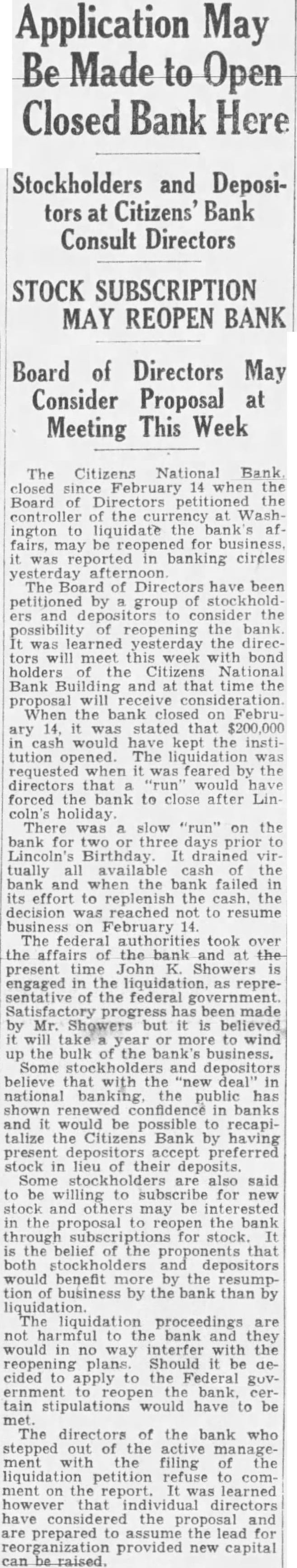 Application May Be Made to Open Closed Bank Here ... Stockholders and Depositors at Citizens Bank Consult Directors ... group may consider reopening the bank ... $200,000 would be kept the institution opened ... liquidation was requested ... slow run on the bank for three days prior Lincoln's Birthday drained available cash ... but at present John Showers engaged in the liquidation ... some stockholders and depositors think recapitalization might reopen bank (proposal). (Apr 2, 1933).