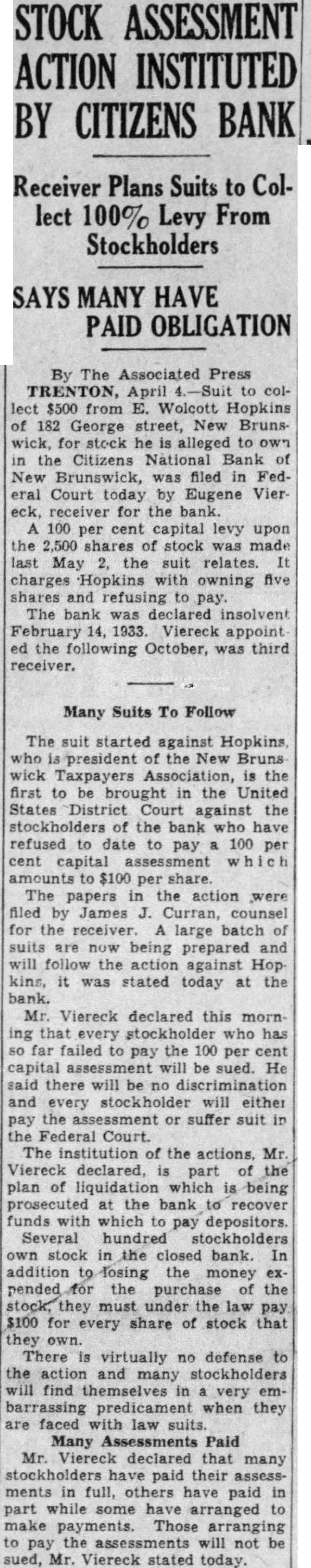 STOCK ASSESSMENT ACTION INSTITUTED BY CITIZENS BANK Receiver Plans Suits to Collect 100% Levy From Stockholders MANY HAVE PAID OBLIGATION By The Associated Press TRENTON, April $500 from Wolcott Hopkins 182 George street, New Brunswick, stock alleged the Citizens National Bank Brunswick, filed in FedCourt today by Eugene Vier receiver for the bank. 100 per cent capital levy upon the 2,500 shares stock made last May the suit relates. charges owning five shares The bank was insolvent Viereck appoint ed the October, third receiver. Many Suits To Follow The suit started against Hopkins, president the New Bruns Association, first to be brought the United States against stockholders of the bank have refused to date to pay 100 per $100 share. The papers the action were filed by James counsel for large batch suits being prepared and follow the against kins, was stated today the bank. Mr. Viereck declared this morn that far failed the per capital be sued. He will be and stockholder will either the assessment or suffer suit Federal Court. The institution the Mr. Viereck declared, part the plan liquidation which being prosecuted the bank recover funds which pay depositors. Several hundred stockholders stock the closed bank. addition losing the money pended the purchase must under the law pay $100 for every share of stock that There virtually no defense action and many stockholders find themselves very barrassing predicament when they faced law suits. Many Assessments Paid Mr. declared that many stockholders paid their assessments full, others paid while some arranged make payments. Those arranging to pay assessments not sued, Mr. Viereck stated today.