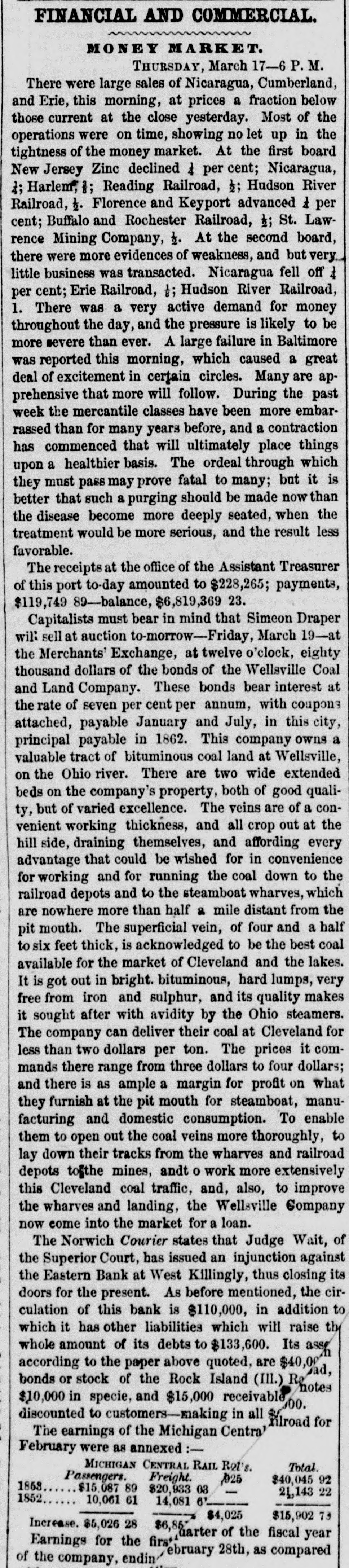 COMMERCIAL From our Commercial Correspondent. NEW YORK, March 15, 1853 The stringency of the money market, which was so com plained of last week among the stock speculators, is now far asparent, When the country is so full of capital, and so prosperous as now, a pressure soon works its own cure. The banks of New Pork city have for months been soliciting dealers to take their money for promises at low rates. They have induced many persons, by the facilities they have held out to them, to contract large obligations, and then suddenly discovered that they had loaned more than they possessed. Panic stricken, they turned suddenly round, demanding prompt payment for calls, loans, and matured paper, and rushed into the street to sell paper that was not matured The public paid up what was due, and private capital purchased the good paper that embarrassed cashiers offered. This process caused a rapid diminution in the line" of loans. Everybody paid; nobody failed-not even holders of faney stocks; the cashiers got over their panic, and begin to want those whom they have squeezed to borrow again of them. The manufacture of small notes for circulation has received some check in the failure of small batch owned by one W E. Chittenden, a broker. These were the Woodbury Bank of Connecticut, the Eastern Bank at West Killingly, and the Bank of East Tennessee. The owner of these banks stopped, and he sent word to the northern banks, that unless they aided him his banks must stop. A committee came down, and examined his assets. The circulation of the two first named was about $380,000, and he offered as security for assistance assets amounting to about $172,000. Of this, $10,000 was deemed good, besides about $20,000 of railroad bonds; consequently he stopped. These were not free banks," or secured notes, bus were irresponsible issues of paper, to circulate as money. This paper was put afloat in the western country through Chittenden and his agents for paying hard-working people on railroads, and industrious farmers for their produce. What was done with the pro ceeds of the notes put out does not appear, for there is noth+ ing to show for thein There are numerous other banks started in the eastern States for circulation at the West, and many banks which are good, and call themselves respectable, use indirect means to put out their paper the West This process of forcing paper monay into circulation is an evil which requires remedy, but which can be applied only by the entire withdrawal of all government countenance from paper money in any shape. These notes of Chittenden's never would have been palmed upon the western people, had not the State of Connecticut given them a stamp of legitimacy by granting them a charter. All the interests of society require that the independent treasury system of the federal government should be carried out and strictly enforced in all the States, requiring all State dues to be paid in specie, and refusing all countenance to paper issues. The spring business thus far has been in a high degree prosperous The current of exchanges has been in favor of the West and South during the winter, and that circumstance has enabled the dealers to make their appearance for the purchase of goods with ample means, and business continues remarkably brisk at firm rates for most goods Produce has, indeed, under the latest advices from abroad, been drooping for a few weeks, and among the dealers in is those articles, particularly cotton, flour, and pork, there less degree of buoyancy arising from the check given by the pause in speculation abroad The arrivals of gold will reach for March nearly five and a half millions, with an ex port of one million A. large portion of this will go into the interior in remittance for produce and railroad investments, as well as to those who have earned it in California. Its presence West and South can have no other result, however, than to vivify trade, and cause it ultimately to great profit. A specie curis the most profitable to the rency at the are eastern interest The products of the new States their means of baying what they most want. These are chiefly manufactured goods sil pplied from the East, specie for currency, and railroads and other means of communication. The goods purchased are generally consumed, and the want is renewed. It, however, instead of using paper for circulation, they invest several millions in the precious metals for a currency, necessarily, to that extent, are the purchases of goods curtailed and, moreover, after the cumulation of considerable specie, if admission is found bank notes, the specie will be driven out for the purchase of goods, and the eastern basiness enhanced while the specie lasts. The increase of specie South and West has been one cause of the bank difficulties on the seaboard during the past few weeks. The abundance of capital here continues, however, very great, and for desirable objects there is no lack of means. As an instance, there has been taken to-day one million dollars of the 10 per cent bonds of the great West ern railroad of Illinois by Messis Ketchum, Rogers, & Bement, of this city. It is understood that the whole was taken for themselves and clients, embracing the most influential mercantile firms in New York. This was during an alleged season of "tightness in the money market"that is to say, when stockjobbers, shinplaster banks, and financiers cannot borrow without security. At such a quack moment, however, a few of the merchants of New York subscribed million to a meritorious enterprise, as mat ter of course The great Western railroad of Illinois is one of he most important in the whole country, inasmuch as that it is the Illinois link in that directroute from New York towards the Pacific which is in process of construction to the Missouri river. The road was originally part of the great system of internal improvements adopted by Illinois in 1837. It was projected to run from Quincy, on the Mississipp