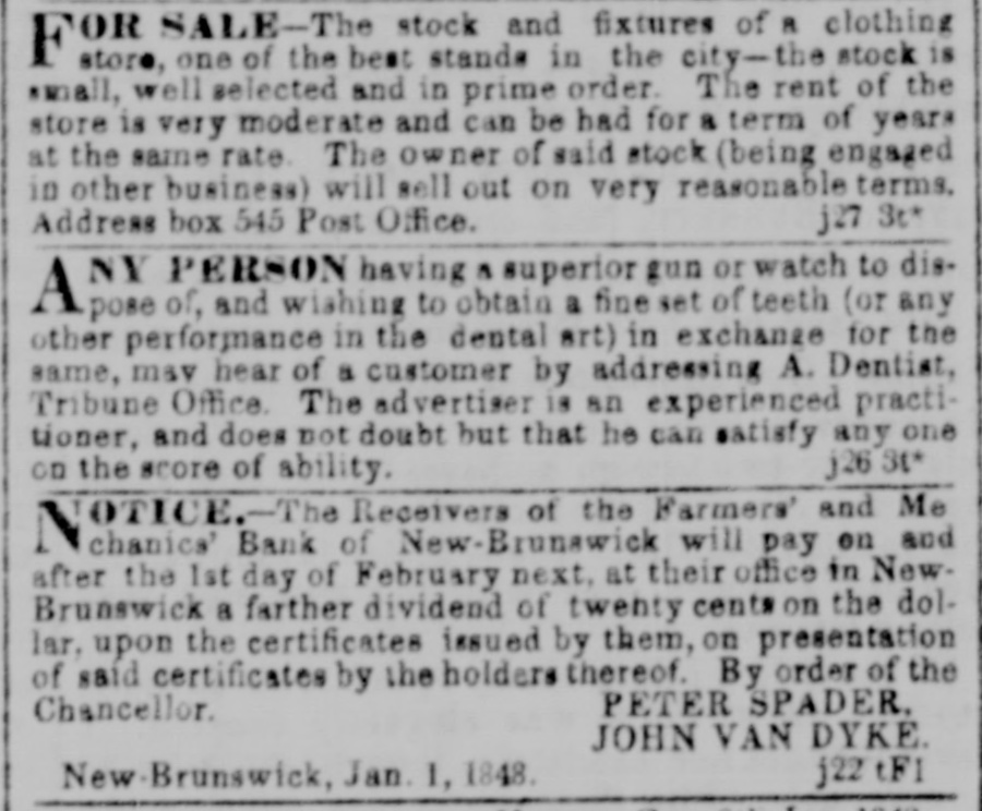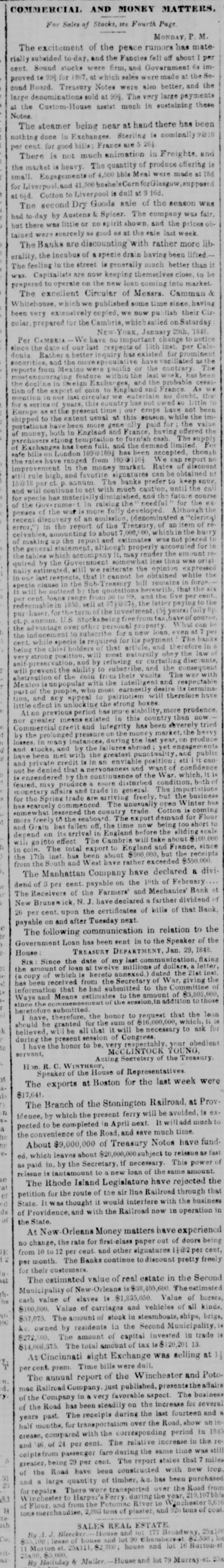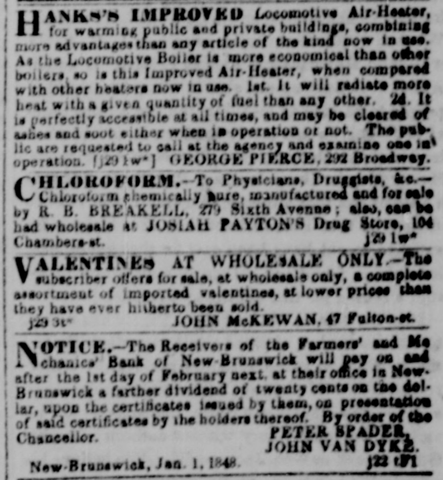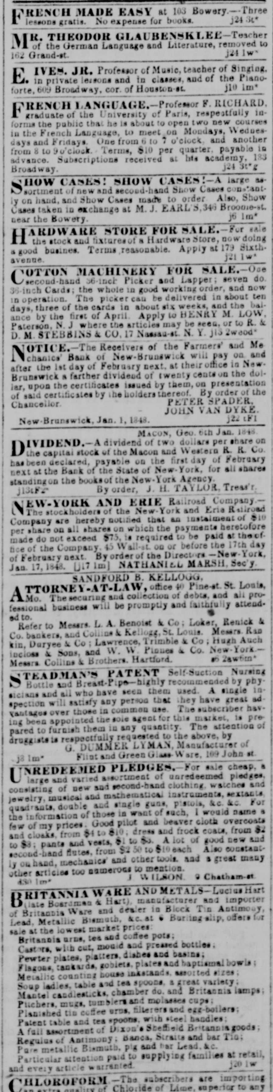 Bowery.--Three j24 3t* F RENCH lessons gratis. MADE No expense EASY for at books. 103 THEODOR GLAUBENSKLEE-Teacher to MR the German Language and Literature, removed j24 lw 162 Grand-st. IVES. JR. Professor of Music, teacher of Singing, PianoE. in private lessons and in classes, and of the 1m* j10 forte, 609 Broadway cor. of Houston-st. RENCH LANGUAGE.-Profemor F. RICHARD. inF graduate of the University of Paris, respectfully courses forms the public that he is about to open two new Wednesin the French Language, to meet on Mondays, another and Fridays. One from 6 to 7 o'clock and in days 8 to 9 o'clock Terms, 810 per quarter, payable 183 advance. from Subscriptions received at hts academy, j24 3t'g Broadway. HOW CASES: SHOW CASES!-A large as S sortment of newand second-hand Show Cases constant- Show ly on hand, and Show Cases made to order Also, Broome-st. Cases taken in exchange at M.J. EARL'S,346 j6 1m* near the Bowery. HARDWARE STORE FOR SALE. now doing For sale H the stock and fixtures of a Hardware Store, Sixtha good busines. Terms reasonable. Apply at 179 j21 lw* avenue. MACHINERY FOR SALE. seven Ose do. COFFEE 36-inck Picker and Lapper; 36-inch Cards; the whole in good working order, and now ten operation. The picker can be delivered in about bal. in three of the cards in about six weeks, and the days, by the first of April Apply to HENRY M. LOW, R. Paterson, ance N. where the articles may be seea, or to D. M. STEBBINS & CO. Namau-st N. jis 2wood OTICE. The Receivers of the Farmers' and Me and N chanica' Bank of New-Brunawick will pay on New the 1st day of February next. at their office in dolafter Brunswick a farther dividead of twenty cents on the the certificates issued by them, on presentation the of lar, said upon certificates by the holders thereof. By order of PETER SPADER, Chancellor JOHN VAN DYKE. j22tF1 New-Brunswick, Jan. 1, 1848. MACON, Geo. 6th Jan. 1848 IVIDEND. A dividend of two dollars per R. share R. Co. on capital stock of the Macon and Western has been declared, payable on the first day of February next the Bank of the State of New-York, for all shares standing on the books of the New. York Agency. By j13tF2 order, J. H. TAYLOR, Treas'r EW- YORK AND ERIE Railroad Company.- Railroad N The stockholders of the New-York and Eria of $10 are hereby notified that an instalment Company share on all shares on which the payments heretofore the of made per do not exceed $75, is required to be paid at of the Company 45 Wall-st. on or before the 17th day of tice February next. Byorder of the Directors New York, Jan. 17,1848. 017 1m] NATHANIEL MARSH, Sec'y SANDFORD B. KELLOGG, TTORNEY-AT-LAW, office 40 Pine-at St. all Louis, A The securing collection of debts, and professional business will be promptly and faithfully . attendad to. Refer to Messrs. L.A. Benoist & Co: Loker, Renick & bankers, and Collins & Kellogg, St. Louis. Mesars. Ran Co. Daryee & Co ; Lawrence, Trimble & Co; Hugh Auch inclose kin, & Sons, and W. W. Pignes & Co. New-York.80 2awfim Messra Collins & Brothers. Hartford TEADMAN'S PATENT Self-Suction Nursing Breast-Pipe-highly recommended by phy. and all who have seen them used. ad. inwill satisfy any person that sicians S spection Bottle and they have A single great havover those in common use. The subscriber vantages been appointed the sole agent for this market, is pre- of ing pared to furnish them in any quantity. The attention druggists is respectfully requested to the above, by G. DUMMER LYMAN, Manufacturer of Flint and Green Glass Ware, 109 John st. j8 Im* INREDEEMED PLEDGES. For sale cheap, a U large and varied assortment of unredeemed pledges, and consisting of new and second-band clothing watches musical and mathematical instruments, sextants, For jewelry, quadrants, double and single guns, pistols, &c. &c. information of those in want of such, I would name a Good pilot and beaver from $4 to 810; dress and frock coats, the few and cloaks. of my prices. A lot of cloth good overcosts from and 82 $8; pants and vests, $1 to su. new second-hand to flutes, from $2.50 10 each Also constantly hand, mechanical and other work and a great many other articies too numerous to u mention. ILSON g Chatham-st 430 Im* BRITANNIA WARE ANDMETALS-LuciusHart Bliate Boardman & Hart), manufacturer and importer of Britannia Ware and dealer in Block Tin Antimony, Lead, Metallic Bismuth, &c. at . Burling-slip, offers for sale at the lowest market prices Britannia arms, tea and coffee pots; Castors, with cut, mould and preased bottles Pewter plates, platters, dishes and basins; Flagons, tankards, zobiets, plates and baptismal bowls Metallic counting house inkstands, assorted sizes: Soup ladles, table and tea spoons a great variety Mantel candlesticks, chamber do. and Britannia lamps; Pitchers, mugs, tumbler and molasses cups; Planished tio coffee erus. filterers and egg-boilers; Patent table and tea spoons. with steel handles; A full assortment of Dixon's Sbeffield Britannia goods; Regulus of Antimony; Banca, Straits and bar Tio; Pare metallic Bismuth, pig and bar Lead. &c. Particular attention paid to supplying families at retail, j20 lw and every article warranted CHLOROFORM- subscribers are importing of Chloride of Lime, superior to any
