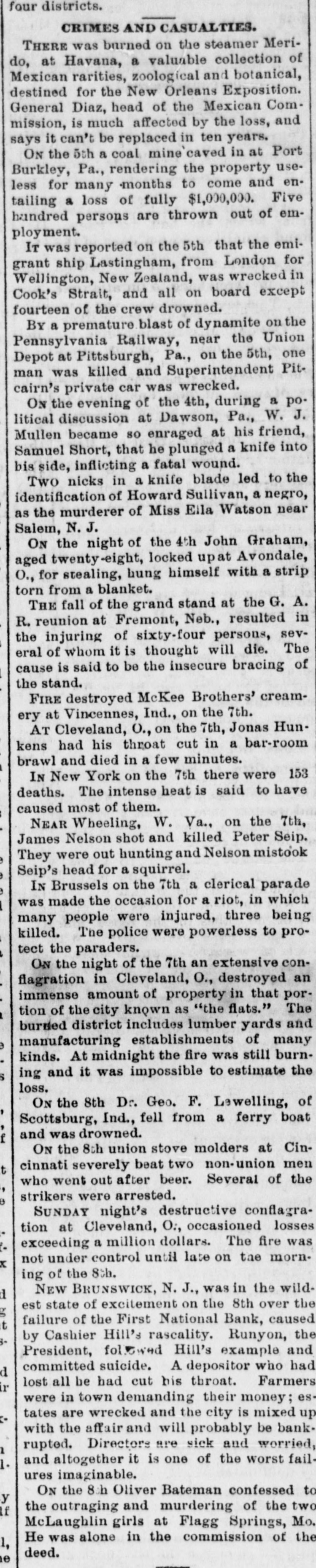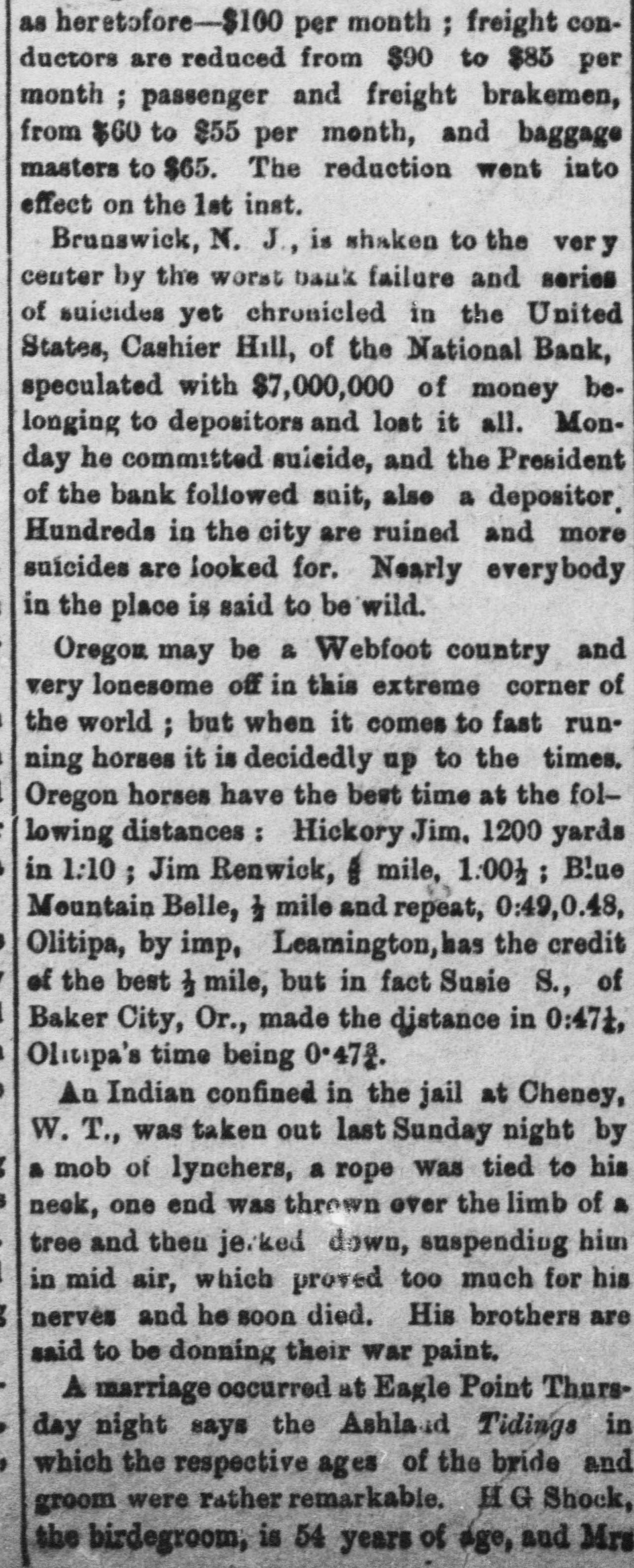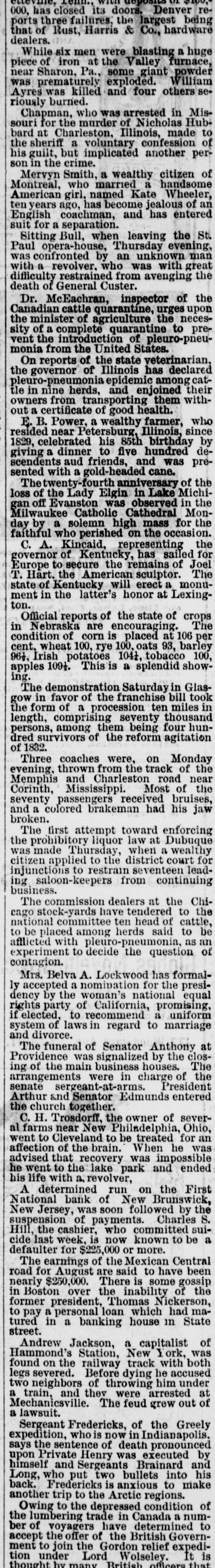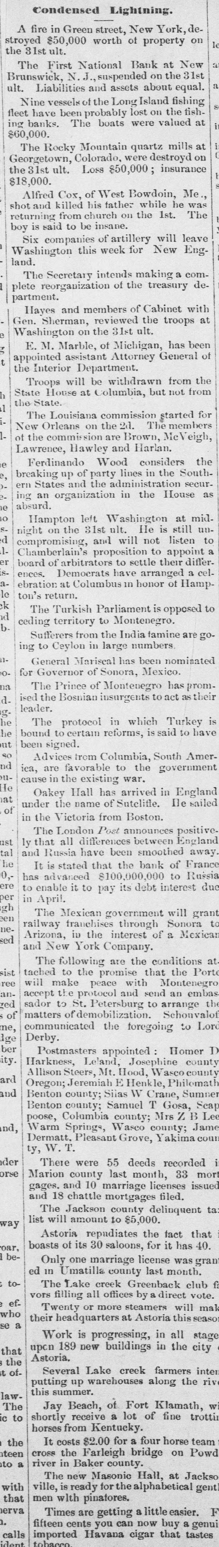 Condensed Lightning. A fire in Green street, New York, destroyed $50,000 worth of property on the 31st ult. The First National Bank at New Brunswick, N. suspended on the 31st ult. Liabilities and assets about equal. Nine vessels the Long Island fishing fleet have been probably lost on the fishing banks. The boats were valued at $60,000. The Rocky Mountain quartz mills at Georgetown, Colorado, were destroyd on the 31st ult. Loss $50,000 ; insurance $18,000. Alfred Cox, of West Bowdoin, Me shot and killed his father while he was returning from church on the 1st. The boy is said to be insane. Six companies of artillery will leave Washington this week for New England. The Secretary intends making a complete reorganization of the treasury department. Hayes and members of Cabinet with Gen. Sherman, reviewed the troops at Washington on the 31st ult. E. M. Marble, of Michigan, has been g appointed assistant Attorney General of t the Interior Department. Troops will be withdrawn from the State House at Columbia, but not from h the State. 1 The Louisiana commission started for New Orleans on the 2d. The members of the commission are Brown, McVeigh, Lawrence, Hawley and Harlan. Ferdinando Wood considers the e e, breaking up of party lines in the Southern States and the administration secur)eing an organization in the House as e absurd. o Hampton left Washington at mid. Snight on the 31st ult. He is still und compromising, and will not listen to 1. Chamberlain's proposition to appoint a en board of arbitrators to settle their differISences. Democrats have arranged a celaebration at Columbus in honor of Hample ton's return. ck The Turkish Parliament is opposed to d ceding territory to Montenegro. b. Sufferers from the India famine are going to Ceylon in large numbers. General Mariscal has been nominated Ofor Governor of Sonora, Mexico. na The Prince of Montenegro has promised the Bosnian insurgents to act as their d. leader. g. he The protocol in which Turkey is he bound to certain reforms, said to have ut been signed. so Advices from Columbia, South Amernd ica, are favorable to the government oucause in the existing war, He Oakey Hall has arrived in England at under the name of Satelifle. Ile sailed of in the Victoria from Boston. The London Post announces positivenst ly that all differences between England tal and Russia have been smoothed away he It is stated that the bank of France 0,has advanced $100,000,000 to Russia ere to enable it to pay its debt interest due per in April. gh The Mexican government will grant een railway franchises through Sonora to neArizona, in the interest of a Mexican sed and New York Company. The following are the conditions at sist tached to the promise that the Porte ree an embas anto red accept sador will make to the St. protocol Petersburg peace and with send arrange Montenegro the of matters of demobilization. Schonvalof me, communicated the foregoing to Lore Ige Derby. ber Postmasters appointed Homer D ity. Harkness, Leland, Josephine county ard and Summer Allison Steers, Benton Oregon;Jeremiah county; Mt. Siias Hood, Henkle, W Crane, Wasco county Philomath poose, Lee and, Benton Warm Columbia Springs, county; Samuel Wasco county; T county; Mrs Gosa, Jame Scap Dermatt. Pleasant Grove, Yakima cour ty, W. T. der There were 55 deeds recorded orse Marion county last month, 33 mort gages. and 10 marriage licenses issued and 18 chattle mortgages filed. The Jackson county delinquent ta: list will amount to $5,000. way Astoria repudiates the fact that oar, boasts of its 30 saloons, for it has 40. beOnly one marriage license was grant ed in Umatilla county last month. toThe Lake creek Greenback club vors filling all offices by: direct vote. efTwenty or more steamers will mak who their headquarters at Astoria this seaso: se a Work is progressing, in all stage upon 189 new buildings in the city that Astoria. the Several Lake creek farmers inter st ofputting up warehouses along the riv this summer. lawThe Jay Beach, of Fort Klamath, w ic to shortly receive a lot of fine trotti horses from Kentucky. the It costs $2.00 for a four horse team teen cross the Farleigh bridge on Powd to a river in Baker county. The new Masonic Hall, at Jackso with ville, is ready for the alphabetical gent that men with pinatores. erva F Times are getting a little easier. h. fifteen cents you can now buy a genui calls imported Havana cigar that tastes