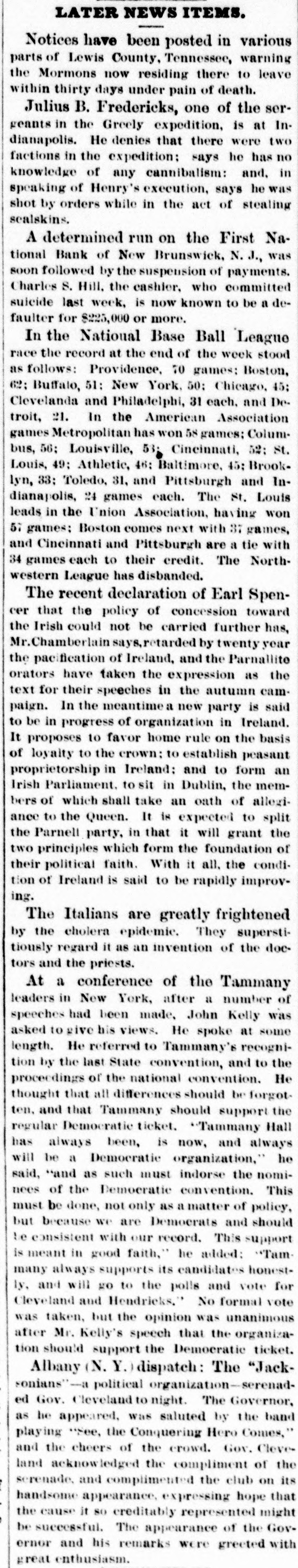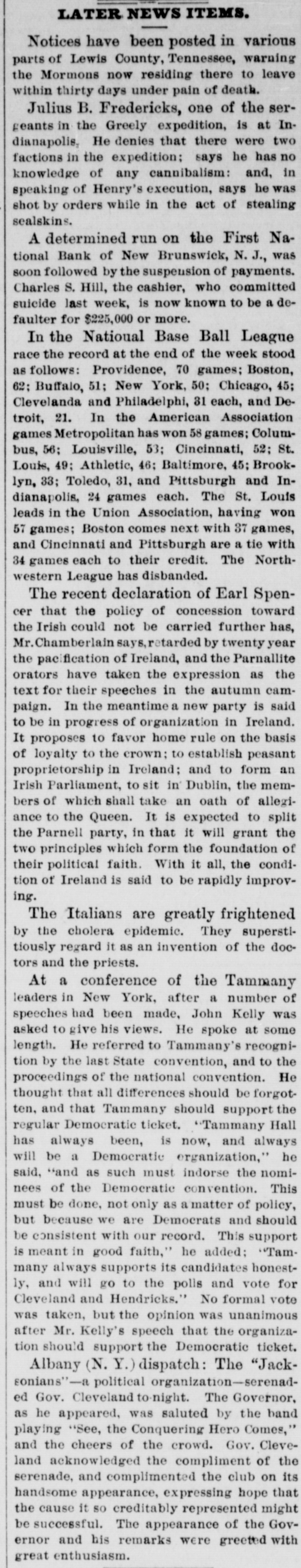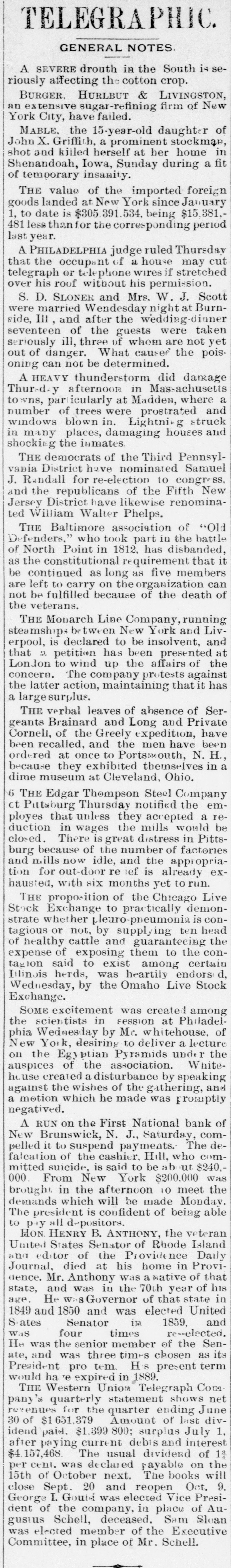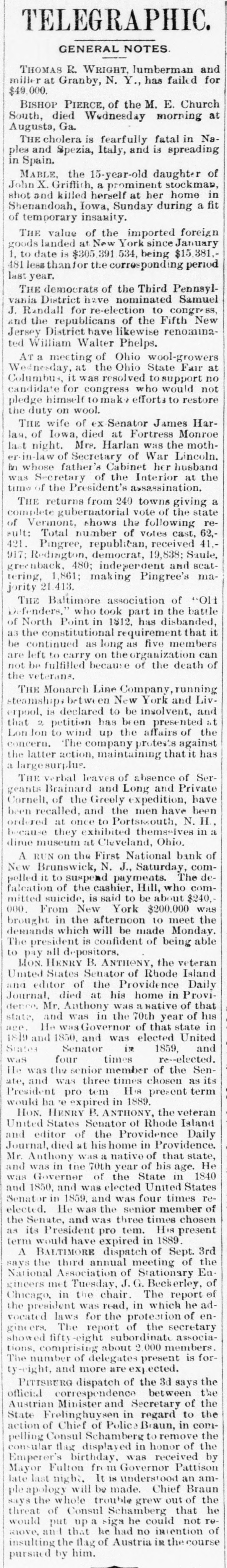 Condensed Lightning. A fire in Green street, New York, destroyed $50,000 worth of property on the 31st ult. The First National Bank at New Brunswick, N. suspended on the 31st ult. Liabilities and assets about equal. Nine vessels the Long Island fishing fleet have been probably lost on the fishing banks. The boats were valued at $60,000. The Rocky Mountain quartz mills at Georgetown, Colorado, were destroyd on the 31st ult. Loss $50,000 ; insurance $18,000. Alfred Cox, of West Bowdoin, Me shot and killed his father while he was returning from church on the 1st. The boy is said to be insane. Six companies of artillery will leave Washington this week for New England. The Secretary intends making a complete reorganization of the treasury department. Hayes and members of Cabinet with Gen. Sherman, reviewed the troops at Washington on the 31st ult. E. M. Marble, of Michigan, has been g appointed assistant Attorney General of t the Interior Department. Troops will be withdrawn from the State House at Columbia, but not from h the State. 1 The Louisiana commission started for New Orleans on the 2d. The members of the commission are Brown, McVeigh, Lawrence, Hawley and Harlan. Ferdinando Wood considers the e e, breaking up of party lines in the Southern States and the administration secur)eing an organization in the House as e absurd. o Hampton left Washington at mid. Snight on the 31st ult. He is still und compromising, and will not listen to 1. Chamberlain's proposition to appoint a en board of arbitrators to settle their differISences. Democrats have arranged a celaebration at Columbus in honor of Hample ton's return. ck The Turkish Parliament is opposed to d ceding territory to Montenegro. b. Sufferers from the India famine are going to Ceylon in large numbers. General Mariscal has been nominated Ofor Governor of Sonora, Mexico. na The Prince of Montenegro has promised the Bosnian insurgents to act as their d. leader. g. he The protocol in which Turkey is he bound to certain reforms, said to have ut been signed. so Advices from Columbia, South Amernd ica, are favorable to the government oucause in the existing war, He Oakey Hall has arrived in England at under the name of Satelifle. Ile sailed of in the Victoria from Boston. The London Post announces positivenst ly that all differences between England tal and Russia have been smoothed away he It is stated that the bank of France 0,has advanced $100,000,000 to Russia ere to enable it to pay its debt interest due per in April. gh The Mexican government will grant een railway franchises through Sonora to neArizona, in the interest of a Mexican sed and New York Company. The following are the conditions at sist tached to the promise that the Porte ree an embas anto red accept sador will make to the St. protocol Petersburg peace and with send arrange Montenegro the of matters of demobilization. Schonvalof me, communicated the foregoing to Lore Ige Derby. ber Postmasters appointed Homer D ity. Harkness, Leland, Josephine county ard and Summer Allison Steers, Benton Oregon;Jeremiah county; Mt. Siias Hood, Henkle, W Crane, Wasco county Philomath poose, Lee and, Benton Warm Columbia Springs, county; Samuel Wasco county; T county; Mrs Gosa, Jame Scap Dermatt. Pleasant Grove, Yakima cour ty, W. T. der There were 55 deeds recorded orse Marion county last month, 33 mort gages. and 10 marriage licenses issued and 18 chattle mortgages filed. The Jackson county delinquent ta: list will amount to $5,000. way Astoria repudiates the fact that oar, boasts of its 30 saloons, for it has 40. beOnly one marriage license was grant ed in Umatilla county last month. toThe Lake creek Greenback club vors filling all offices by: direct vote. efTwenty or more steamers will mak who their headquarters at Astoria this seaso: se a Work is progressing, in all stage upon 189 new buildings in the city that Astoria. the Several Lake creek farmers inter st ofputting up warehouses along the riv this summer. lawThe Jay Beach, of Fort Klamath, w ic to shortly receive a lot of fine trotti horses from Kentucky. the It costs $2.00 for a four horse team teen cross the Farleigh bridge on Powd to a river in Baker county. The new Masonic Hall, at Jackso with ville, is ready for the alphabetical gent that men with pinatores. erva F Times are getting a little easier. h. fifteen cents you can now buy a genui calls imported Havana cigar that tastes