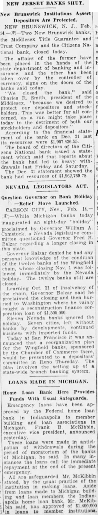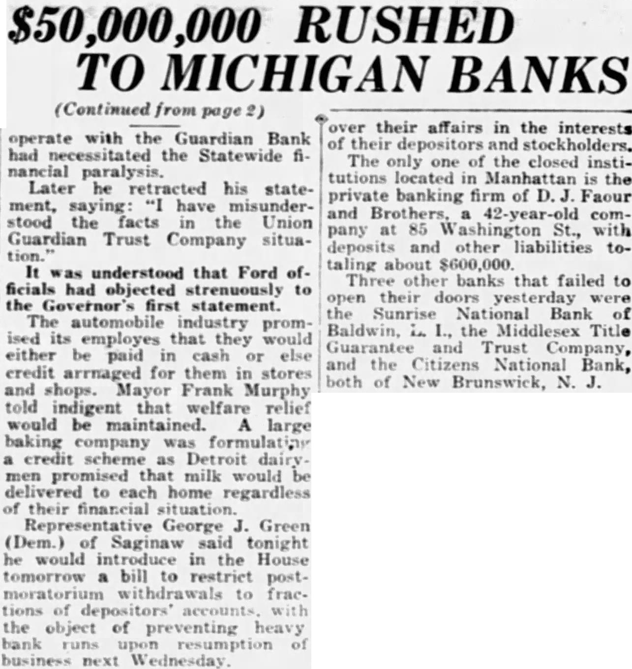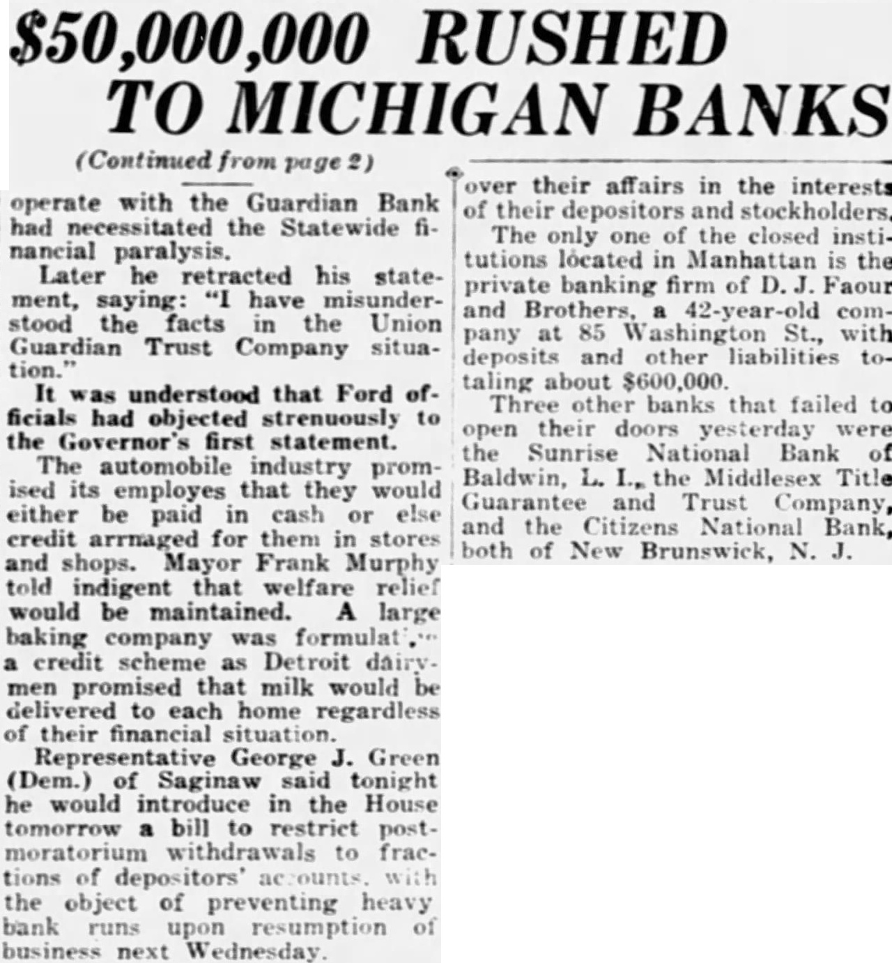 Conflict with Ford Cited. and shops. Mayor Frank Murphy told indigent that welfare relief would be maintained. A large baking company was formulating a credit scheme as Detroit dairymen promised that milk would be delivered to each home regardless of their financial situation. Representative George J. Green (Dem.) of Saginaw said tonight he would introduce in the House tomorrow a bill to restrict postmoratorium withdrawals to fractions of depositors' accounts. with the object of preventing heavy bank runs upon resumption of business next Wednesday.