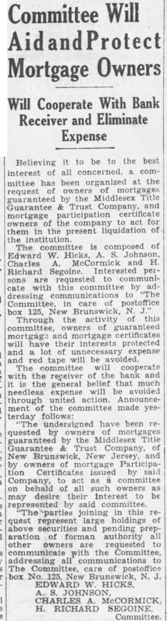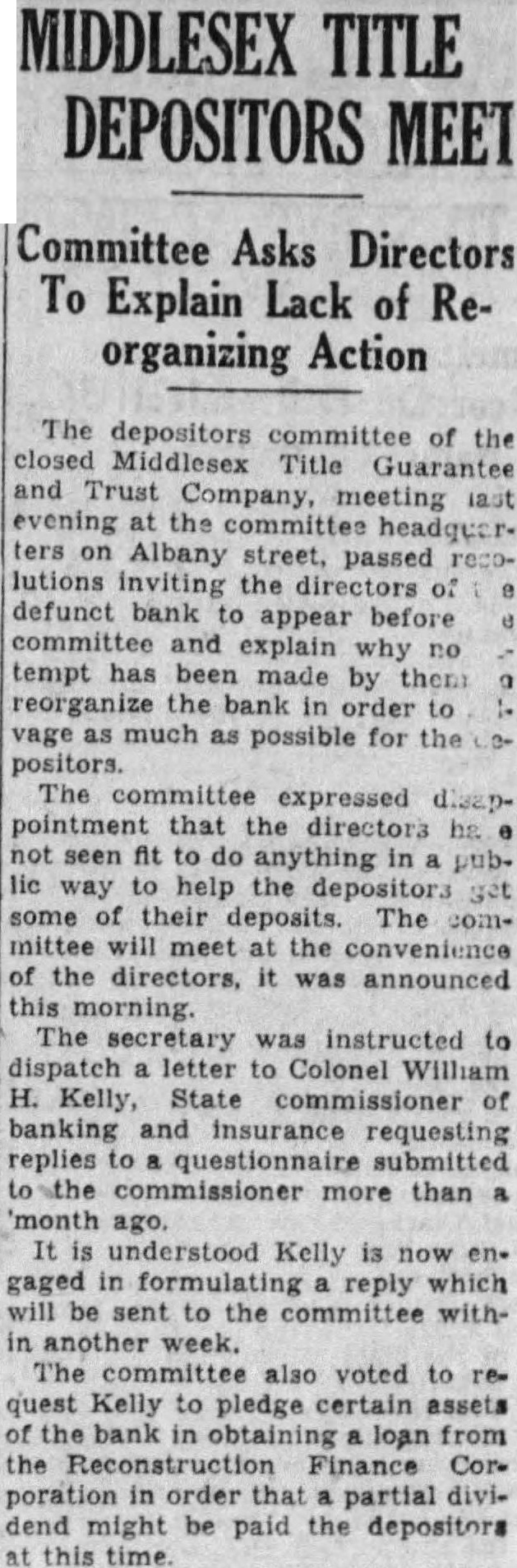 The request for the loan was by way of being granted, says the Free Press, when Senator Couzens protested that the collateral offered by the bank was inadequate to secure the Government from loss. The chief liquid asset listed was Ford's $7,100,000. Since Senator Couzens was chairman of the Senate committee charged with responsibility for investigating R. F. C. loans, his objections prevailed, the Free Press says. After an attempt to form a new company to take over the Unon Guardian Trust Co., Senator Couzens is quoted by the Free Press as having suggested to Ford that the motor magnet grant the Government a lien on his deposits in the bank, making them a "frozen deposit." This Ford declined to do. Senator Couzens then suggested that he and Ford jointly sign a note for the difference between the bank's collateral offered and the amount of the loan. Ford declined to adopt this plan, the Free Press says, holding that there was a "basic principle involved." Senator Couzens conferred with President Hoover, the paper's account says, and was requested by him to accede to the R. F. C. loan. Early this week R. F. C. representatives and prominent bankers were called here.