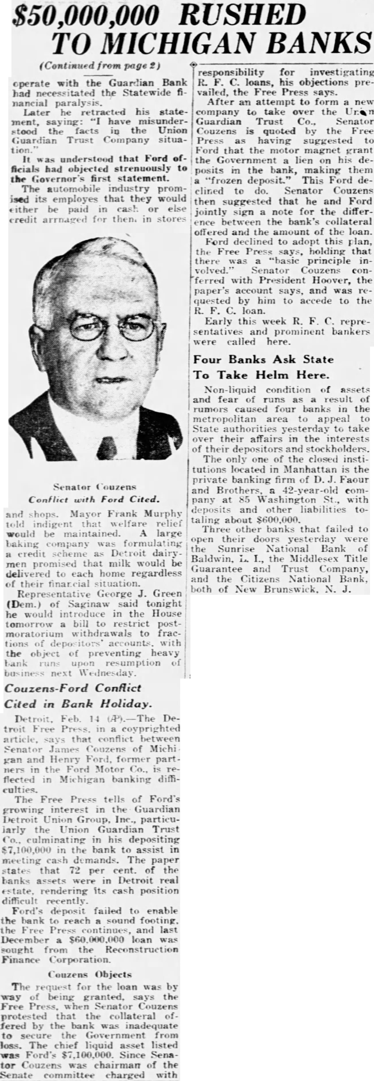 Detroit, Feb. 14 (P).-The Detroit Free Press. in a coyprighted article, says that conflict between Senator James Couzens of Michi gan and Henry Ford, former partners in the Ford Motor Co., is reflected in Michigan banking difficulties. The Free Press tells of Ford's growing interest in the Guardian Detroit Union Group, Inc., particularly the Union Guardian Trust Co., culminating in his depositing $7,100,000 in the bank to assist in meeting cash demands. The paper states that 72 per cent. of the banks assets were in Detroit real estate, rendering its cash position difficult recently. Ford's deposit failed to enable the bank to reach a sound footing, the Free Press continues, and last December a $60,000,000 loan was sought from the Reconstruction Finance Corporation.
