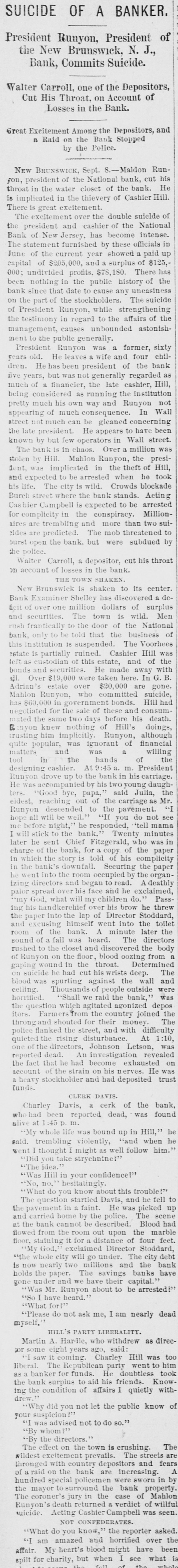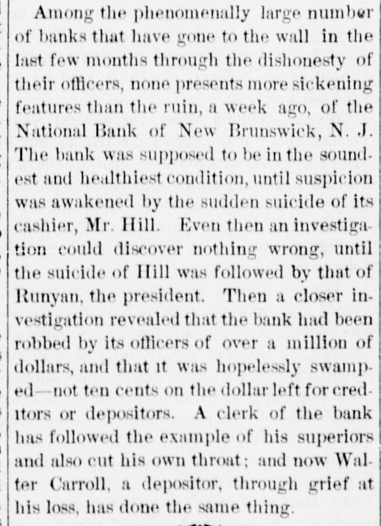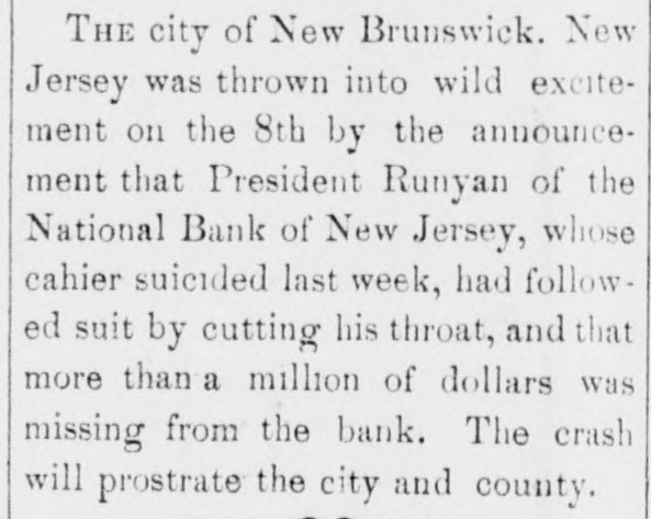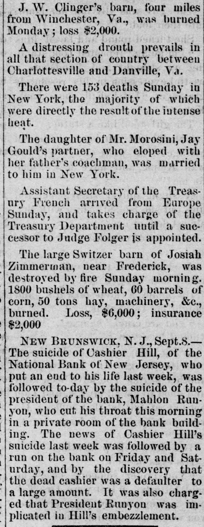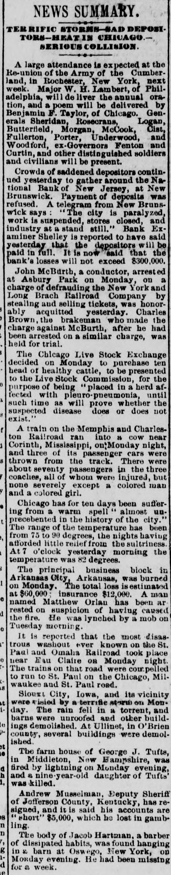 NEWS SUMMARY. TERRIFIC STORMS SAD DEPOSITORN-HEATI CHICAGO.SERIOUS COLLISION. A large attendance is expected at the Re-union of the Army of the Cumberland, in Rochester, New York next week. Major W. H. Lambert, of Philadelphia, will de liver the annual oration, and a poem will be delivered by Benjamin F. Taylor, of Chicago. Generals Sheridan, Rosecrans, Logan, Butterfield, Morgan, McCook, Cist, Fullerton, Porter, Underwood, and Woodford, ex-Governors Fenton and Curtin, and other distinguished soldiers and civilians will be present. Crowds of saddened depositors continued yesterday to gather around the Na tional Bank of New Jersey, at New Brunswick. Payment of deposits was refused. A telegram from New Brunswick says 'The city is paralyzed, work is suspended, stores closed, and industry at a stand still." Bank Examiner Shelley is reported to have said yesterday that the depositors will be paid in full. It is now said that the bank's losses will not exceed $300,000. John McBurth, a conductor, arrested a at Asbury Park on Monday, on charge of defrauding the New York and Long Brach Railroad Company by stealing and selling tickets, was honorably acquitted yesterday. Charles Brown, the brakeman who made the charge against McBurth, after he had been arrested on a similar charge, was held for trial. The Chicago Live Stock Exchange decided on Monday to purchase ten head of healthy cattle, to be presented to the Live Stock Commission, for the purpose of being "placed in a herd affected with pleuro-pneumonia, until such time as will prove whether the suspected disease does or does not exist.' f A train on the Memphis and Charleston Rai!road ran into a cow near d Corinth, Mississippi, ontMonday night, and three of its passenger cars were thrown from the track. There were about seventy passengers in the three coaches, all of whom were injured, but none severely except a colored man and a colored girl. Chicago has for ten days been suffering from a warm spell " almost unprecebented in the history of the city." The range of the temperature has been from 75 to 90 degrees, the nights having afforded little relief from the sultriness. At 7 o'clock yesterday morning the temperature was 82 degrees. The principal business block in Arkansas City, Arkansas, was burned on Monday. The total loss is estimated at $60,000 insurance $12,000. A man e named Matthew Orlan has been ar rested on suspicion of having caused the fire. He was lynched by a mob on Tuesday morning. e It is reported that the most disastrous washout ever known on the St. Paul and Omaha Railroad took place e near Fau Claire OH Monday night. The trains on that road were compelled to run to St. Paul on the Chicago, Milwaukee and St. Paul road. 8 Sioux City, Iowa, and its vicinity at were visied by a terrific storm on Mon. 1. day. The rain fell in a torrent, and barns were unroofed and other buildto ings demolished. At Ullinet, in O'Brien pcounty, several buildings were demolished. et 10 The farm house of George J. Tufts, in Middleton, New Hampshire, was d fired by lightning on Monday evening, h and a year-old daughter of Tufts 1, was killed. Andrew Musselman, Deputy Sheriff of Jefferson County, Kentucky, has resigned, and it is said his accounts are 8 ehort' $5,000, which he lost in gambn ling. n The body of Jacob Hartman. a barber 7, of dissipated habits, was found hanging g in & barn at Oswego, New York, on 1Monday evening. He had been missing d for a week.