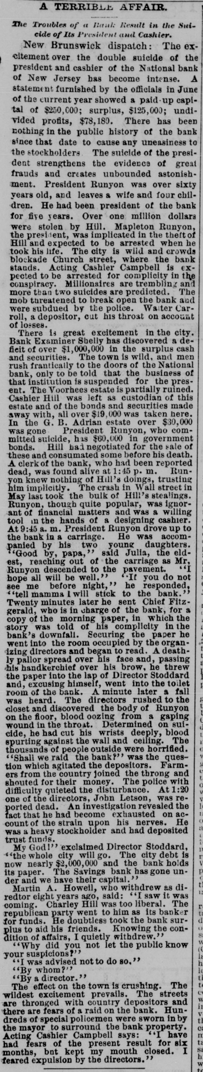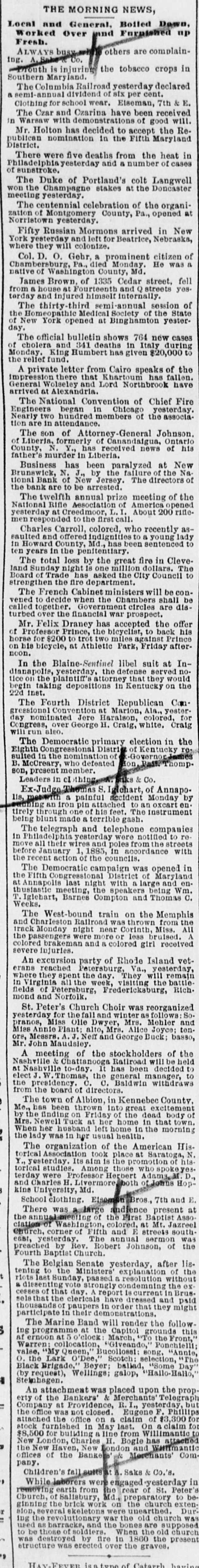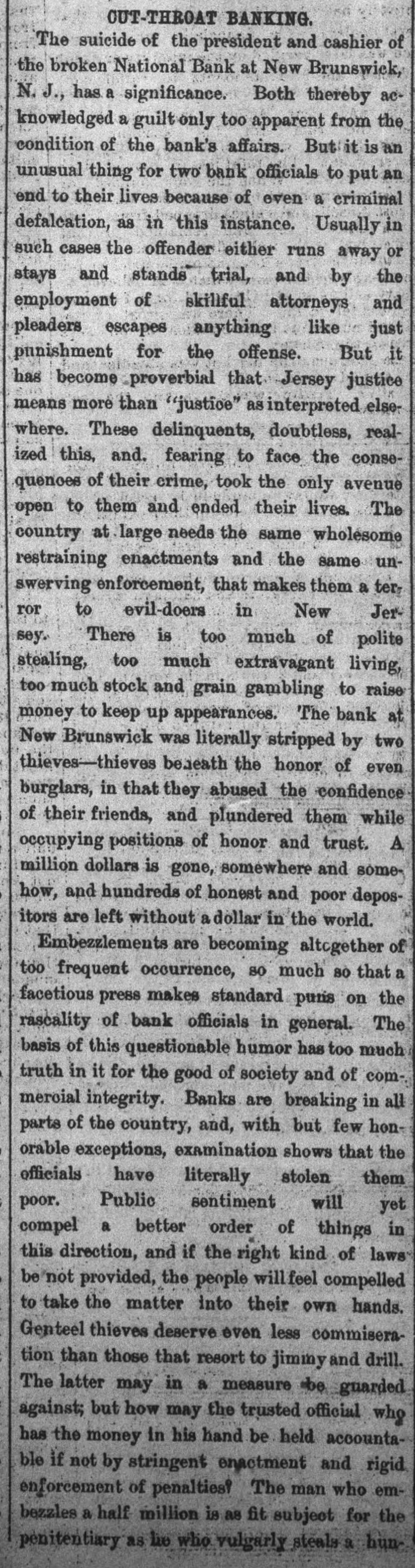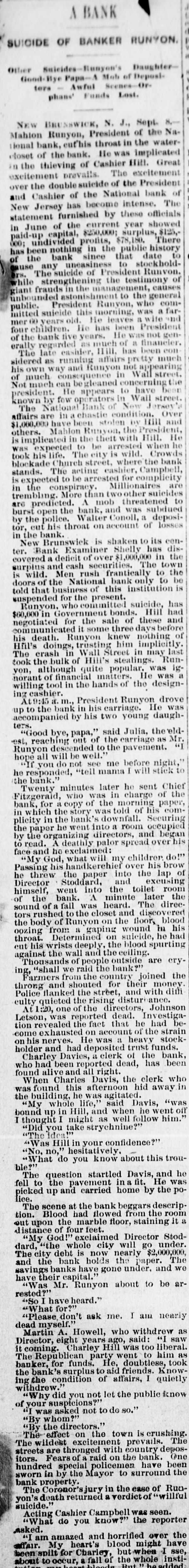 NEWS SUMMARY. TERRIFIC STORMS SAD DEPOSITORN-HEATI CHICAGO.SERIOUS COLLISION. A large attendance is expected at the Re-union of the Army of the Cumberland, in Rochester, New York next week. Major W. H. Lambert, of Philadelphia, will de liver the annual oration, and a poem will be delivered by Benjamin F. Taylor, of Chicago. Generals Sheridan, Rosecrans, Logan, Butterfield, Morgan, McCook, Cist, Fullerton, Porter, Underwood, and Woodford, ex-Governors Fenton and Curtin, and other distinguished soldiers and civilians will be present. Crowds of saddened depositors continued yesterday to gather around the Na tional Bank of New Jersey, at New Brunswick. Payment of deposits was refused. A telegram from New Brunswick says 'The city is paralyzed, work is suspended, stores closed, and industry at a stand still." Bank Examiner Shelley is reported to have said yesterday that the depositors will be paid in full. It is now said that the bank's losses will not exceed $300,000. John McBurth, a conductor, arrested a at Asbury Park on Monday, on charge of defrauding the New York and Long Brach Railroad Company by stealing and selling tickets, was honorably acquitted yesterday. Charles Brown, the brakeman who made the charge against McBurth, after he had been arrested on a similar charge, was held for trial. The Chicago Live Stock Exchange decided on Monday to purchase ten head of healthy cattle, to be presented to the Live Stock Commission, for the purpose of being "placed in a herd affected with pleuro-pneumonia, until such time as will prove whether the suspected disease does or does not exist.' f A train on the Memphis and Charleston Rai!road ran into a cow near d Corinth, Mississippi, ontMonday night, and three of its passenger cars were thrown from the track. There were about seventy passengers in the three coaches, all of whom were injured, but none severely except a colored man and a colored girl. Chicago has for ten days been suffering from a warm spell " almost unprecebented in the history of the city." The range of the temperature has been from 75 to 90 degrees, the nights having afforded little relief from the sultriness. At 7 o'clock yesterday morning the temperature was 82 degrees. The principal business block in Arkansas City, Arkansas, was burned on Monday. The total loss is estimated at $60,000 insurance $12,000. A man e named Matthew Orlan has been ar rested on suspicion of having caused the fire. He was lynched by a mob on Tuesday morning. e It is reported that the most disastrous washout ever known on the St. Paul and Omaha Railroad took place e near Fau Claire OH Monday night. The trains on that road were compelled to run to St. Paul on the Chicago, Milwaukee and St. Paul road. 8 Sioux City, Iowa, and its vicinity at were visied by a terrific storm on Mon. 1. day. The rain fell in a torrent, and barns were unroofed and other buildto ings demolished. At Ullinet, in O'Brien pcounty, several buildings were demolished. et 10 The farm house of George J. Tufts, in Middleton, New Hampshire, was d fired by lightning on Monday evening, h and a year-old daughter of Tufts 1, was killed. Andrew Musselman, Deputy Sheriff of Jefferson County, Kentucky, has resigned, and it is said his accounts are 8 ehort' $5,000, which he lost in gambn ling. n The body of Jacob Hartman. a barber 7, of dissipated habits, was found hanging g in & barn at Oswego, New York, on 1Monday evening. He had been missing d for a week.