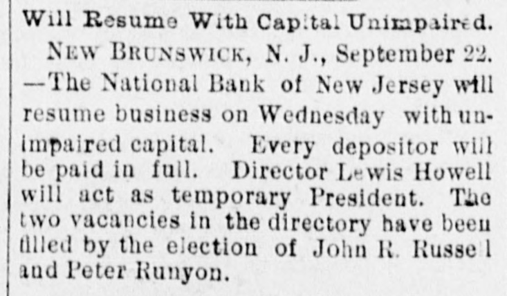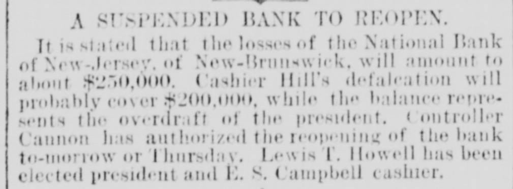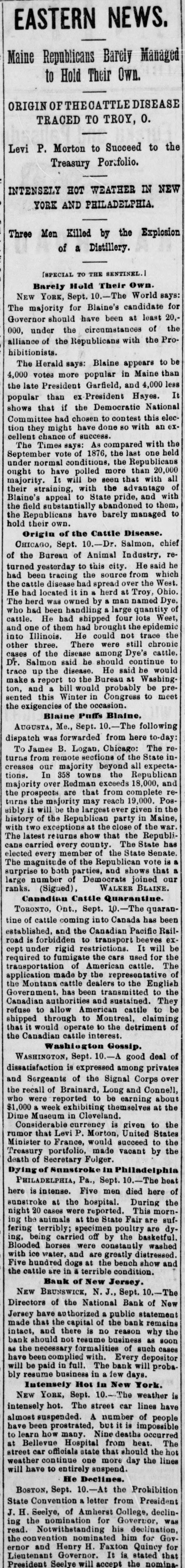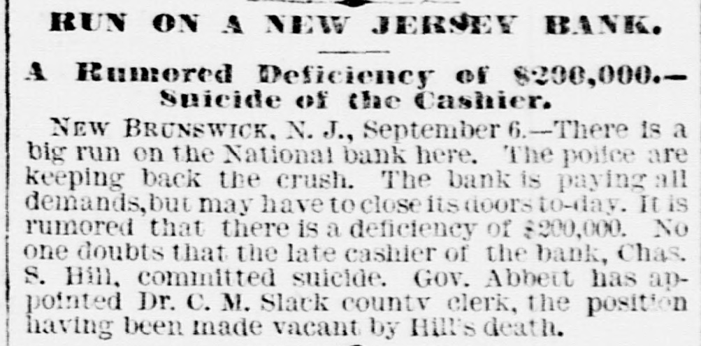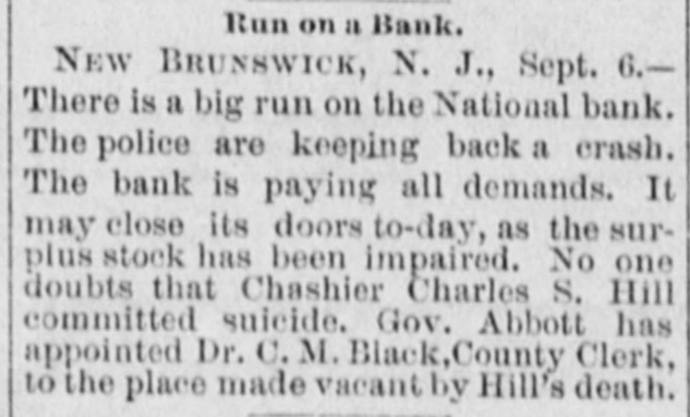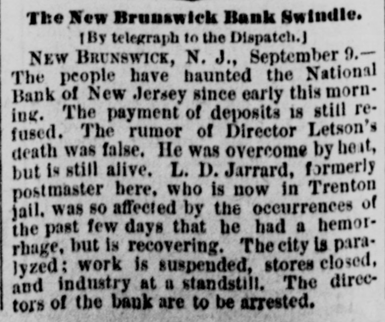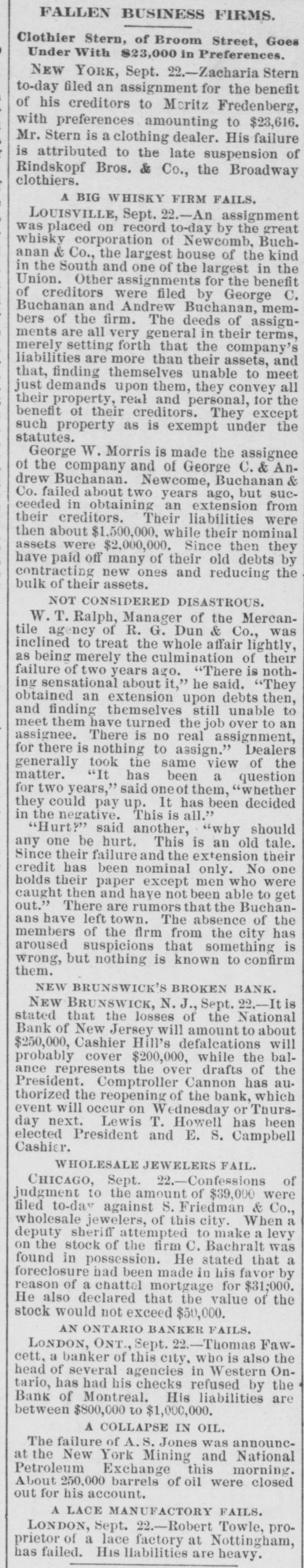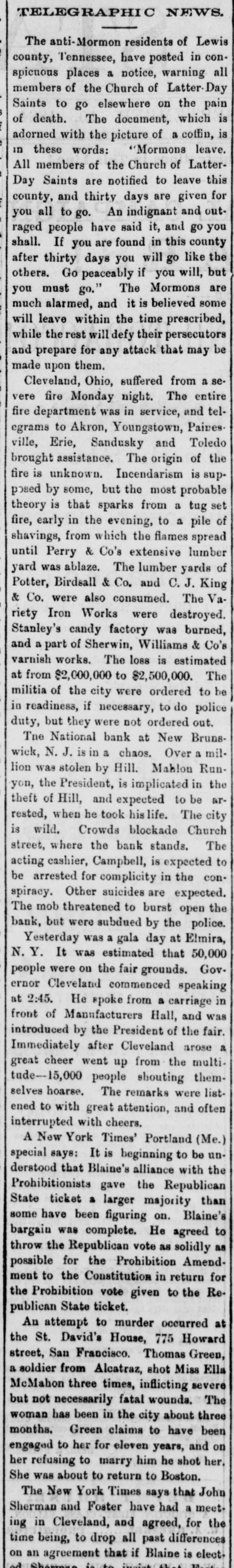 NEWS SUMMARY. TERRIFIC STORMS SAD DEPOSITORN-HEATI CHICAGO.SERIOUS COLLISION. A large attendance is expected at the Re-union of the Army of the Cumberland, in Rochester, New York next week. Major W. H. Lambert, of Philadelphia, will de liver the annual oration, and a poem will be delivered by Benjamin F. Taylor, of Chicago. Generals Sheridan, Rosecrans, Logan, Butterfield, Morgan, McCook, Cist, Fullerton, Porter, Underwood, and Woodford, ex-Governors Fenton and Curtin, and other distinguished soldiers and civilians will be present. Crowds of saddened depositors continued yesterday to gather around the Na tional Bank of New Jersey, at New Brunswick. Payment of deposits was refused. A telegram from New Brunswick says 'The city is paralyzed, work is suspended, stores closed, and industry at a stand still." Bank Examiner Shelley is reported to have said yesterday that the depositors will be paid in full. It is now said that the bank's losses will not exceed $300,000. John McBurth, a conductor, arrested a at Asbury Park on Monday, on charge of defrauding the New York and Long Brach Railroad Company by stealing and selling tickets, was honorably acquitted yesterday. Charles Brown, the brakeman who made the charge against McBurth, after he had been arrested on a similar charge, was held for trial. The Chicago Live Stock Exchange decided on Monday to purchase ten head of healthy cattle, to be presented to the Live Stock Commission, for the purpose of being "placed in a herd affected with pleuro-pneumonia, until such time as will prove whether the suspected disease does or does not exist.' f A train on the Memphis and Charleston Rai!road ran into a cow near d Corinth, Mississippi, ontMonday night, and three of its passenger cars were thrown from the track. There were about seventy passengers in the three coaches, all of whom were injured, but none severely except a colored man and a colored girl. Chicago has for ten days been suffering from a warm spell " almost unprecebented in the history of the city." The range of the temperature has been from 75 to 90 degrees, the nights having afforded little relief from the sultriness. At 7 o'clock yesterday morning the temperature was 82 degrees. The principal business block in Arkansas City, Arkansas, was burned on Monday. The total loss is estimated at $60,000 insurance $12,000. A man e named Matthew Orlan has been ar rested on suspicion of having caused the fire. He was lynched by a mob on Tuesday morning. e It is reported that the most disastrous washout ever known on the St. Paul and Omaha Railroad took place e near Fau Claire OH Monday night. The trains on that road were compelled to run to St. Paul on the Chicago, Milwaukee and St. Paul road. 8 Sioux City, Iowa, and its vicinity at were visied by a terrific storm on Mon. 1. day. The rain fell in a torrent, and barns were unroofed and other buildto ings demolished. At Ullinet, in O'Brien pcounty, several buildings were demolished. et 10 The farm house of George J. Tufts, in Middleton, New Hampshire, was d fired by lightning on Monday evening, h and a year-old daughter of Tufts 1, was killed. Andrew Musselman, Deputy Sheriff of Jefferson County, Kentucky, has resigned, and it is said his accounts are 8 ehort' $5,000, which he lost in gambn ling. n The body of Jacob Hartman. a barber 7, of dissipated habits, was found hanging g in & barn at Oswego, New York, on 1Monday evening. He had been missing d for a week.