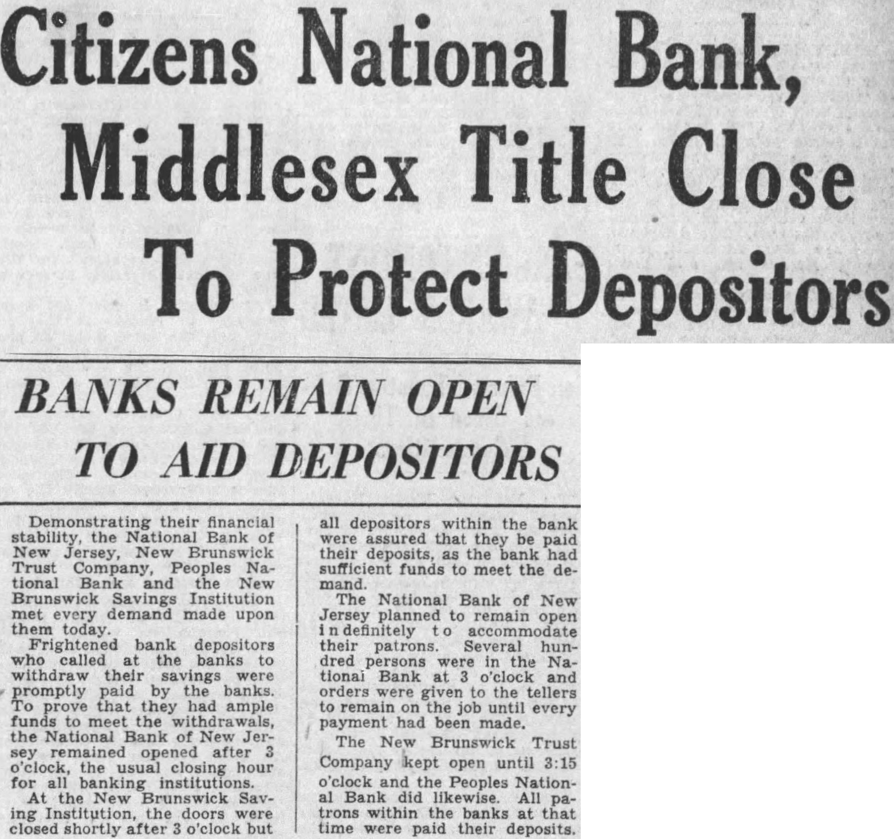 Citizens National Bank, Middlesex Title Close To Protect Depositors BANKS REMAIN OPEN TO AID DEPOSITORS their financial stability the New New Trust Company Peoples National Bank and Brunswick Savings Institution every demand made upon them today. Frightened bank depositors called banks withdraw savings promptly paid by the banks. To that they had ample funds to meet the the National Bank of New remained after the closing for New Brunswick Saving doors closed shortly after o'clock but all depositors within the bank assured that they be paid their the funds meet the demand The National Bank of New Jersey planned remain open definitely their patrons. Several dred persons in the Nationai Bank orders the tellers remain the job until every payment had made. The New Brunswick Trust Company kept open until 3:15 o'clock and Peoples NationBank did likewise. All trons within the banks time were paid their deposits.