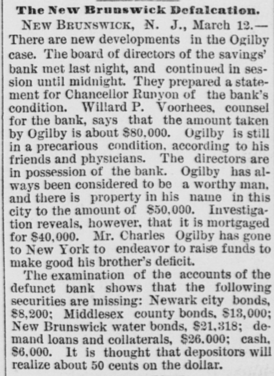 OGILBYS DEFALCATION. AMOUNT OF HIS SHORTAGE $74,518. DEPOSITORS EXPECT TO GET 50 PER CENT-WHAT BECAME OF THE STOLEN FUNDS. [BY TELEGRAPH TO THE TRIBUNE.] NEW-BRUNSWICK, N.J., March 12.-The managers of the Dime Savings Bank held a meeting last night which lasted until 2 o'clock this morning. They were busy upon the statement required by Chancellor Runyon, and this morning they had It so far completed that it was submitted to Darby Randall, am expert accountant, for revision before being forwarded to the accountant. W. P. Voorhees, counsel for the bank and one of the managers, said that although the statement would not be given to the public previous to sending it to the Chancellor, it would show that cash and securities were missing as follows: Newark City bonds, $8,200; Middlesex County bonds, $13,000; New-Brunswick water bonds, $21,318 50; demand loans, and collaterals, $26,000; cash, $6,000. Total, $74,518.50. According to the unproved statement of Mr. Ogilby, published on February 3, the assets of the bank amounted to $170,308 59. Taking from this $74,518 50, the amount of Ogilby's shortage, leaves $95,790.09 to be divided among the 1,850 depositors, leaving them $70,961 66 short. The assets as they now appear will pay out about 50 per cent. Mr. Voorhees is now engaged in working up Mr. Ogilby's real estate, consisting of houses and blocks of building lots in various parts of the city. This property is all known to be mortgaged to a greater or less extent, but there is every reason to believe that it will realize something. The house in which Mr. Ogilby lives which is worth about $13.000 is the property of his wife, being a legacy to her from a deceased relative The absorbing question in this city to-day has been : " What did Ogilby do with the money 1" All of the managers have been talked with upon this subject during the day and have only one answer. He must have raised it to make up a shortage somewhere etse. The old story of the stock syndicate of which Charley Hill, the cashier of the New-Jersey National Bank, who killed himself during a financial explosion nearly two years ago, was the head and front,is now brought up, and It is said that Mr. Ogilby sank nearly $25,000 in that pool that this disaster has been dragging him down ever since, and that he robbed the bank to free himself from this incubus. Rumor also stated that Mr. Ogilby had been a heavy card player in a club-house in this city, but this was exploded. The general impression is that the money was lost in recent stock speculation, though Mr. Ogilby said to City Collector Warner a few days ago that he had never risked a dollar on a margin in his life. Mr. Langdon, ex-president of the bank. said this morning: The New-York papers have misrepresented me in saying that I resigned the presidency and left the management because I was dissatis fied with the way in which the bank was conducted. I was perfectly satisfied but my duties as superintendent of the New-BrunswickRubber Company are enormous, and my health is not of the best. am no longer connected with the institution. If. however, the friends of Mr. Ogilby come to me in their effort to make up his difficiency I shall consider myself bound, out of consideration for the depositors, to help them." The friends of Mr. Ogilby are sanguine that' they can raise the money to meet bis defalcation. This afternoon they claimed to have $42,000, with best hopes of securing the balance among his many friends here and in New-York 1n a few days. Tais morning Assistant Secretary Wycoff opened the bank at the usual hour, though he has dona nothing all day but answer questions. Mr. Wycoff has charge of the property under order of the Chancellor. A number of persons have valuable papers and securities deposited in the bank, among themthe estate of William G. Parsons. There has been no rush of depositors today, but several have called and demanded their money, getting the usual answer from Mr. Wycoft : I'll put your name down, and you may get your money in thirty or sixty days, under the rules, but I cannot say positively that you will get it even then." T e defalcation of Mr. Ogilby has made a slight flutter among the depositors of the New-Brunswick Savings Institution, and a number of small depositors have drawn out amounts of from $100 to $300. one man taking a little over $5,000. The whole amount taken out y sterday and to-day 18 about $20,000. This affects the Savings Institution pleasantly rather than otherwise, as they thusget rid of that much of their $125,000 eurplus, which they cannot invest without having to pay the July interest on it. Dr. A. Van Nest Baldwin said this afternoon that he had not seen Mr. Ogilby personally since last Monday, but his father has seen him yesterday morning and he was then easier. He had himself been called yesterday to see Mrs. Ogilby, who 18 reported ill, and he was told that Mr. Ogliby was resting easier. All callers who are not known as intimate friends of the family are denied admission to the house. The largest depositor has $4,000 in peril, and the others sums varying from $5 to $1,600. The Rev. Dr. T. C. Easton, who has just left the First Reformed Church for the First Reformed Church, of Newark, has $250 locked up in the bank.