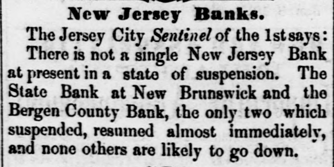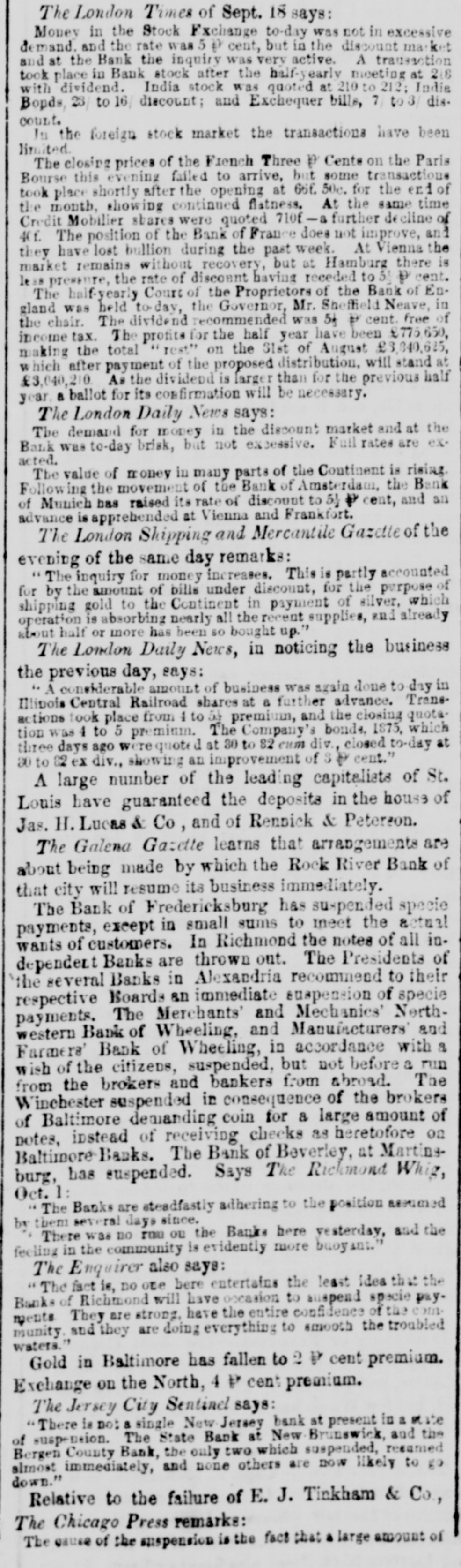 The London Times of Sept. 18 says: Money in the Stock Exchange to-day was not in excessive demand. and the rate was ₽ cent, but in the discount ma and at the Bank the inquiry was very active. A transaction took place in Bank stock after the half-yearly meeting at 218 with dividend. India stock was quoted at 210 to 212; India Bopds, 23 to 16 discount; and Exchequer bills, 7 to 3 dis. COULT. In the foreign stock market the transactions have been limited The closing prices of the French Three p Cente on the Paris Bourse this evening failed to arrive, but some transactions took place shortly after the opening at 66f. 50c. for the end of the month, showing continued flatness. At the same time Credit Mobilier shares were quoted 710f-a further decline of 40f. The position of the Bank of France does not improve, and they have lost bullion during the past week. At Vienna the market remains without recovery, but at Hamburg there is less pressure, the rate of discount having receded to 5 p cent. The half-yearly Court of the Proprietors of the Bank of England was held to day, the Governor, Mr. Sheffield Neave, in the chair. The dividend recommended was 5A P cent. free of income tax. The profits for the half year have been £775,650, making the total rest" on the S1st of August £3,840,625, which after payment of the proposed distribution, will stand at £3,040,210 As the dividedd is larger than for the previous half year. a ballot for its confirmation will be necessary. The London Daily News says: The demand for money in the discount market and at the Bank was to-day brisk, but not excessive. Full rates are ex. acted. The value of money in many parts of the Continent is rising. Following the movement of the Bank of Amsterdam, the Bank of Munich has raised its rate of discount to 5) P cent, and an advance is apprehended at Vienna and Frankfort. The London Shipping and Mercantile Gazette of the evening of the same day remarks: The inquiry for money increases. This is partly accounted for by the amount of bills under discount, for the purpose of shipping gold to the Continent in payment of silver, which operation is absorbing nearly all the recent supplies, and already about half or more has been so bought up." The London Daily News, in noticing the business the previous day, says: A considerable amount of business was again done to day in Illipois Central Railroad shares at a further advance. Transactions took place from 4 to 5th premium, and the closing quota tion was to 5 premium. The Company's bonds. 1875, which three days ago were quoted at 30 to 82 cum div., closed to-day at 30 to 82 ex div., showing an improvement of sp cent." A large number of the leading capitalists of St. Louis have guaranteed the deposits in the house of Jas. H. Lucas & Co, and of Rennick & Peterson. The Galena Gazette learns that arrangements are about being made by which the Rock River Bank of that city will resume its business immediately. The Bank of Fredericksburg has suspended specie payments, except in small sums to meet the actual wants of customers. In Richmond the notes of all independent Banks are thrown out. The Presidents of the several Banks in Alexandria recommend to their respective Boards an immediate suspension of specie payments. The Merchants' and Mechanics' Northwestern Bank of Wheeling, and Manufacturers and Farmers' Bank of Wheeling, in accordance with a wish of the citizens, suspended, but not before a run from the brokers and bankers from abroad. The Winebester suspended in consequence of the brokers of Baltimore demanding coin for a large amount of notes, instead of receiving checks as heretofore on Baltimore Banks. The Bank of Beverley, at Martineburg, has suspended. Says The Richmond Whig, Oct. 1: The Banks are steadfastly adhering to the position assumed by them several days since. There was no run ou the Banks here yesterday, and the feeling in the community is evidently more buoyant. The Enquirer also says: The fact is, no one here entertains the least idea that the Banks of Richmond will have occasion to suspend specie pay. ments They are strong, have the entire confidence of the com. munity. and they are doing everything to smooth the troubled waters." Gold in Baltimore has fallen to 2 ₽ cent premium. Exchange on the North, 4 ₽ cent premium. The Jersey City Sentinel says: There is not a single New Jersey bank at present in a state of suspension. The State Bank at New Brunswick and the Bergen County Bank, the only two which suspended, resamed almost immediately, and none others are now likely to go down." Relative to the failure of E. J. Tinkham & Co., The Chicago Press remarks: The cause of the suspension is the fact that . large amount of