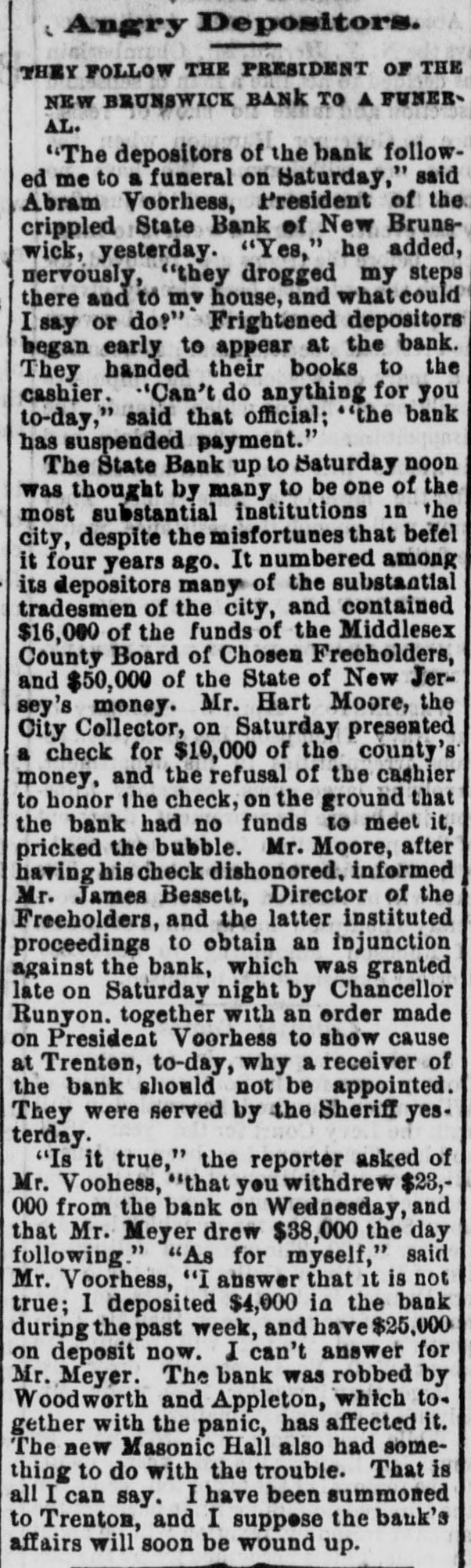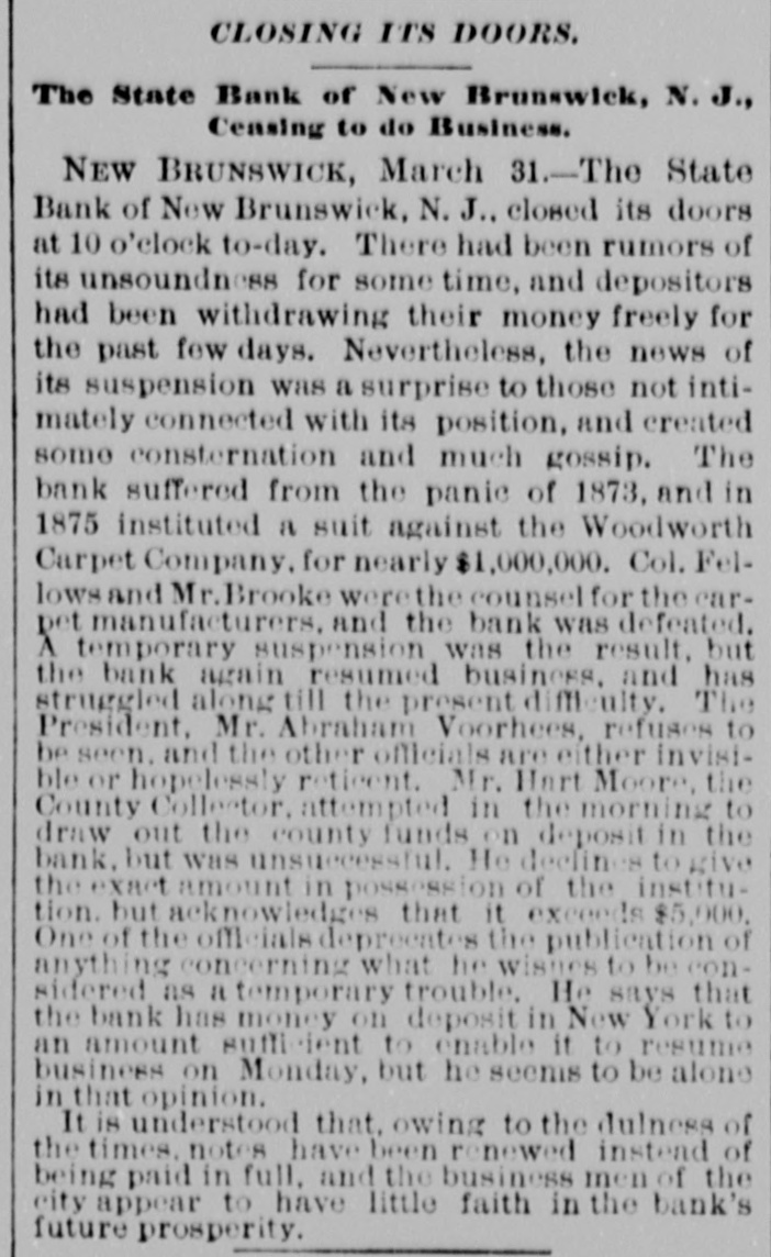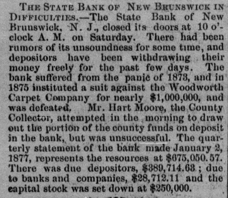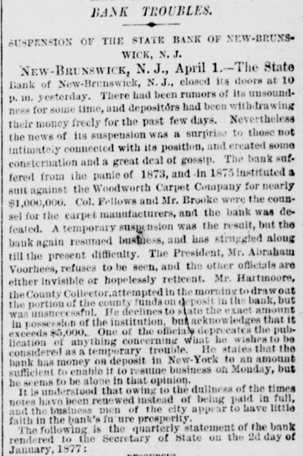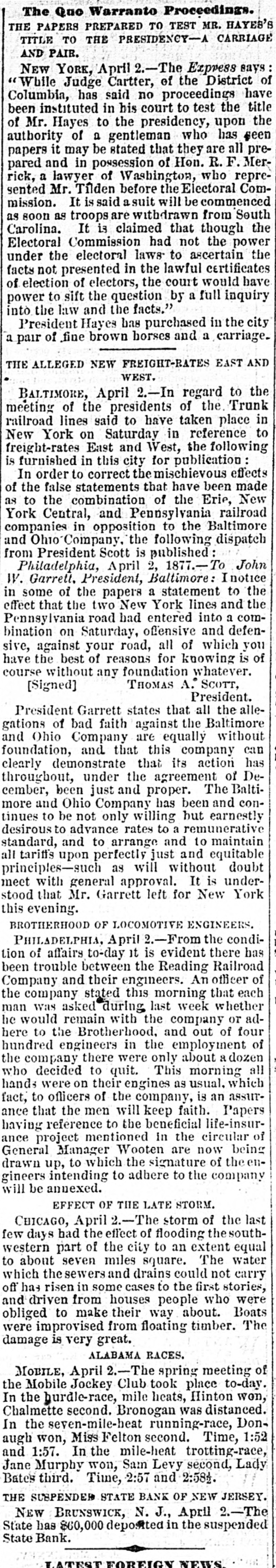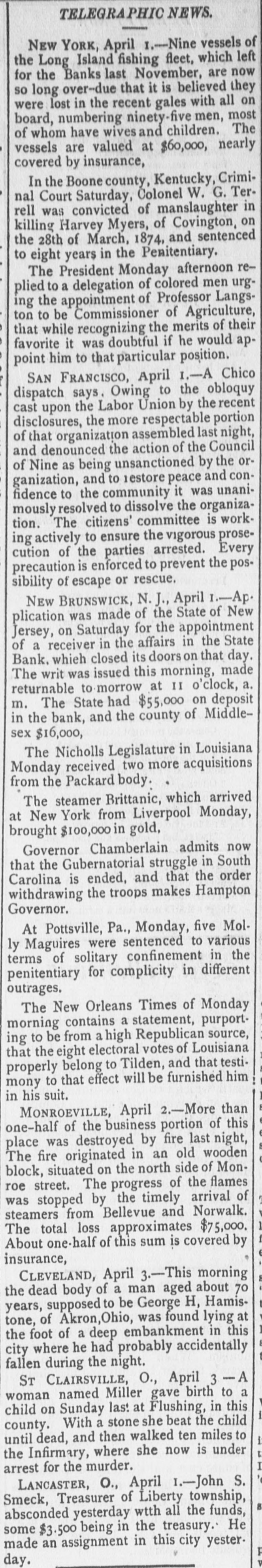 TELEGRAPHIC NEWS. NEW YORK, April I.-Nine vessels of the Long Island fishing fleet, which left for the Banks last November, are now so over-due that it is they in the recent on were long lost gales believed with all board, numbering ninety-five men, most of whom have wives and children. The vessels are valued at $60,000, nearly covered by insurance, In the Boone county, Kentucky, Criminal Court Saturday, Colonel W. G. Terof in on rell killing was Harvey convicted Myers, of manslaughter Covington, the 28th of March, 1874, and sentenced to eight years in the Penitentiary. The President Monday afternoon replied to a delegation of colored men urging the appointment of Professor Langston to be Commissioner of Agriculture, that while recognizing the merits of their favorite it was doubtful if he would appoint him to that particular position. SAN FRANCISCO, April 1.-A Chico dispatch Owing to the obloquy the Labor cast upon says. Union by the portion recent disclosures, the more respectable of that organization assembled last night, and denounced the action of the Council of as orNine being unsanctioned by and the ganization, and to estore peace conto the was resolved to mously fidence community dissolve it the organiza- unanicitizens' committee is workto ensure vigorous ing tion. actively The the Every prosecution of the parties arrested. precaution is enforced to prevent the possibility of escape or rescue. NEW BRUNSWICK, N. J., April I.-Ap. was made of the on for Jersey, plication Saturday the State appointment in the of State New of in the affairs closed its on Bank. a receiver whieh doors that day. The writ was issued this morning, made returnable to morrow at II o'clock, a. m. The State had $55,000 on deposit in the bank, and the county of Middlesex $16,000, The Nicholls Legislature in Louisiana Monday received two more acquisitions from the Packard body. The steamer Brittanic, which arrived at New York from Liverpool Monday, brought $100,000 in gold, Governor Chamberlain admits now that the Gubernatorial struggle in South Carolina is ended, and that the order withdrawing the troops makes Hampton Governor. At Pottsville, Pa., Monday, five Molly Maguires were sentenced to various terms of solitary confinement in the penitentiary for complicity in different outrages. The New Orleans Times of Monday morning contains a statement, purporting to be from a source, high Republican of Louisiana that the eight electoral votes properly belong to Tilden, and that testimony to that effect will be furnished him in his suit. MONROEVILLE, April 2.-More than of the one-half business portion fire last of night, this place was destroyed by The in an fire originated side old of wooden Monblock, situated on the north roe The was the of street. stopped by progress timely of the arrival flames Bellevue The loss steamers total from approximates and Norwalk. $75,000. About one-half of this sum is covered by insurance, CLEVELAND, April 3.-This morning the of a man 70 dead body aged about Hamissupposed to be George H, of was years, tone, Akron,Ohio, found lying at the foot of a deep embankment in this city where he had probably accidentally fallen during the night. ST CLAIRSVILLE, O., April 3 - A woman named Miller gave birth to a child on last at this Sunday she Flushing, beat the in child county. With a stone and then to until dead, walked she ten is miles under the Infirmary, where now arrest for the murder. LANCASTER, O., April 1.-John S. Treasurer Smeck, absconded yesterday of wtth Liberty all the township, funds, He some $3.500 being in the treasury. made an assignment in this city yesterday.