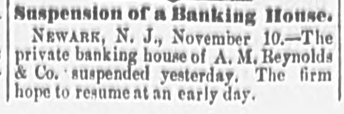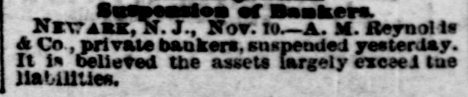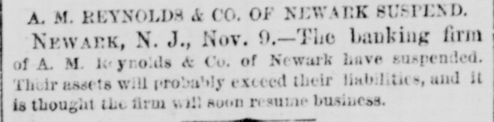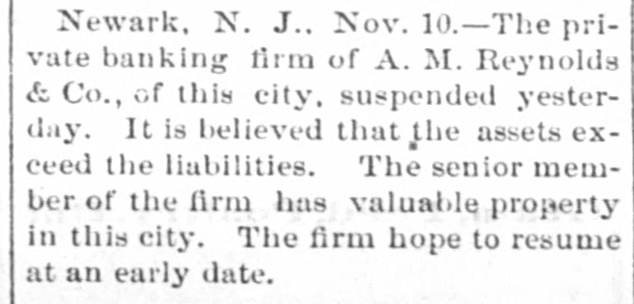 Another Suspension. A BANKING FIRM IN NEWARK GO UNDER. NEWARK, N. J., Nov. 10. A. M. Reynolds & Co., private bankers, suspended, yesterday. It is believed theireassets largely exceed their liabilities.