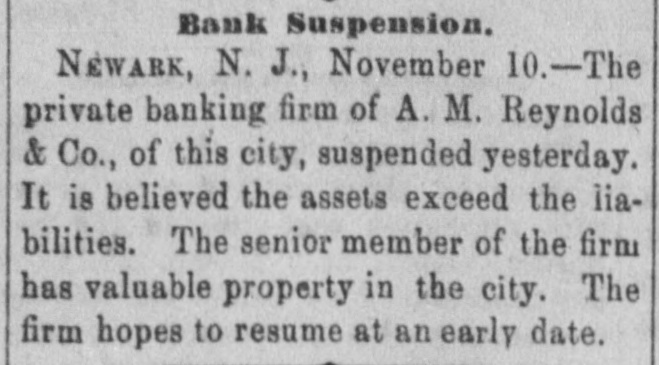 Newark, N. J., Nov. 10. - The private banking firm of A. M. Reynolds & Co., of this city, suspended yesterday. It is believed that the assets exceed the liabilities. The senior member of the firm has valuable property in this city. The firm hope to resume at an early date.
