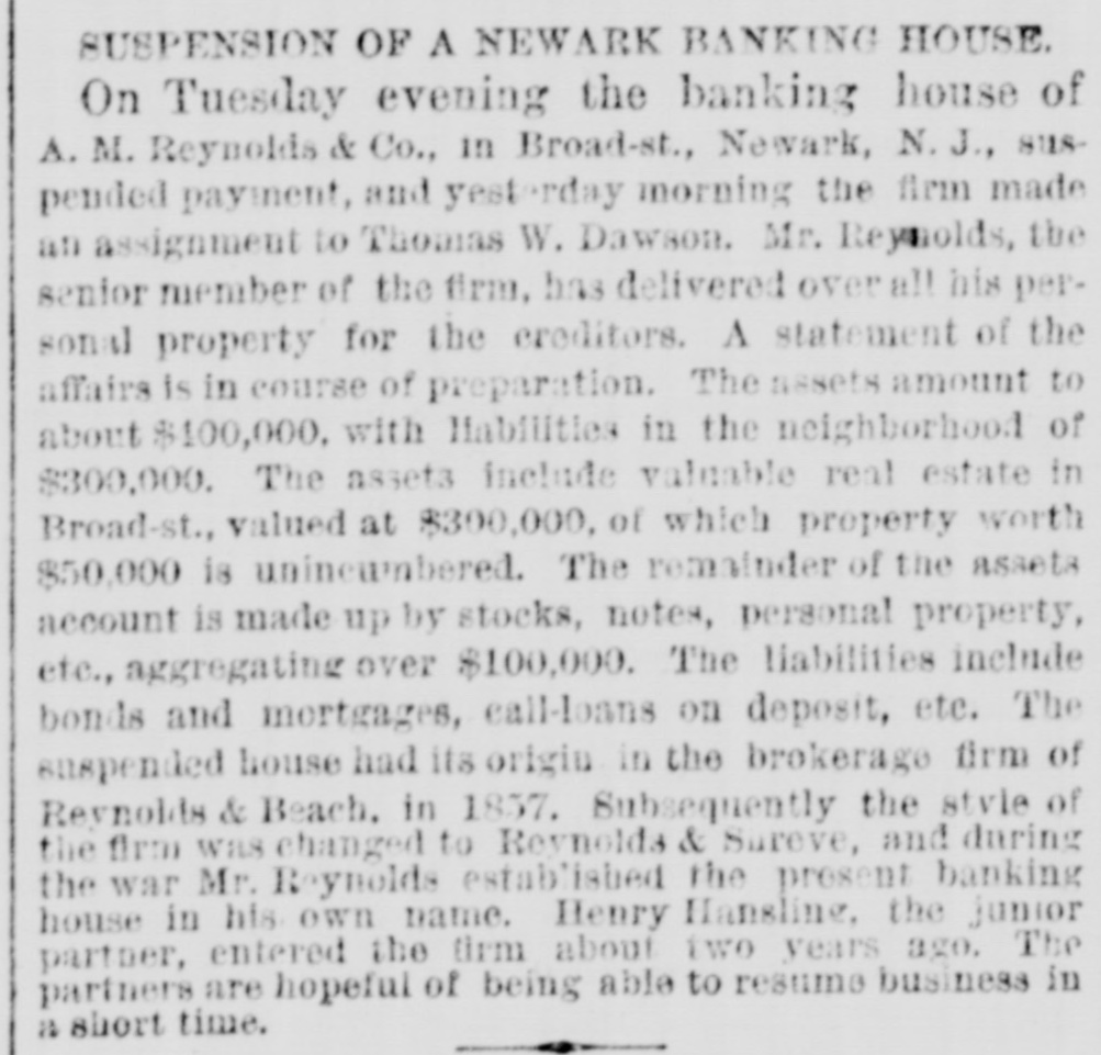 SUSPENSION OF A NEWARK BANKING HOUSE. On Tuesday evening the banking house of A. M. Reynolds & Co., in Broad-st., Newark, N.J., suspended payment, and yesterday morning the firm made an assignment to Thomas W. Dawson. Mr. Reynolds, the senior member of the firm, has delivered overall his personal property for the creditors. A statement of the affairs is in course of preparation. The assets amount to about $100,000, with Habilities in the neighborhood of $300,000. The assets include valuable real estate in Broad-st., valued at $300,000, of which property worth $50,000 is unineumbered. The remainder of the assets account is made up by stocks, notes, personal property, etc., aggregating over $100,000. The liabilities include bonds and mortgages, call-loans on deposit, etc. The suspended house had its origin in the brokerage firm of Reynolds & Beach, in 1837. Subsequently the stvie of the firm was changed to Reynolds & Sureve, and during the war Mr. Reynolds established the present banking house in his own name. Henry Hansling, the junior partner, entered the firm about two years ago, The partners are hopeful of being able to resume business in a short time.