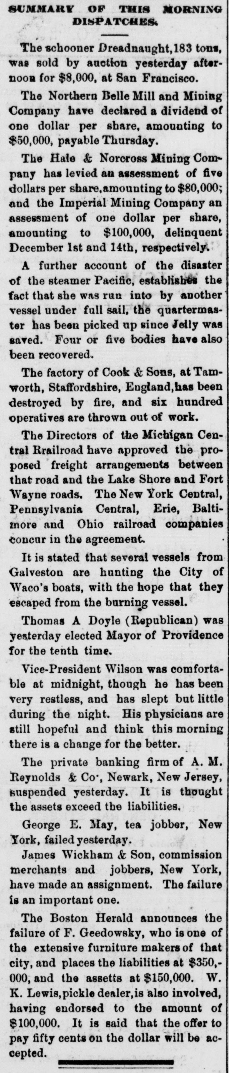 SUMMARY OF THIS MORNING DISPATCHES. The schooner Dreadnaught, tons, was sold by auction yesterday afternoon for $8,000, at San Francisco. The Northern Belle Mill and Mining Company have declared a dividend of one dollar per share, amounting to $50,000, payable Thursday. The Hale & Norcross Mining Company has levied an assessment of five dollars per share, amounting to $80,000; and the Imperial Mining Company an assessment of one dollar per share, amounting to $100,000, delinquent December 1st and 14th, respectively. A further account of the disaster of the steamer Pacific, establishes the fact that she was run into by another vessel under full sail, the quartermaster has been picked up since Jelly was saved. Four or five bodies have also been recovered. The factory of Cook & Sons, at Tamworth, Staffordshire, England, has been destroyed by fire, and six hundred operatives are thrown out of work. The Directors of the Michigan Central Rrailroad have approved the proposed freight arrangements between that road and the Lake Shore and Fort Wayne roads. The New York Central, Pennsylvania Central, Erie, Baltimore and Ohio railroad companies concur in the agreement. It is stated that several vessels from Galveston are hunting the City of Waco's boats, with the hope that they escaped from the burning vessel. Thomas A Doyle (Republican) was yesterday elected Mayor of Providence for the tenth time. Vice-President Wilson was comfortable at midnight, though he has been very restless, and has slept but little during the night. His physicians are still hopeful and think this morning there is a change for the better. The private banking firm of A. M. Reynolds & Co; Newark, New Jersey, suspended yesterday. It is thought the assets exceed the liabilities. George E. May, tea jobber, New York, failed yesterday. James Wickham & Son, commission merchants and jobbers, New York, have made an assignment. The failure is an important one. The Boston Herald announces the failure of F. Geedowsky, who is one of the extensive furniture makers of that city, and places the liabilities at $350,000, and the assetts at $150,000. W. K. Lewis, pickle dealer, is also involved, having endorsed to the amount of $100,000. It is said that the offer to pay fifty cents on the dollar will be accepted.