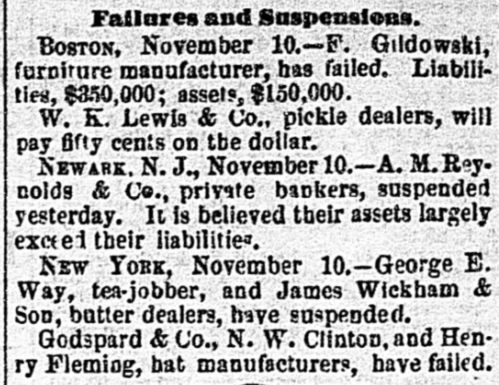 Failures and Suspensions. BOSTON, November 10.-F. Gildowski, furniture manufacturer, has failed. Liabilities, $350,000; assets, $150,000. W. K. Lewis & Co., pickle dealers, will pay fifty cents on the dollar. NEWARK. N.J., November 10.-A. M. Reynolds & Co., private bankers, suspended yesterday. It is believed their assets largely exced their liabilities. NEW YORK, November 10.-George E. Way, tea-jobber, and James Wickham & Son, butter dealers, have suspended. Godspard & Co., N. W. Clinton, and Henry Fleming, bat manufacturers, have failed.
