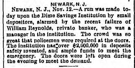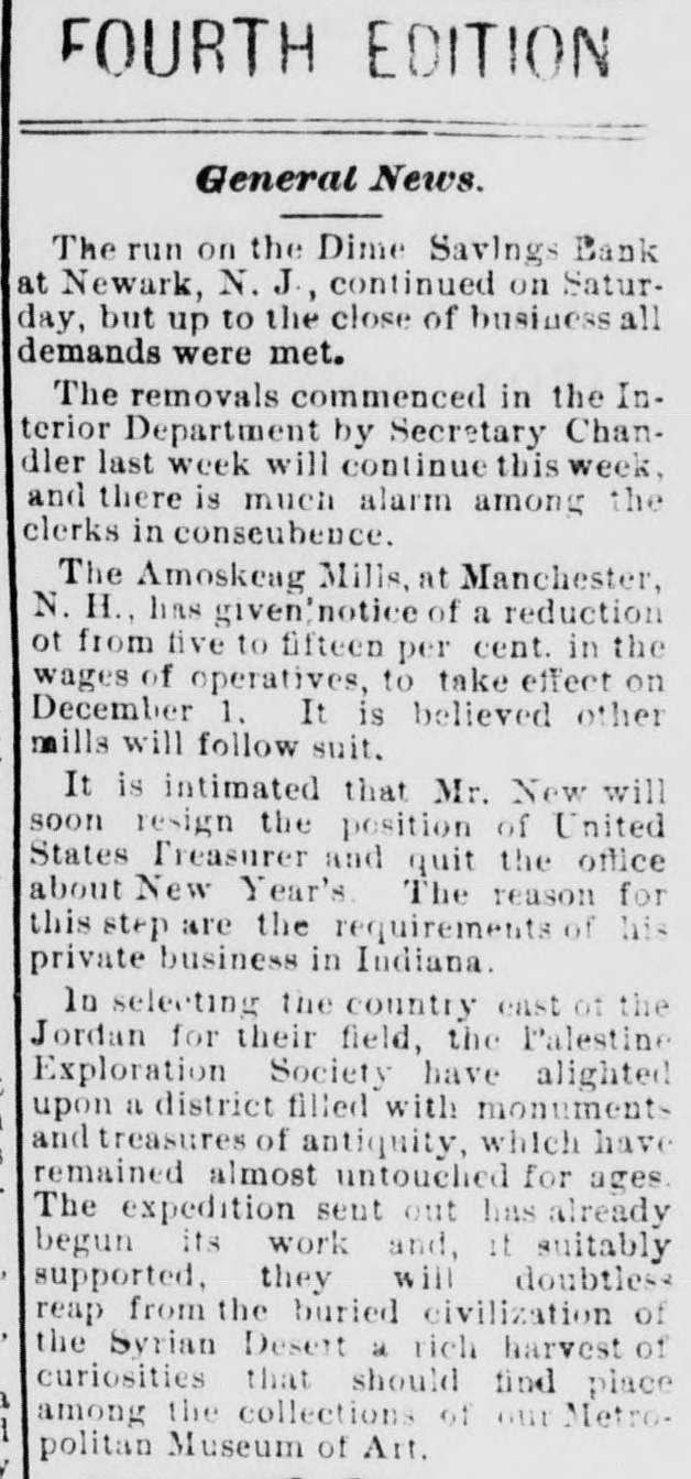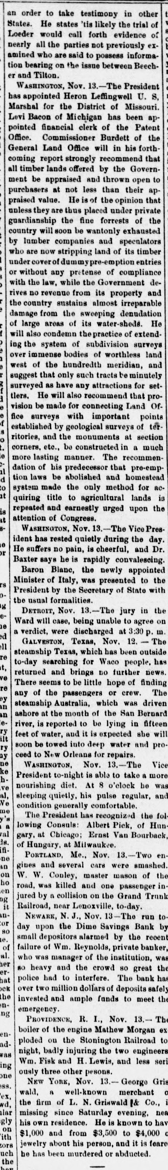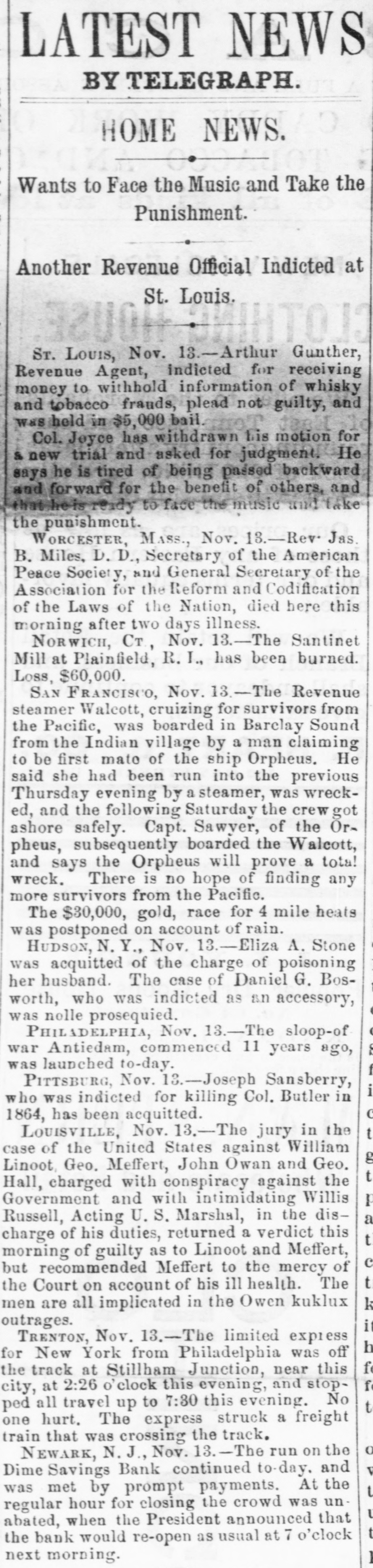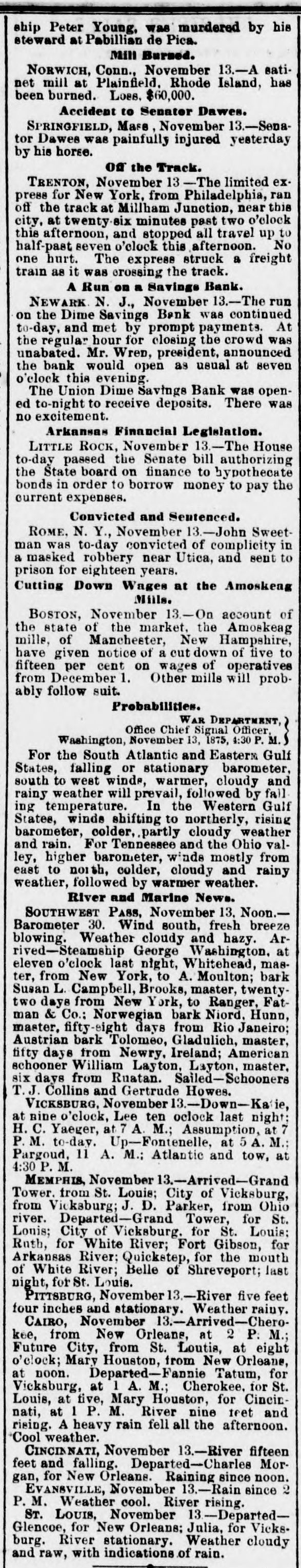 ship Peter Young, was murdered by his steward at Pabillian de Pica. Mill Burned. NORWICH, Conn., November 13.-A satinet mill at Plainfield, Rhode Island, has been burned. Loss. $60,000. Accident to Senator Dawes. SPRINGFIELD, Mase, November 13.-Senator Dawes was painfully injured yesterday by his horse. Off the Track. TRENTON, November 13-The limited ex. press for New York, from Philadelphia, ran off the track at Millham Junction, near this city, at twenty-six minutes past two o'clock this afternoon, and stopped all travel up to half-past seven o'clock this afternoon. No one hurt. The express struck a freight train as it was crossing the track. A Run on a Savings Bank. NEWARK N. J., November 13.-The run on the Dime Savings Bank was continued to-day, and met by prompt payments. At the regular hour for closing the crowd was unabated. Mr. Wren, president, announced the bank would open as usual at seven o'clock this evening. The Union Dime Savings Bank was opened to-night to receive deposits. There was no excitement. Arkansas Financial Legislation. LITTLE Rock, November 13.-The House to-day passed the Senate bill authorizing the State board on finance to hypothecate bonds in order to borrow money to pay the current expenses. Convicted and Sentenced. ROME. N. Y., November 13.-John Sweetman was to-day convicted of complicity in a masked robbery near Utica, and sent to prison for eighteen years. Cutting Down Wages at the Amoskeng Mills. BOSTON, November 13-On account of the state of the market. the Amoskeag mills, of Manchester, New Hampshire, have given notice of a cut down of five to fifteen per cent on wages of operatives from December 1. Other mills will probably follow suit. Probabilities. WAR DEPARTMENT, Office Chief Signal Officer. Washington, November 13, 1875, 4:30 P. M.) For the South Atlantic and Eastern Gulf States, falling or stationary barometer, south to west winds, warmer, cloudy and rainy weather will prevail, followed by fall ing temperature. In the Western Gulf States, winds shifting to northerly, rising barometer, colder, partly cloudy weather and rain. For Tennessee and the Ohio valley, higher barometer, winds mostly from east to north, colder, cloudy and rainy weather, followed by warmer weather. River and Marine News. SOUTHWEST PASS, November 13. Noon.Barometer 30. Wind south, fresh breeze blowing. Weather cloudy and hazy. Arrived-Steamship George Washington. at eleven o'clock last night, Whitehead, master, from New York, to A. Moulton; bark Susan L. Campbell, Brooks, master, twentytwo days from New York, to Ranger, Fatman & Co.: Norwegian bark Niord, Hunn, master, fifty-eight days from Rio Janeiro; Austrian bark Tolomeo, Gladulich, master, fifty days from Newry. Ireland; American schooner William Layton, Layton, master, six days from Ruatan. ailed-Schooners T.J. Collins and Gertrude Howes. VICKSBURG, November 13.-Down-Katie, at nine o'clock, Lee ten oclock last night: H. C. Yaeger, at 7 A. M.; Assumption, at 7 P.M. to-day. Up-Fontenelle, at 5 A. M.; Pargoud, 11 A. M.; Atlantic and tow, at 4:30 P. M. MEMPHIS, November 13.-Arrived-Grand Tower. from St. Louis; City of Vicksburg, from Vicksburg; J. D. Parker, from Ohio river. Departed- Grand Tower, for St. Lonis; City of Vicksburg. for St. Louis: Ruth, for White River; Fort Gibson, for Arkansas River; Quickstep, for the mouth of White River; Belle of Shreveport; last night, for St. Louis. PITTSBURG, November 13.-River five feet four inches and stationary. Weather rainy. CAIRO, November 13.-Arrived-Cherokee, from New Orleans, at 2 P: M.; Future City, from St. Loutis, at eight o'clock; Mary Houston, from New Orleans, at noon. Departed-Fannie Tatum, for Vicksburg, at 1 A. M.; Cherokee, for St. Louis, at five, Mary Houston, for Cincinnati, at 1 P. M. River nine feet and rising. A heavy rain fell all the afternoon. Cool weather. CINCINNATI, November 13.-River fifteen feet and falling. Departed-Charles Morgan, for New Orleans. Raining since noon. EVANSVILLE, November 13.-Rain since 2 P. M. Weather cool. River rising. ST. LOUIS, November 13-DepartedGlencoe, for New Orleans: Julia, for Vicksburg. River stationary. Weather cloudy and raw, with indications of rain.