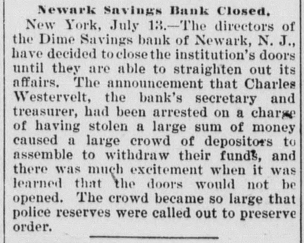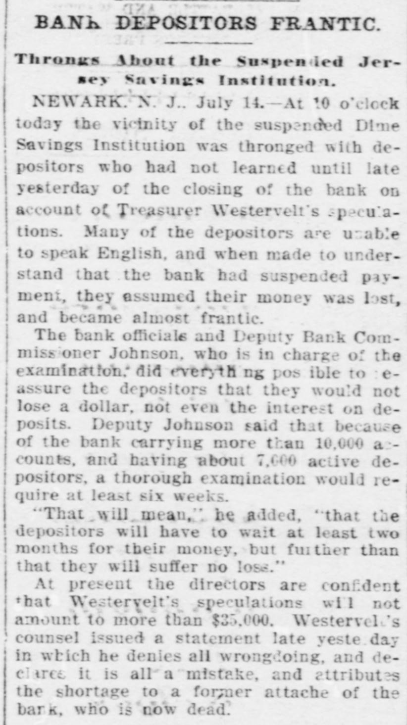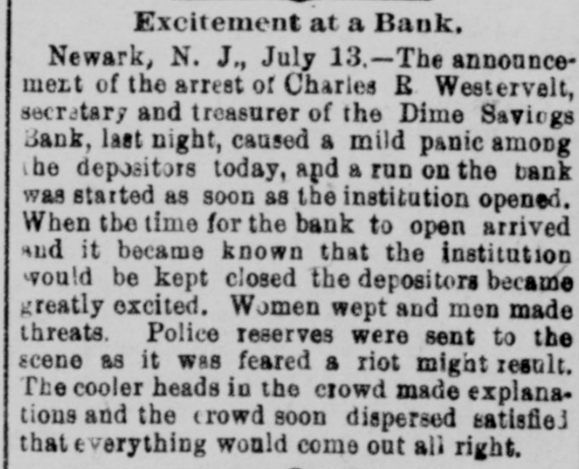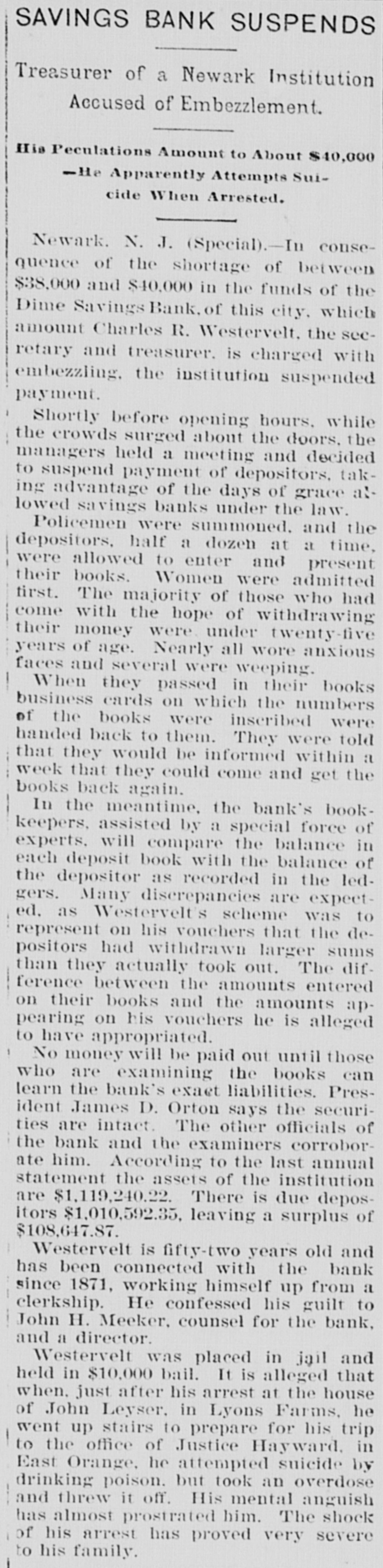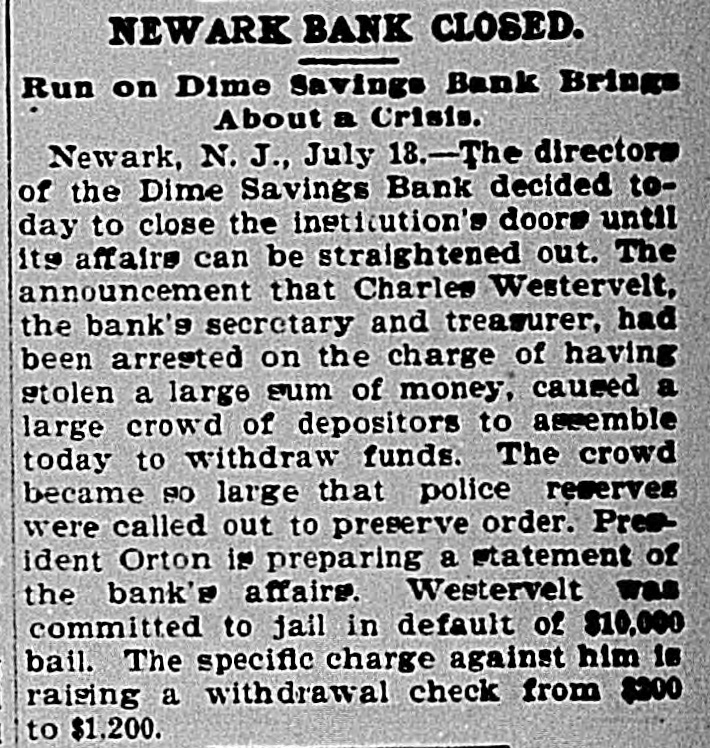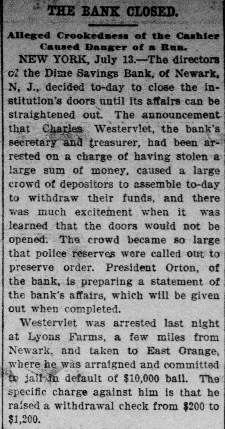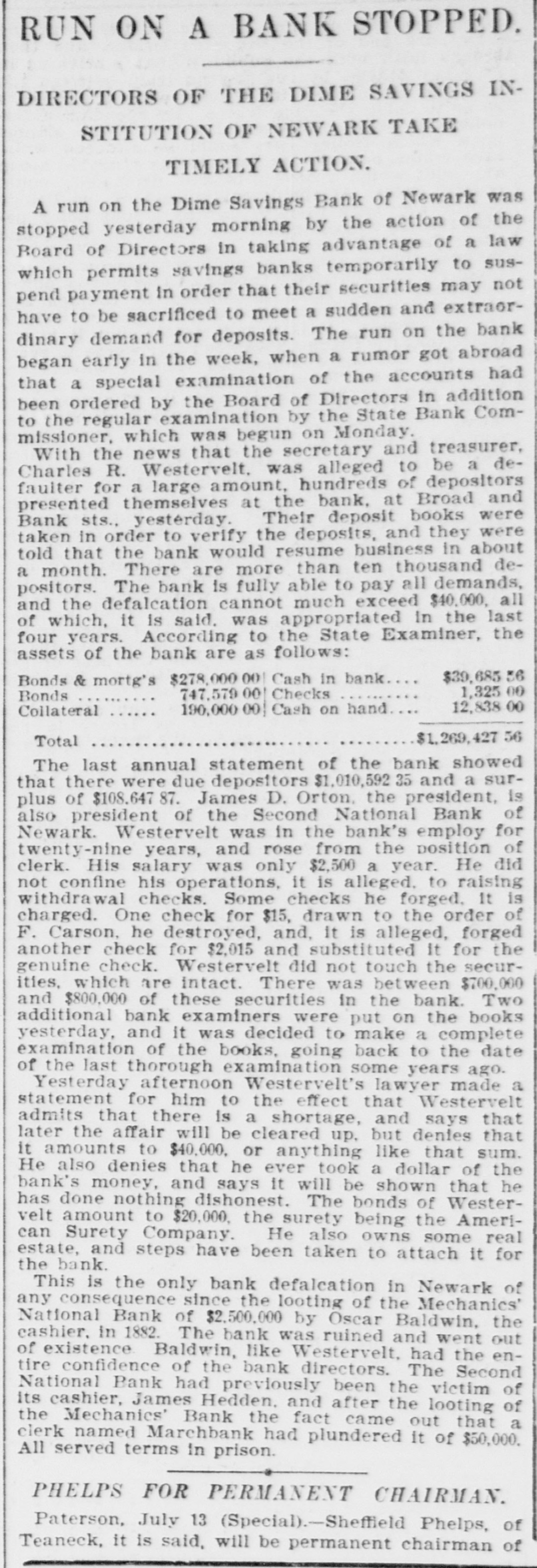 RUN ON A BANK STOPPED. DIRECTORS OF THE DIME SAVINGS INSTITUTION OF NEWARK TAKE TIMELY ACTION. A run on the Dime Savings Bank of Newark was stopped yesterday morning by the action of the Board of Directors in taking advantage of a law which permits savings banks temporarily to suspend payment in order that their securities may not have to be sacrificed to meet a sudden and extraordinary demand for deposits. The run on the bank began early in the week, when a rumor got abroad that a special examination of the accounts had been ordered by the Board of Directors in addition to the regular examination by the State Bank Commissioner, which was begun on Monday. With the news that the secretary and treasurer, Charles R. Westervelt, was alleged to be a defaulter for a large amount. hundreds of depositors presented themselves at the bank. at Broad and Bank sts., yesterday. Their deposit books were taken in order to verify the deposits, and they were told that the bank would resume business in about a month. There are more than ten thousand depositors. The bank is fully able to pay all demands, and the defalcation cannot much exceed $40,000. all of which, it is said. was appropriated In the last four years. According to the State Examiner, the assets of the bank are as follows: $39,685.56 Bonds & mortg's $278,000.00 Cash in bank 1,325.00 Checks 747,579.00 Bonds 12,838.00 Cash on hand Collateral 190,000 00 $1,269,427.56 Total The last annual statement of the bank showed that there were due depositors $1,010,592.35 and a surplus of $108,647 87 James D. Orton, the president, Is also president of the Second National Bank of Newark. Westervelt was in the bank's employ for twenty-nine years, and rose from the position of clerk. His salary was only $2,500 a year. He did not confine his operations, it is alleged. to raising withdrawal checks. Some checks he forged. It is charged. One check for $15, drawn to the order of F. Carson, he destroyed, and, it is alleged, forged another check for $2,015 and substituted It for the genuine check. Westervelt did not touch the securities, which are intact. There was between $700,000 and $800,000 of these securities in the bank. Two additional bank examiners were put on the books yesterday, and it was decided to make a complete examination of the books, going back to the date of the last thorough examination some years ago. Yesterday afternoon Westervelt's lawyer made a statement for him to the effect that Westervelt admits that there is a shortage, and says that later the affair will be cleared up, but denies that it amounts to $40,000. or anything like that sum. He also denies that he ever took a dollar of the bank's money, and says it will be shown that he has done nothing dishonest. The bonds of Westerto the surety the velt amount Surety $20,000. being American Company. He also owns some real estate, and steps have been taken to attach it for the bank. This is the only bank defalcation in Newark of any consequence since the looting of the $2,500,000 by Oscar National Bank of Baldwin, Mechanics' the cashier, in 1882. The bank was ruined and went out of existence Baldwin, like Westervelt, had the entire confidence of the bank directors. The Second National Bank had previously been the victim of its cashier, James Hedden. and after the Bank the fact came the Mechanics' out looting that of a clerk named Marchbank had plundered it of $50,000. All served terms in prison. PHELPS FOR PERMANENT CHAIRMAN, Paterson, July 13 (Special).-Sheffield Phelps, of Teaneck, it is said, will be permanent chairman of