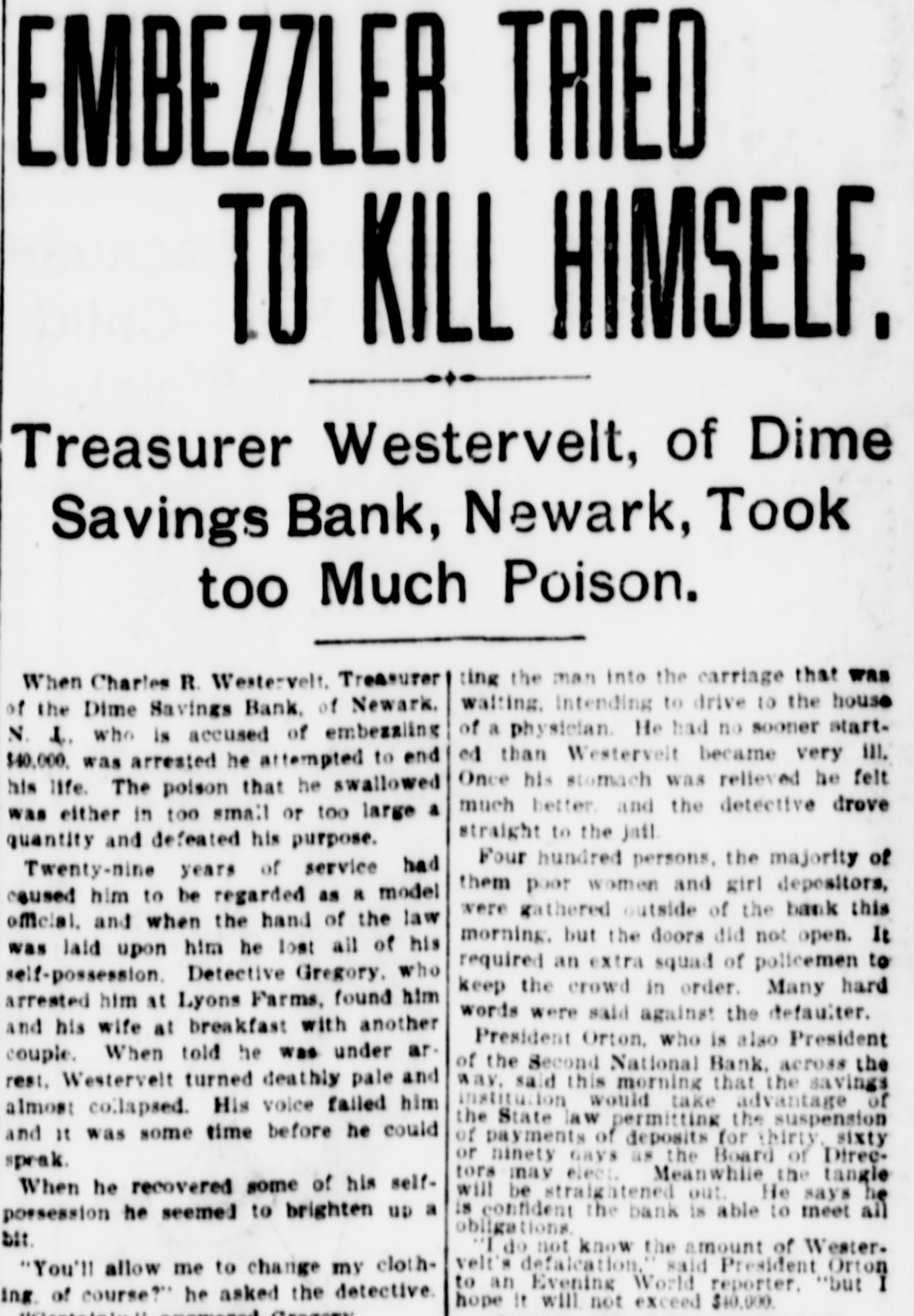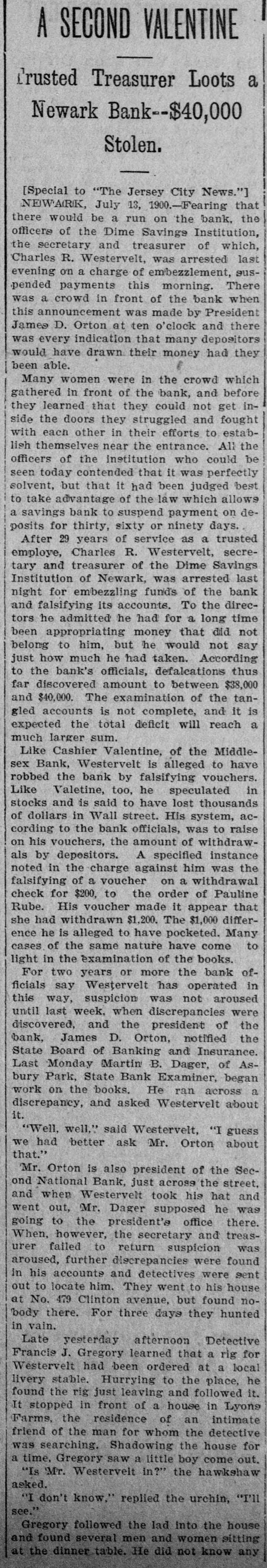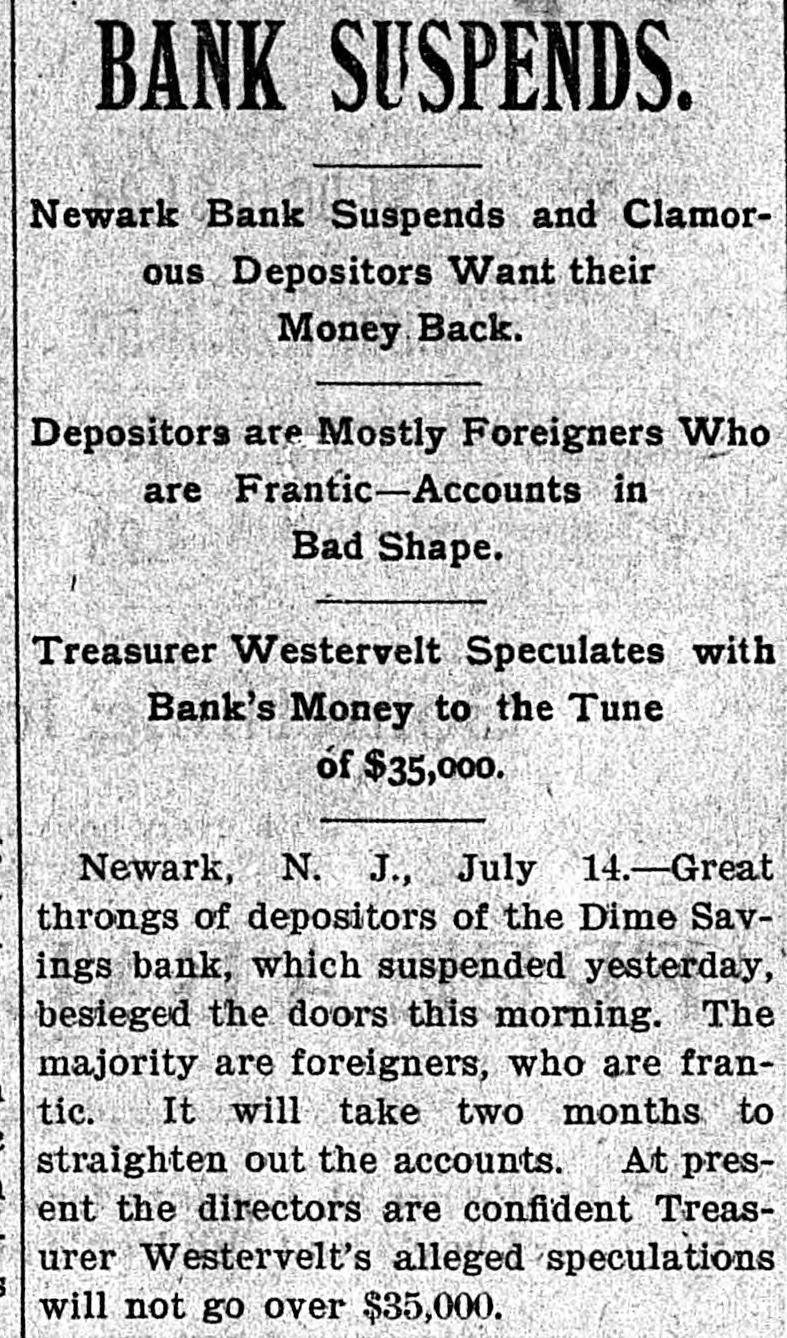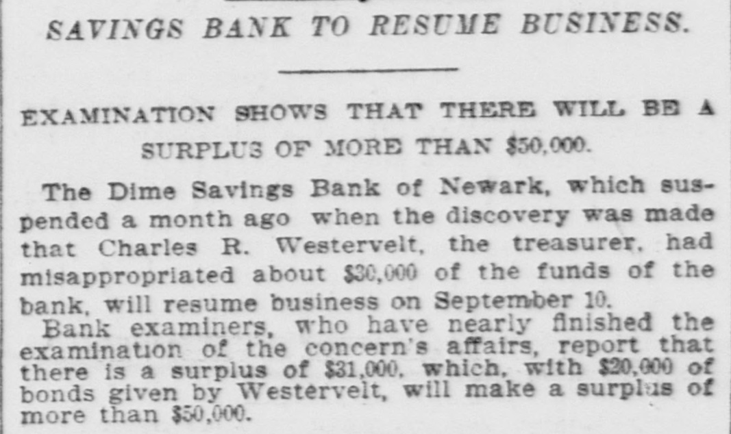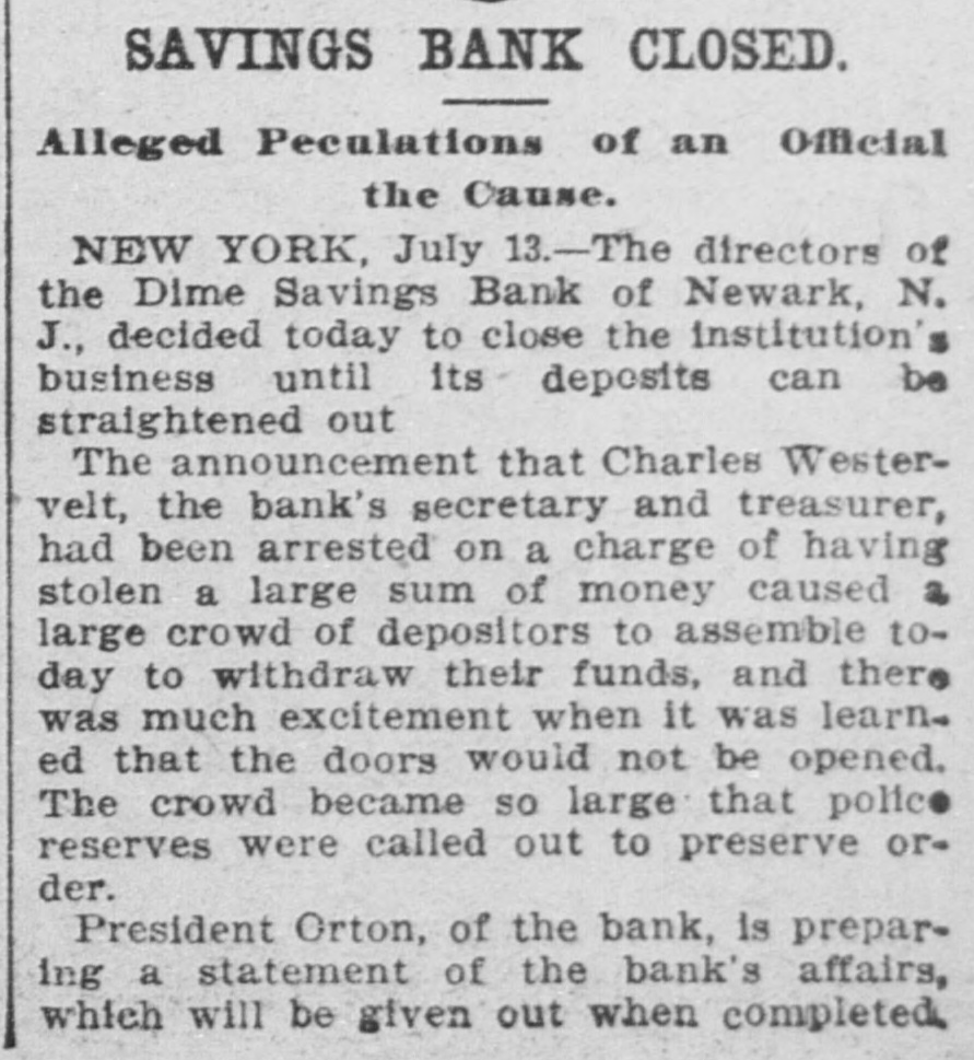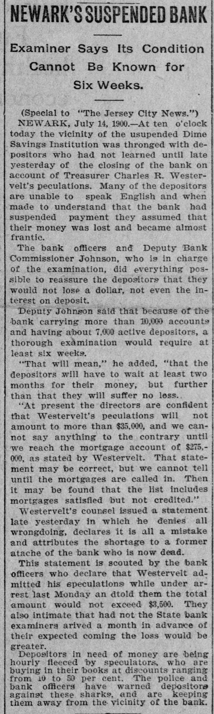 RUN ON A BANK STOPPED. DIRECTORS OF THE DIME SAVINGS INSTITUTION OF NEWARK TAKE TIMELY ACTION. A run on the Dime Savings Bank of Newark was stopped yesterday morning by the action of the Board of Directors in taking advantage of a law which permits savings banks temporarily to suspend payment in order that their securities may not have to be sacrificed to meet a sudden and extraordinary demand for deposits. The run on the bank began early in the week, when a rumor got abroad that a special examination of the accounts had been ordered by the Board of Directors in addition to the regular examination by the State Bank Commissioner, which was begun on Monday. With the news that the secretary and treasurer, Charles R. Westervelt, was alleged to be a defaulter for a large amount. hundreds of depositors presented themselves at the bank. at Broad and Bank sts., yesterday. Their deposit books were taken in order to verify the deposits, and they were told that the bank would resume business in about a month. There are more than ten thousand depositors. The bank is fully able to pay all demands, and the defalcation cannot much exceed $40,000. all of which, it is said. was appropriated In the last four years. According to the State Examiner, the assets of the bank are as follows: $39,685.56 Bonds & mortg's $278,000.00 Cash in bank 1,325.00 Checks 747,579.00 Bonds 12,838.00 Cash on hand Collateral 190,000 00 $1,269,427.56 Total The last annual statement of the bank showed that there were due depositors $1,010,592.35 and a surplus of $108,647 87 James D. Orton, the president, Is also president of the Second National Bank of Newark. Westervelt was in the bank's employ for twenty-nine years, and rose from the position of clerk. His salary was only $2,500 a year. He did not confine his operations, it is alleged. to raising withdrawal checks. Some checks he forged. It is charged. One check for $15, drawn to the order of F. Carson, he destroyed, and, it is alleged, forged another check for $2,015 and substituted It for the genuine check. Westervelt did not touch the securities, which are intact. There was between $700,000 and $800,000 of these securities in the bank. Two additional bank examiners were put on the books yesterday, and it was decided to make a complete examination of the books, going back to the date of the last thorough examination some years ago. Yesterday afternoon Westervelt's lawyer made a statement for him to the effect that Westervelt admits that there is a shortage, and says that later the affair will be cleared up, but denies that it amounts to $40,000. or anything like that sum. He also denies that he ever took a dollar of the bank's money, and says it will be shown that he has done nothing dishonest. The bonds of Westerto the surety the velt amount Surety $20,000. being American Company. He also owns some real estate, and steps have been taken to attach it for the bank. This is the only bank defalcation in Newark of any consequence since the looting of the $2,500,000 by Oscar National Bank of Baldwin, Mechanics' the cashier, in 1882. The bank was ruined and went out of existence Baldwin, like Westervelt, had the entire confidence of the bank directors. The Second National Bank had previously been the victim of its cashier, James Hedden. and after the Bank the fact came the Mechanics' out looting that of a clerk named Marchbank had plundered it of $50,000. All served terms in prison. PHELPS FOR PERMANENT CHAIRMAN, Paterson, July 13 (Special).-Sheffield Phelps, of Teaneck, it is said, will be permanent chairman of