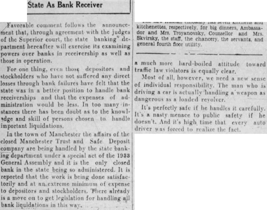 State As Bank Receiver Favorable comment follows the announcement that, through agreement with the judges of the Superior court, the state banking department hereafter will exercise its examining powers over banks in receivership well those in operation. For even those depositors and one thing, stockholders have not suffered any direct losses through bank failures have felt that the state was in better position to handle bank receiverships and that the expenses of administration would be less. In too many stances there has been doubt as to the edge and skill of persons chosen to handle important liquidations. In the town of Manchester the affairs of the closed Manchester Trust and Safe Deposit company are being handled by the state bank ing under special act of the 1933 General Assembly and it the only closed bank the state being administered. It reported that the work is being done satisfactorily and at minimum of expense to depositors and stockholders. There already move on get legislation for handling bank liquidations in this much more attitude toward law violators is equally clear. Most of all, need sense of The man car actually handling weapon dangerous loaded reyolver. perfectly safe if he handles carefully. nasty menace to public safety if he doesn't. And it's high time that every auto driver forced to realize the fact.