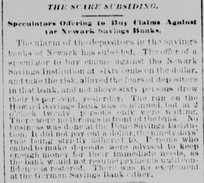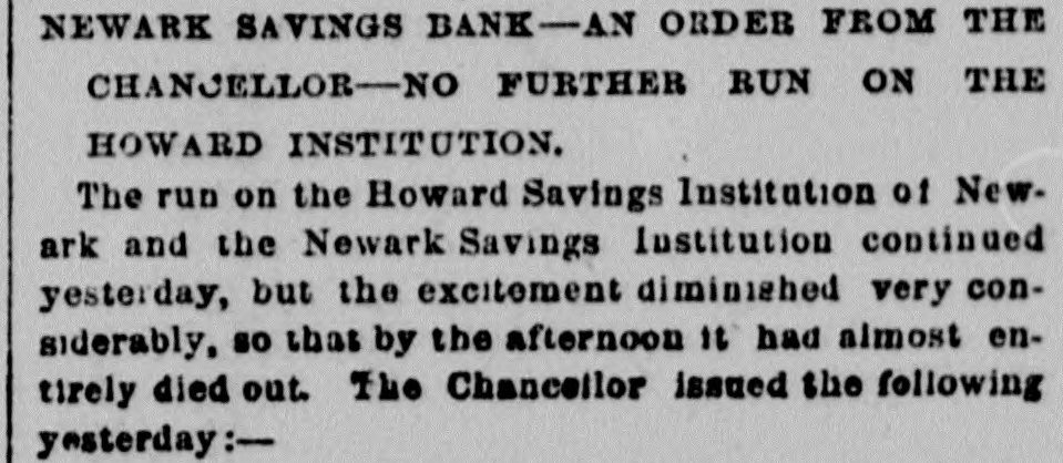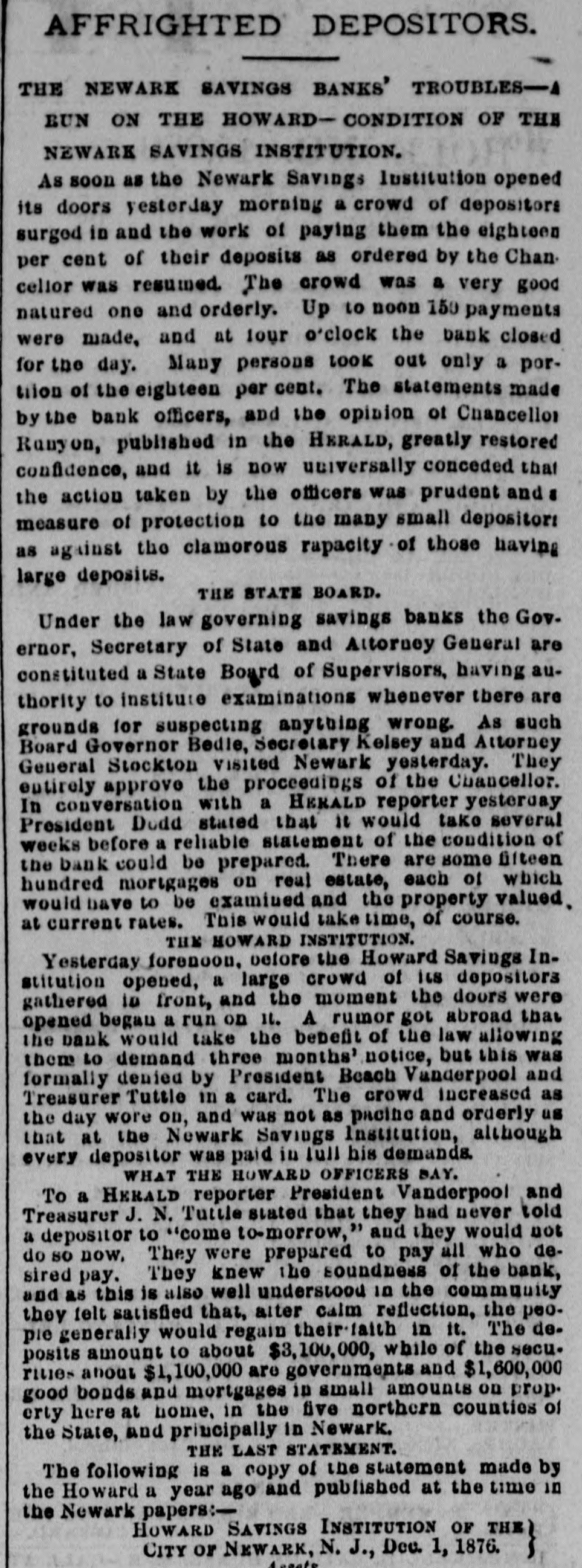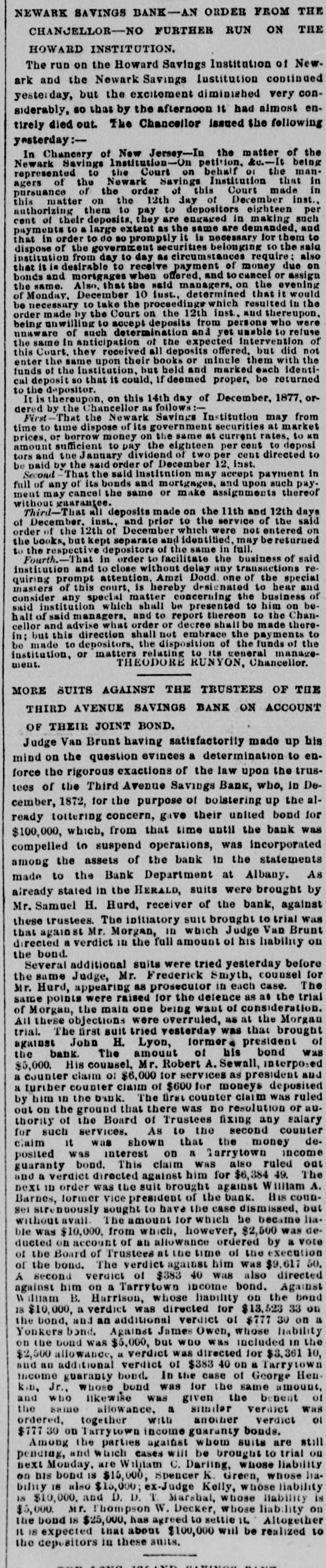 NEWARK SAVINGS BANK-AN ORDER FROM THE CHANCELLOR-NO FURTHER RUN ON THE HOWARD INSTITUTION. The run on the Howard Savings Institution of Newark and the Newark Savings Institution continued yesterday, but the excitement diminished very considerably, so that by the afternoon it had almost entirely died out. The Chancellor issued the following yesterday:In Chancery of New Jersey-In the matter of the Newark Savings Institution- petition, &c.-It being represented to the Court on behalf or the managers of the Newark Savings Institution that in pursuance of the order of this Court made in this matter on the 12th day of December inst., authorizing them to pay to depositors eighteen per cent of their deposits, they are engaged in making such payments to a large extent as the same are demanded. and that in order to do so promptly it is necessary for them to dispose of the government securities belonging to the said institution from day to day as circumstances require: also that it in desirable to receive payment of money due on bonds and mortgages when offered, and to cancel or assign the same. Also, that the said managers. on the evening of Monday, December 10 inst., determined that it would be necessary to take the proceedings which resulted in the order made by the Court on the 12th inst., and thereupon. being unwilling to accept deposits from persons who were unaware of such determination and yet unable to refuse the same In anticipation of the expected intervention of this Court. they received all deposits offered. but did not enter the same upon their books or mingle them with the funds of the institution, but held and marked each identical deposit so that it could, If deemed proper, be returned to the depositor. It is thereupon, on this 14th day of December, 1877, ordered by the Chancellor as follows:First-That the Newark Savings Institution may from time to time dispose of its government securities at market prices, or borrow money on the same at current rates, to MIL amount sufficient to pay the eighteen per cent to deposi tors and the January dividend of two per cent directed to be paid by the said order of December 12, inst. Second That the said institution may accept payment in full of any of its bonds and mortgages, and upon such payment may cancel the same or make assignments thereof without gaarantee. Third-That all deposits made on the 11th and 12th days of December. inst., and prior to the service of the said order of the 12th of December which were not entered on the books, but kept separate and identified, may bereturned to the respective depositors of the same in full. Fourth.-That in order to facilitate the business of said institution and to close without delay any transactions requiring prompt attention, Amzi Doad one of the special masters of this court, is hereby designated to hear and consider any special matter concerning the business of said institution which shall be presented to him on behalf of said managers. and to report thereon to the Chancellor and advise what order or decree shall be made therein; but this direction shall not embrace the payments to be made to depositors, the disposition of the funds of the institution, or matters relating to its general manageTHEODORE RUNYON, Chancellor. ment. MORE SUITS AGAINST THE TRUSTEES OF THE THIRD AVENUE SAVINGS BANK ON ACCOUNT OF THEIR JOINT BOND. Judge Van Brunt having satisfactorily made up his mind on the question evinces a determination to enforce the rigorous exactions of the law upon the trustees of the Third Avenue Savings Bank, who, in December, 1872, for the purpose of bolstering up the already tottering concern, gave their united bond for $100,000, which, from that time until the bank was compelled to suspend operations, was incorporated among the assets of the bank in the statements made to the Bank Department at Albany. As already stated in the HERALD, suits were brought by Mr. Samuel H. Hurd, receiver of the bank, against these trustees. The initiatory suit brought to trial was that against Mr. Morgan, in which Judge Van Brunt directed a verdict ID the full amount of his liability on the bond. Several additional suits were tried yesterday before the same Judge, Mr. Frederick Smyth, counsel for Mr. Hurd, appearing as prosecutor in each case. The same points were raised for the defence as as the trial of Morgan, the main one being want of consideration. All these objections were overruled, as at the Morgan trial. The first suit tried vesterday was that brought against John H. Lyon, former president of the bank. The amount of his bond was $5,000. His counsel, Mr. Robert A. Sewall, interposed a counter claim of $6,000 for services as president and a turther counter claim of $600 for moneys deposited by him in the bank. The first counter claim was ruled out on the ground that there was no resolution or authority of the Board of Trustees fixing any salary for such services. As to the second counter claim it was shown that the money deposited was interest on a Tarrytown income guaranty bond. This claim was also ruled out and a verdict directed against him for $6,384 49. The next ID order was the suit brought against William A. Barnes, former vice president of the bank. His counsei strenuously sought to have the case dismissed, but without avail. The amount for which he became liable was $10,000, from which, however, $2,500 was deducted on account of an allowance ordered by a vote of the Board of Trustees at the time of the execution of the bond. The verdict against him was $9,617 50. A second verdict of $383 40 was also directed against him on a Tarrytown income bond. Against W illiam B. Harrison, whose liability on the bond IS $10,000, a verdict was directed for $13,523 33 on the bond, and an additional verdict of $777 30 on a Yonkers bond. Against James Owen, whose liability on the bond was $5,000, but wao was included in the $2,500 allowance, " verdict was directed for $3,361 10, and an additional verdict of $38