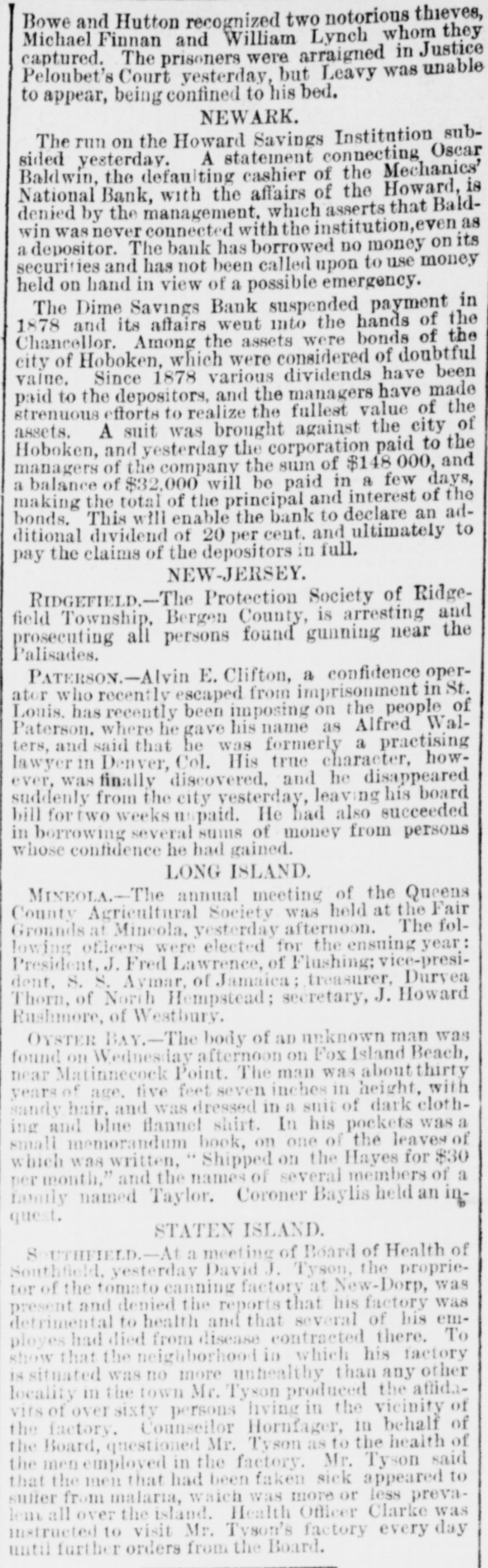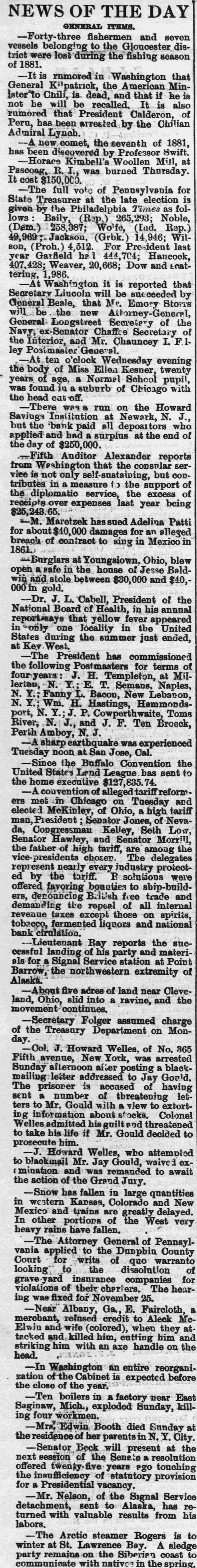 NEWS OF THE DAY GENERAL ITEMS. -Forty-three fishermen and seven vessels belonging to the Gloucester district were lost during the fishing season of 1881. -It is rumored in Washington that General Kilpatrick, the American Minister'to Chili, is dead, and that if he is not he will be recalled It is also rumored that President Calderon, of Peru, has been arrested by the Chilian Admiral Lynch. A new eomet, the seventh of 1881, has been discovered by Professor Swift Horace Kimbell's Woollen Mill, at Pascoag, R.I. was burned Thursday. cost $150,000. -The full vote of Pennsylvania for State Treasurer at the late election is given by the Philadelpbia Times as follows Baily, (Rep.) 265,293 Noble, (Dem.) 258,387; Wo'fe, (Ind. Rep. 49,969,Jackson, (Grbk.) 14,946; Wilson, (Proh. 4,512 For President last year Garfield had 444,704; Hancock, 407,428; Weaver, 20,668; Dow and Eat tering, 1,986, At Washington it is reported that Secretary Lincoln will be succeeded by General Beale, that Mr. Emory Storts will be the new Attorney Generel, General Longstreet Secretary of the Navy, ex Senator Chaffee Secretary of the Interior, and Mr. Chauncey I. F1 ley Postmaster General. At ten o'clock Wednesday evening the body of Miss Ellen Kesner twenty years of age, a Normel School pupil, was found in a suburb of Chicago with the head out off -There was run on the Howard Savings Institution at Newark, N. J. but the bank paid all depositors who applied and had a surplus at the end of the day of $250,000. Fifth Auditor Alexander reports from Weshington that the consular serviee is not only self-sustaining, but contributes in a measure to the support of the diplomatic service, the excess of receipts over expenses last year being $25,243.65. -M. Maretzek has sued Adelina Patti for about$40,000 damages for an alleged breach of contract to sing in Mexico in 1861. -Burglars at Youngsiown, Obio, blew open a safe in the house of Jesse Bald win and stole between $30,000 and $40, 000 in gold. Dr. J. L. Cabell, President of the National Board of Health in his annual report/says that yellow fever appeared in only one locality in tbe United States during the summer just ended, at Key West -The President has commissioned the following Postmasters for terms of four years : J. H. Templeton, at Mil lerten, N. Y. E. T. Semans, Naples, N. Y Fanny L Bacon, New Lebanon, N. Y. Wm. H. Hastings, Hammondsport, N.Y.;J. P. Cowperthwaite, Toms River, N. J., and J. F. Ten Broeck, Perth Amboy, N.J. -A sharp earthquake was experienced Tuesday noon at San Jose, Cal. -Since the Buffalo Convention the United States Lend League bas sent to the home executive $127,835.74 -Aconvention of alleged tariff reformers met in Chicago on Tuesday and elected McKinley, of Ohio, a high tariff man, President Senator Jones, of Nevada, Congressman Kelley, Seth Low Senator Hawley, and Senator Morrill the father of high tariff, are among the -presidents choser The delegates represent nearly every industry protected by the tariff. R solutions were offered favoring bounties to sbip-build ers, derouncing British free trade and demanding the repeal of all internal revenue taxes except those on spirits tobacco, fermented liquors and national bank cirulation. Lieutenant Ray reports the suc cessful landing of his party and materi als for a Signal Service station at Point Barrow, the northwestern extremity of Alaska. About five adres of land near Cleve land, Ohio, slid into a ravine, and the movement continues. Secretary Folger assumed charge of the Treasury Department on Mon day. Col. J. Howard Welles, of No. 365 Fifth avenue, New York, was arrested Sunday afternoon after posting a black mailing letter addressed to Jay Gould. The prisoner is accused of having sent a number of tbreatening let ters to Mr. Gould with a view to extorting information about st locks. Colonel Welles admitted his guilt end threatened to take his life if Mr. Gould decided to prosecute him. -J. Howard Welles, who attempted to blackmail Mr. Jay Gould, waived exmination and was remanded to await the action of the Grand Jury -Snow has fallen in large quantities in western Kansas, Colorado and New Mexico and trains are greatly delayed. In other portions of the West very heavy rains have fallen. The Attorney General of Pennsyl vania applied to the Dunpbin County Court for writs of quo warranto looking to the dissolution of grave-yard insurance companies for violations of their charters. The hearing was fixed for November 25. Near Albany, Ga., E. Faircloth, merchant, refused credit to Aleck Mc Elwin and wife (colored), when they at tacked and killed him, cutting him and striking him with an axe handle on the head. -In Washington an entire reorganization of the Cabinet is expected before the close of the year. -Ten boilers in a factory near East Saginaw, Mich., exploded Sunday, killing four workmen. Mrs. Edwin Booth died Sunday at residence of her parents in N. Y. City. Senator Beck will present at the next session of the Senate a resolution offered twenty- five years ago touching the insufficiency of statutory provision for a Presidential vacancy. -Mr. Nelson, of the Signal Service detachment, sent to Alaska, has returned with valuable results from his labors, The Arctic steamer Rogers is to winter at St. Lawrence Bay. A sledge party remains on the Siberien coast to communicate with nativor in the spring.