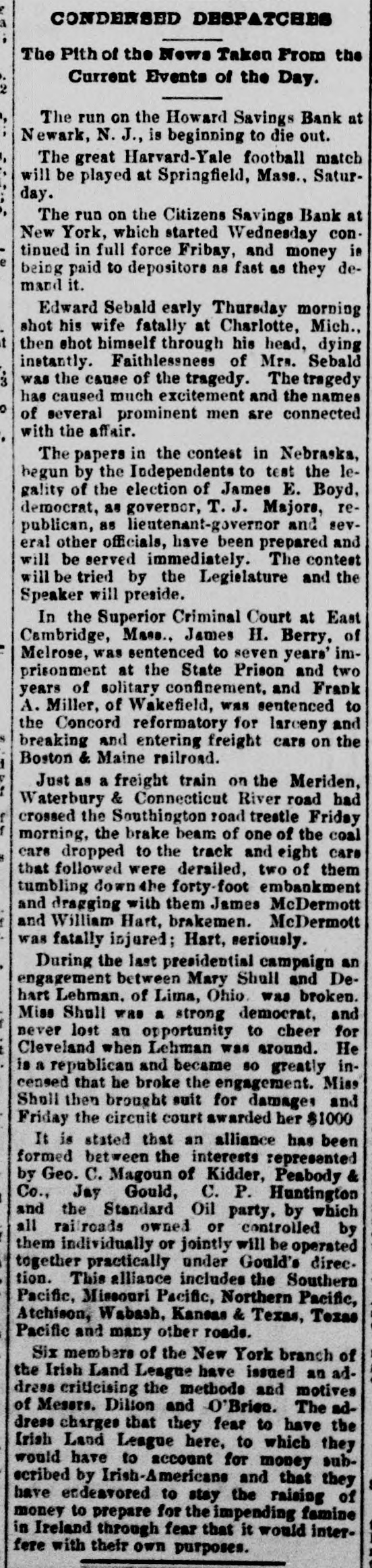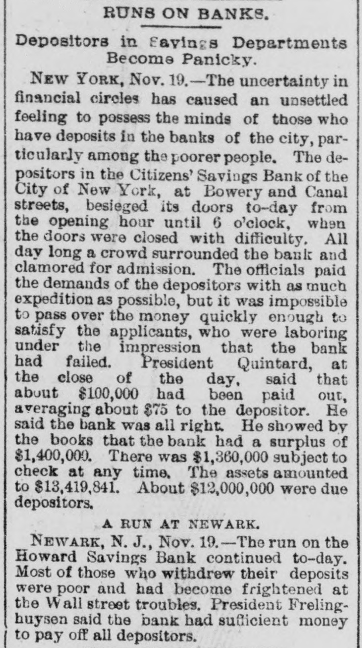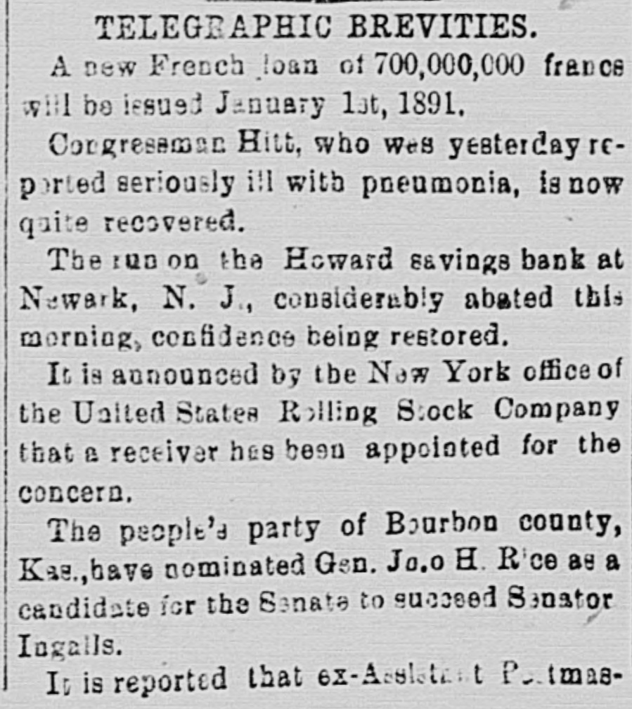 BUSINESS EMBARRASSMENTS Failure of a Great Car-Building Firm. Bank Suspensions. CHICAGO, Nov. 22.-The United States Rolling Stock Company has been placed in the hands of a receiver. The liabilities are $3,816,000|and the assets $6,053,000. Attorney High of the company says that the failure was percipitated by slow collections and the depression in the money marker. The company is the largest builders of railway cars in the world, and has plants at Hegewisch, Itls.: Decatur, Ala.; Anniston, Ala., and Urbana, Ohio. The capital stock is $4,000,000. The assets consists of the plant at Hegewisch, worth $2,000,000; and the plants at the other places, which are mentioned as worth $1,500,000. The other assets are in Car Trust Bonds, worth $1,533,000; rolling stock leased to various railroads, worth $300,000; supplies and material in process of manufacture, $1,000,000, and accounts amounting to $300,000. It is understood the failure is due to the inability to collect $300,000 due from various roads for the rent of cars. The property is put into the hands of a friendly receiver that this sum may be realized on. The company employs 2200 men and its cash payments to employes and for material are $800,000 monthly. The stringency in the money market compelled the railroads which bought cars of the company to pay their bills in long-time paper instead of cash, and it has been extremely difficult to discount the paper. Judge Blodgett of the Federal Court has appointed A. Hegewisch receiver. Hegewisch is the President. The Judge ordered the receiver to continue the works. NEW YORK, Nov. 22. - Vice-President Roys of the United States Rolling-stock Company made a statement to-night confirmatory of that made by the officials of the company in Chicago to-day. He said auxiliary proceedings will be had in all the States where the company has property. All the creditors are satisfied with the arrangement for a receiver, which is to enable the company to tide over the critical point. A London committee advised it and this feeling has been fully reciprocated by the B ard of Directors in New York. CHICAGO, Nov. private bank of W. L. Prettyman, on the North Side, closed its deors this morning. Prettyman could not be found, so no statement of the assets and liabilities is obtainable. Many poor people's hard-earned savings are involved. Lyons Bros., dealers in crockery, have $15,000 on deposit. This is believed to be the largest single loss. This atternoon an assignment was made to the cashier of the bank, Johnson, and at the same time he was made assignee of the North Division Lumber Company, in which Prettyman was the heaviest stockholder Prettyman also assigned his real and personal estate. The assets and liabilities of the two conce rns and Prettyman's estate will reach, it is believed, $1,000,000. Assignee Johnson refuses to make any statement of assets and liabilities either of the bank or lumber company. He said the cause of assignment was the tight money market and its bad effect on the lumber company. This concern and the bank were closely connected. One of the former depositors in the bank, however, who asserts a pretty good knowledge of affairs, believes the liabilities of the bank will reach half a lion. and the assets are problematical. He said Prettyman has been speculating heavily this year in real estate and putting up houses for sale, and that the business has not proved profitable. A large number of depositors in the bank are poor people. WICHITA (Kan.), Nov. 22.-The Commercial Bank of Newton was closed to-day after a rush by depositors. The capital stock is $75,000. No statement of affairs has been made. The Bank of Whitewater, which is a branch of the Newton and Oklaboma banks, is also closed. PHILADELPHIA, Nov. 22.-No statement has yet been made by Barker Bros. It is not likely one will be made for several days. NEW YORK, Nov. 22.-The run on the Citizens' Savings Bank is continued this morning. The bank officials say the run will be broken to-day. The payments already made aggregate nearly $300,000. NEWARK (N. J.), Nov. 22.-The run on the Howard Savings Bank considerably abated this morning, and many depositors are returning their money. LONDON, Nov. 22.-Argentine finances are to be taken in hand by the strongest committee that can be formed in London, and if the Aigentine authorities co-operate it is believed to be perfectly p ssible to bring things around within R reasonable time, certainly long before the three years now allowed for the liquidation of the Baring estate and the realization on their great mass of Securities. PARIS, Nov. 22.-The Comptoir National d'Escompte has failed to float the South Brazilian Railway loan. Only one-third of the amount of the loan was subscribed.