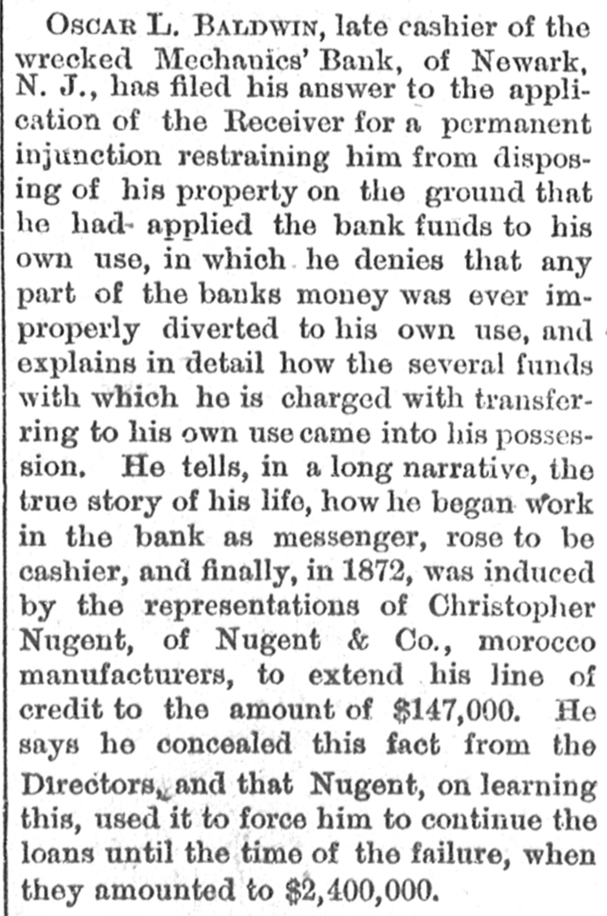 OSCAR L. BALDWIN, late cashier of the wrecked Mechanics' Bank, of Newark, N. J., has filed his answer to the application of the Receiver for a permanent injunction restraining him from disposing of his property on the ground that he had- applied the bank funds to his own use, in which he denies that any part of the banks money was ever improperly diverted to his own use, and explains in detail how the several funds with which he is charged with transferring to his own use came into his possession. He tells, in a long narrative, the true story of his life, how he began- work in the bank as messenger, rose to be cashier, and finally, in 1872, was induced by the representations of Christopher Nugent, of Nugent & Co., morocco manufacturers, to extend his line of credit to the amount of $147,000. He says he concealed this fact from the Directors, and that Nugent, on learning this, used it to force him to continue the loans until the time of the failure, when they amounted to $2,400,000.