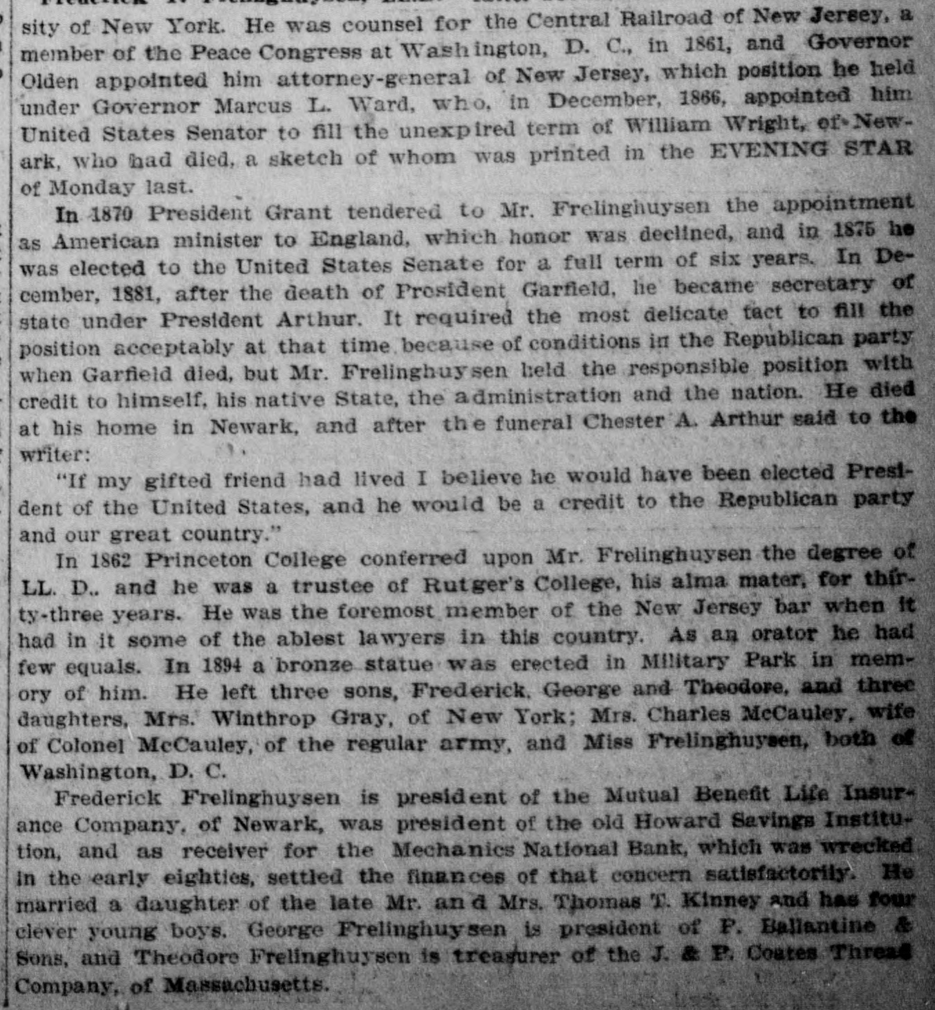 sity of New York. He was counsel for the Central Railroad of New Jersey, a member of the Peace Congress at Washington, D. C., in 1861, and Governor Olden appointed him attorney-general of New Jersey, which position he held under Governor Marcus L. Ward, who, in December, 1866, appointed him United States Senator to fill the unexpired term of William Wright, of Newark, who had died, a sketch of whom was printed in the EVENING STAR of Monday last. In 1870 President Grant tendered to Mr. Frelinghuysen the appointment as American minister to England, which honor was deelined, and in 1875 he was elected to the United States Senate for a full term of six years. In December, 1881, after the death of Prosident Garfield, lie became secretary of state under President Arthur. It required the most delicate tact to fill the position acceptably at that time because of conditions in the Republican party when Garfield died, but Mr. Frelinghuysen held the responsible position with credit to himself, his native State, the administration and the nation. He died at his home in Newark, and after the funeral Chester A. Arthur said to the writer: "If my gifted friend had lived I believe he would have been elected President of the United States, and he would be a credit to the Republican party and our great country." In 1862 Princeton College conferred upon Mr. Frelinghuysen the degree of LL. D., and he was a trustee of Rutger's College, his alma mater, for thirty-three years. He was the foremost member of the New Jersey bar when it had in it some of the ablest lawyers in this country. As an orator he had few equals. In 1894 a bronze statue was erected in Military Park in memory of him. He left three sons, Frederick, George and Theodore, and three daughters, Mrs. Winthrop Gray, of New York; Mrs. Charles McCauley, wife of Colonel McCauley, of the regular army, and Miss Frelinghuysen, both of Washington, D. C. Frederick Frelinghuysen is president of the Mutual Benefit Life Insurance Company, of Newark, was president of the old Howard Savings Institution, and as receiver for the Mechanics National Bank, which was wrecked in the early eighties, settled the finances of that concern satisfactorily. He married a daughter of the late Mr. an d Mrs. Thomas T. Kinney and has four clever young boys. George Frelinghuysen is president of P. Ballantine & Sons, and Theodore Frelinghuysen is treasurer of the J. & P. Coates Thread Company, of Massachusetts.