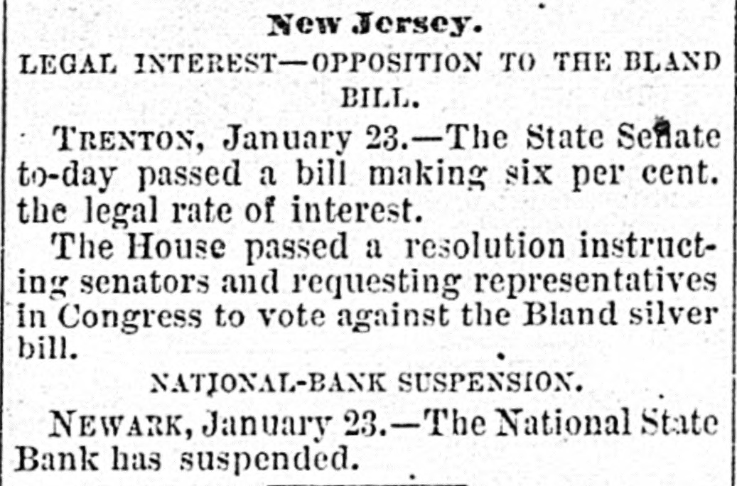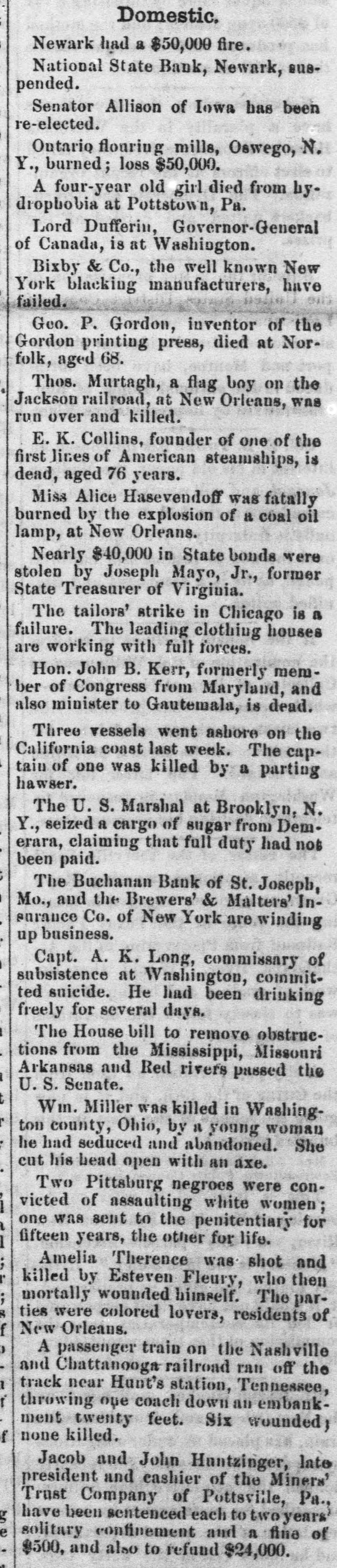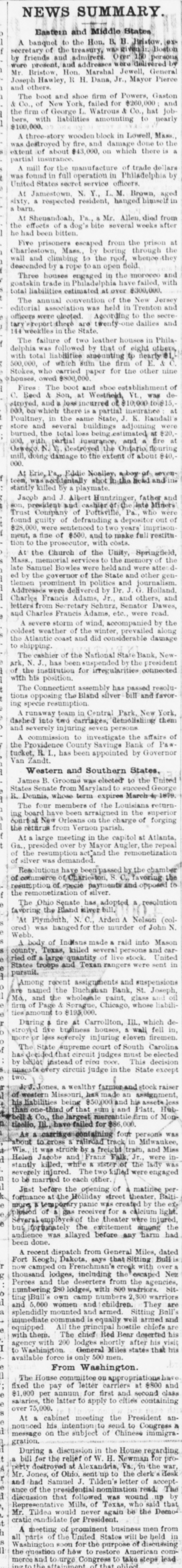 Co., of New York, failed for $260,000 and the firm of George L. Watrous & Co., hat jobbors, with liabilities amounting to nearly $100,000. A three-story wooden block in Lowell, Mass destroyed by fire and damage done to the extent of about $43,000, on which there is a insurance. partial A mill for the manufacture of trade dollars was found in full operation in Philadelphia by United States secret service officers. At Jamestown N. Y., L.M. Brown, aged sixty, & respected resident, hanged himself in barn. At Shenandoah, Pa., a Mr. Allen died from the effects of dog's bite several weeks after he had been bitten. Five prisoners escaped from the prison at Charlestown, Mass., by boring through the wall and climbing to the roof, whence they descended by a rope to an open field. Three houses engaged in the morocco and goatskin trade in Philadelphia have failed, with total liabilities estimated at over $300,000. The annual convention of the New Jersey editorial association was held in Trenton and officers were elected. According to the secre steport there are twenty one dailies and 144 weeklies in the State. The failure of two leather houses in Phila delphia was followed by that of eight others, with total liabilities amounting to nearly $1, 500,000, of which sum the firm of E. & Stokes, who carried paper for the other nine houses, owed $800,000 Fires The boot and shoe establishment of Reed & Son, at Westfield, Vt., was destroyed and loss incurred of 10,000 total 000, on which there is a partial insurance at Poultney, in the same State, J. K. Randall store and several buildings adjoining were burned, the total loss being estimated at $20, with partial insurance and a fire at Oswego N.Y. E destroyed the Ontario flouring will, doing damage to the extent of about 840, At Erie, Pa, Eddie Noalley, alboy of seventeem, was accidentally shot in the Head and like stantly killed by playmate Jacob and J. Albert Huntzinger, father and president and cashier of the late Miners Trust Conipany of Pottsville, Pa., who were found guilty of defrauding & depositor out of $28,000, were sentenced to two years imprison ment, a fine of $500, and to make full restitn tion to the prosecutor, with costs. At the Church of the Unity, Springfield, Mass., memorial services to the memory of the late Samuel Bowles were held and were atte ded by the governor of the State and other gentlemen prominent in politics and journalism. Addresses were delivered by Dr. J.G. Holland. Charles Francis Adams, Jr., and others, and letters from Secretary Schurz, Senator Dawes, and Charles Francis Adams, etc., were read. A severe storm of wind, accompanied by the coldest weather of the winter, prevailed along the Atlantic coast and did considerable damage to shipping. The cashier of the National State Bank, New ark, N. J., has been suspended by the president the institution for irregularities connected with his position. The Connecticut assembly has passed resolutions opposing the Bland silver bill and favor specie resumption A runaway team in Central Park, New York, dashed into two carriages, demolishing them and severely injuring seven persons A commission to investigate the affairs of the Providence County Savings Bank of Paw. tucket, R. I., has been appointed by Governor Van Zandt. Western and Southern States. James B. Grooms was elected to the United States Senate from Maryland to succeed George R. Dennis, whose term expires March 1879. The four members of the Louisiana return mg board have been arraigned in the superior court: New Orleans on the charge of forging the returns from Vernon parish. At a large meeting in the capitol at Atlanta. Ga., presided over by Mayor Augler, the repeal the resumption act and the remonetization of silver was demanded. Resolutions have been passed by the chamber of commerce Charleston, S C., Tavoring the resumption of specie payments and opposed to the remonetization of silver. The Ohio Senate has adopted A resolution favoring the Bland silver bill. At Plymouth, N.C., Arden A Nelson (colored) was hanged for the murder of John N. Webb. A body of Indians made & raid into Mason county, Texas, killed several persons and car ried off a large quantity of live stock. United States troops and Texan rangers were sent in pursuit. Among recent assignments and suspensions are named the Buchsusn Bank, St. Joseph, Mo., and the wholesale paint, glass and oil firm of Page & Sprague, Chicago, whose liabilities amount to $195,000. During a. fire at Carrollton, III., which destroyed five business houses, a wall fell in, more or less severely injuring eleven firemen. The State supreme court of South Carolina has decided that circuit judges must be elected by billot instead of vioa DOCE. This decision unsests every circuit judge in the State except two. J.Jones, & wealthy farmer and stock raiset of western Missouri, has made an assignment his liabilities being $50,000,and his assets less than one third of that sum and Platt. Hub bell & Co., the largest ruereantile firm of Mon ticello, ILL, have failed for 886, 000. As a four persons was about to cross & ratiroad track in Milwaukee Wis. it was struck by & freight train, and Miss Helen Jacobe and Franz Falk Jr. were instantly killed, while & HISTON of the lady was severely injured. The two killed were engaged to be married to each other Just before the opening of & matiries per formance at the Holliday street theater Balti more & temporariry panic was created by the ex lowon of gsas receiver for & calcium light. Several employe the theater were injured, but fortunately the excitement smong the audience was allayed before any harm had been done. A recent dispatch from General Miles, dated Fort Keogh, Dakota. says that Sitting Bull now camped on Frenchman's creck with thousand lodges, including the escaped New Perces and deserters from the agencies, numbering 280 lodges, with 800 warriors. Sitting |Bull's own camp numbers 2. 300 warriors and 5,000 women and children. They are splendidl