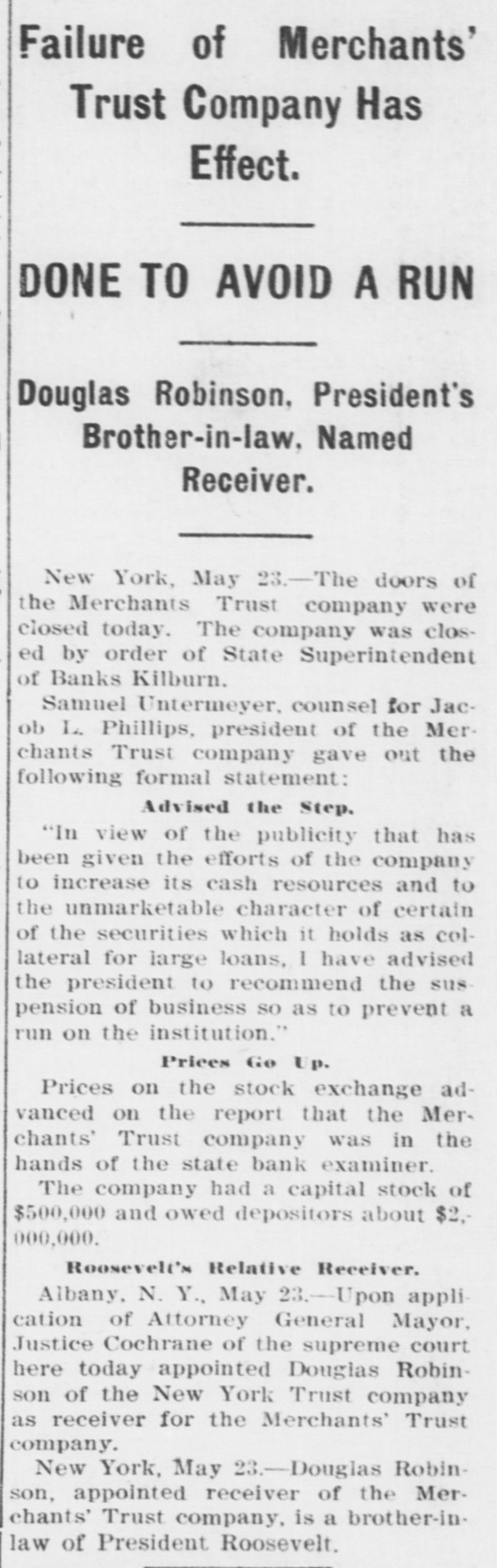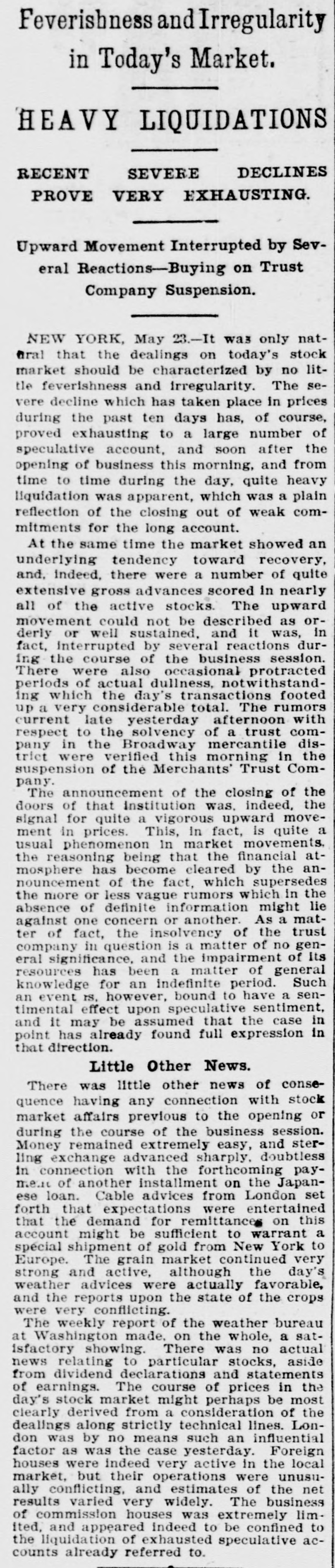 Feverishness and Irregularity in Today's Market. HEAVY LIQUIDATIONS DECLINES RECENT SEVERE PROVE VERY EXHAUSTING. Upward Movement Interrupted by Several Reactions-Buying on Trust Company Suspension. NEW YORK, May 23.-It was only natGral that the dealings on today's stock market should be characterized by no little feverishness and irregularity. The severe decline which has taken place in prices during the past ten days has, of course, proved exhausting to a large number of speculative account, and soon after the opening of business this morning, and from time to time during the day, quite heavy liquidation was apparent, which was a plain reflection of the closing out of weak commitments for the long account. At the same time the market showed an underlying tendency toward recovery, and, indeed, there were a number of quite extensive gross advances scored in nearly all of the active stocks. The upward movement could not be described as orderly or well sustained, and it was, in fact, interrupted by several reactions during the course of the business session. There were also occasional protracted periods of actual dullness, notwithstanding which the day's transactions footed up a very considerable total. The rumors current late yesterday afternoon with respect to the solvency of a trust company in the Broadway mercantile district were verified this morning in the suspension of the Merchants' Trust Company. The announcement of the closing of the doors of that Institution was, indeed, the signal for quite a vigorous upward movement in prices. This, In fact, is quite a usual phenomenon In market movements. the reasoning being that the financial atmosphere has become cleared by the announcement of the fact, which supersedes the more or less vague rumors which in the absence of definite information might lie against one concern or another. As a matter of fact, the insolvency of the trust company in question is a matter of no general significance, and the impairment of its resources has been a matter of general knowledge for an indefinite period. Such an event rs, however, bound to have a sentimental effect upon speculative sentiment, and it may be assumed that the case in point has already found full expression in that direction. Little Other News. There was little other news of consequence having any connection with stock market affairs previous to the opening or during the course of the business session. Money remained extremely easy, and sterling exchange advanced sharply. doubtless in connection with the forthcoming payment of another installment on the Japanese loan. Cable advices from London set forth that expectations were entertained that the demand for remittances on this account might be sufficient to warrant a spécial shipment of gold from New York to Europe. The grain market continued very strong and active, although the day's weather advices were actually favorable, and the reports upon the state of the crops were very conflicting. The weekly report of the weather bureau at Washington made, on the whole, a satisfactory showing. There was no actual news relating to particular stocks, aside from dividend declarations and statements of earnings. The course of prices in the day's stock market might perhaps be most clearly derived from a consideration of the dealings along strictly technical lines. London was by no means such an influential factor as was the case yesterday. Foreign houses were indeed very active in the local market, but their operations were unusually conflicting, and estimates of the net results varied very widely. The business of commission houses was extremely limited, and appeared indeed to be confined to the liquidation of exhausted speculative accounts already referred to.