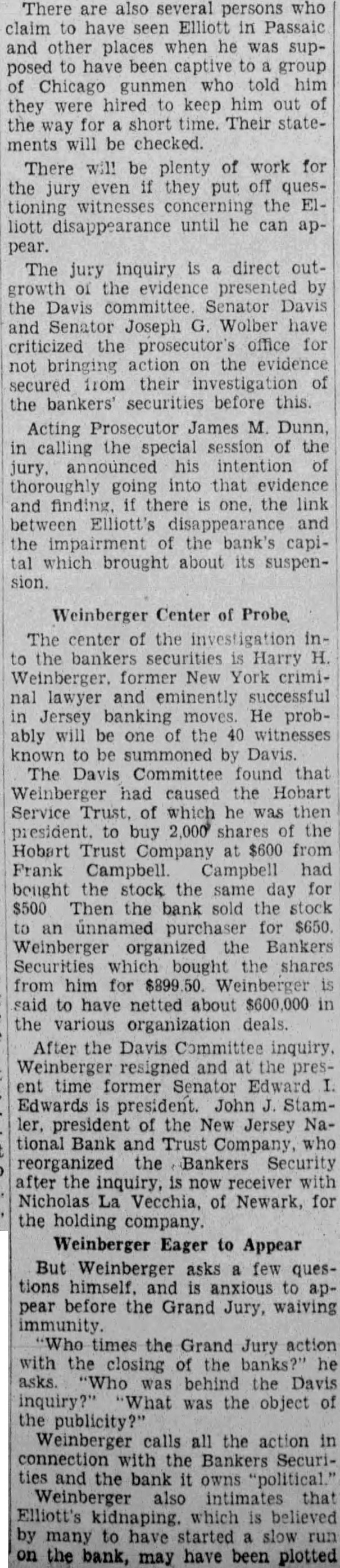 There are several persons have Elliott Passaic and he was supbeen captive group told him they were hired keep him out the for short Their statements will checked. There will be plenty of work for the jury even they off the liott disappearance until he can The jury inquiry direct outthe evidence by the Senator Davis and Joseph Wolber have criticized the prosecutor's office action the secured their investigation the bankers' securities before this. Acting Prosecutor James M. Dunn, the session of the his intention into that evidence there the link Elliott's disappearance and the of the capiwhich brought about its suspen- Weinberger Center of Probe, The center the investigation the bankers securities Harry Weinberger. former New crimilawyer eminently Jersey banking He probably will the 40 witnesses summoned by Davis. The Davis Committee that had caused the Hobart Service which buy the Hobart $600 Frank had the same day for Then the sold the for $650 Weinberger the Bankers Securities which shares from him for Weinberger said netted about various organization After the Davis Committee inquiry. and the ent time former president. John Stampresident the New Jersey NaBank and Trust reorganized Bankers Security the inquiry, now Nicholas Vecchia, of Newark, for the holding company. Weinberger Eager to Appear Weinberger few before the Grand Jury, waiving times the Grand Jury action with the closing the banks? he was behind the Davis What was the object the Weinberger calls all the action in connection the Bankers Securities and the bank it owns Weinberger intimates that Elliott's which believed to have started the bank, may have been plotted