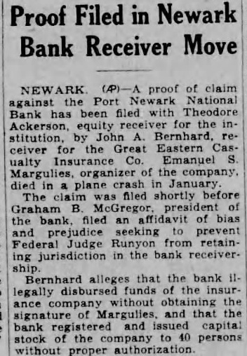 Proof Filed in Newark Bank Receiver Move proof of claim National against Bank filed with the institution, Bernhard, Eastern ceiver ualty Insurance Emanuel Margulies, organizer the company. plane crash January The filed shortly before Graham president bank, filed affidavit of bias the prejudice seeking prevent Federal Judge retaining jurisdiction in the bank receiveralleges that the bank the without the that the bank issued capital stock the to persons without proper authorization