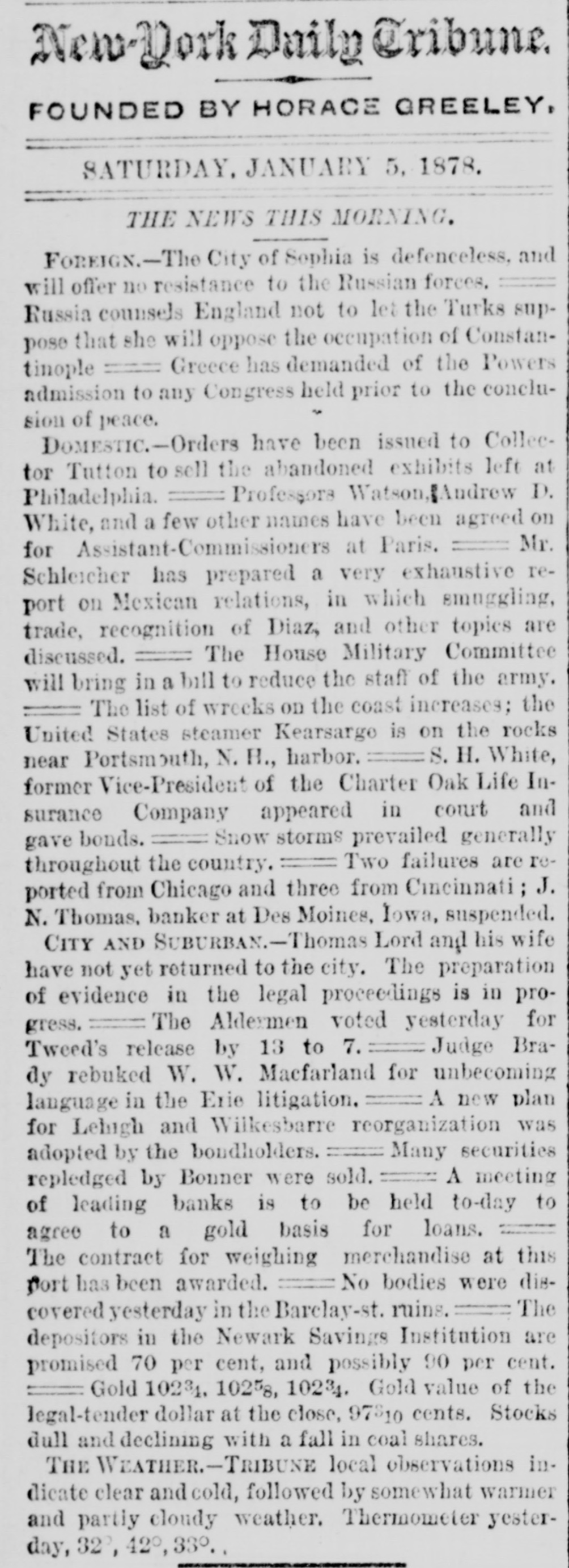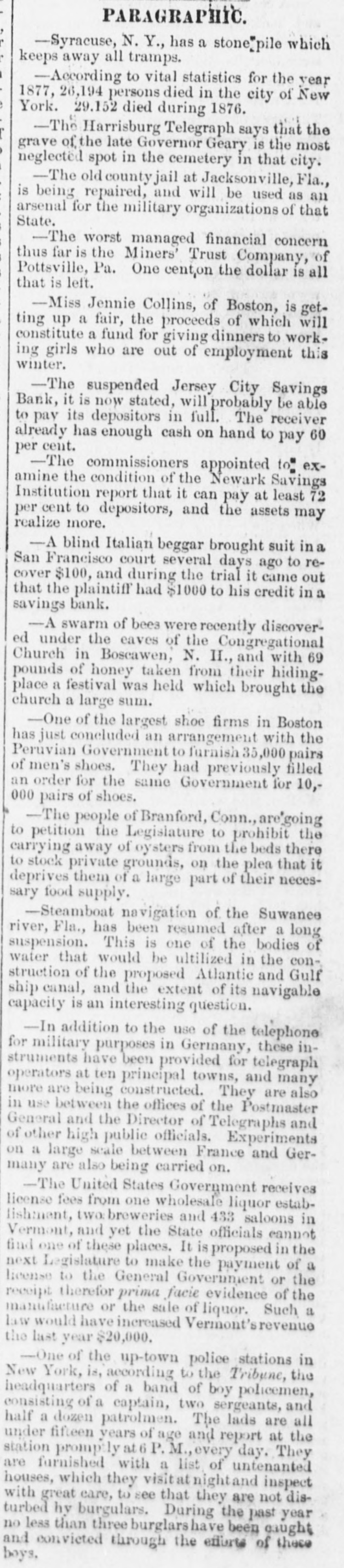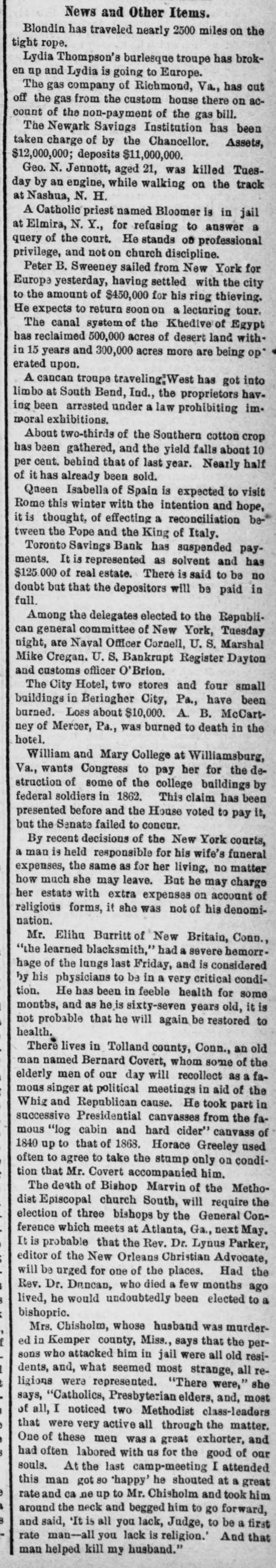 News and Other Items. Blondin has traveled nearly 2500 miles on the tight rope. Lydia Thompson's burlesque troupe has broken up and Lydia is going to Europe. The gas company of Richmond, Va., has cut off the gas from the custom house there on account of the non-payment of the gas bill. The Newark Savings Institution has been taken charge of by the Chancellor. Assets, $12,000,000; deposits $11,000,000. Geo. N. Jennott, aged 21, was killed Tuesday by an engine, while walking on the track at Nashua, N. H. A Catholic priest named Bloomer is in jail at Elmira, N. Y., for refasing to answer a query of the court. He stands OD professional privilege, and not on church discipline. Peter B. Sweeney sailed from New York for Europa yesterday, having settled with the city to the amount of $450,000 for his ring thieving. He expects to return soon on a lecturing tour. The canal system of the Khedive of Egypt has reclaimed 500,000 acres of desert land within 15 years and 300,000 acres more are being op' erated upon. A cancan troupe traveling,West has got into limbo at South Bend, Ind., the proprietors having been arrested under a law prohibiting immoral exhibitions. About two-thirds of the Southern cotton crop has been gathered, and the yield falls about 10 per cent. bebind that of last year. Nearly half of it has already been sold. Qneen Isabella of Spain is expected to visit Rome this winter with the intention and hope, it is thought, of effecting a reconciliation between the Pope and the King of Italy. Toronto Savings Bank has suspended payments. It is represented as solvent and has $125.000 of real estate. There is said to be no doubt but that the depositors will be paid in full. Among the delegates elected to the Republican general committee of New York, Tuesday night, are Naval Officer Cornell, U. S. Marshal Mike Cregan. U. S. Bankrupt Register Dayton and customs officer o' Brion. The City Hotel, two stores and four small buildings in Beringher City, Pa., have been burned. Loss about $10,000. A. B. McCartney of Mercer, Pa., was burned to death in the hotel. William and Mary College at Williamsburg, Va., wants Congress to pay her for the destruction of some of the college buildings by federal soldiers in 1862. This claim has been presented before and the House voted to pay it, but the Senate failed to concur. By recent decisions of the New York courts, a man is held responsible for his wife's funeral expenses, the same as for her living, no matter how much she may leave. But he may charge her estate with extra expenses on account of religious forms, it she was not of his denomination. Mr. Eliha Barritt of New Britain, Conn., "the learned blacksmith," had a severe hemorrhage of the lungs last Friday, and is considered by his physicians to be in a very critical condition. He has been in feeble health for some months, and as he is sixty-seven years old, it is not probable that he will again be restored to health. There lives in Tolland county, Conn., an old man named Bernard Covert, whom some of the elderly men of our day will recollect as a famous singer at political meetings in aid of the Whig and Republican cause. He took part in successive Presidential canvasses from the famous "log cabin and hard cider" canvass of 1840 up to that of 1868. Horace Greeley used often to agree to take the stump only on condition that Mr. Covert accompanied him. The death of Bishop Marvin of the Methodist Episcopal church South, will require the election of three bishops by the General Conference which meets at Atlanta, Ga., next May. It is probable that the Rev. Dr. Lynus Parker, editor of the New Orleans Christian Advocate, will be urged for one of the places. Had the Rev. Dr. Dancan, who died a few months ago lived, he would undoubtedly been elected to a bishopric. Mrs. Chisholm, whose husband was murderf ed in Kemper county, Miss., says that the persons who attacked him in jail were all old resi1 dents, and, what seemed most strange, all religions were represented. "There were," she says, "Catholics, Presbyterian elders, and, most of all, I noticed two Methodist class-leaders that were very active all through the matter. One of these men was a great exhorter, and had often labored with us for the good of our souls. At the last camp-meeting I attended this man got so "happy" he shouted at a great rateand ca ne up to Mr. Chisholm and took him around the neck and begged him to go forward, and said, It is all you lack, Judge, to be a first rate man-all you lack is religion.' And that man helped kill my husband."