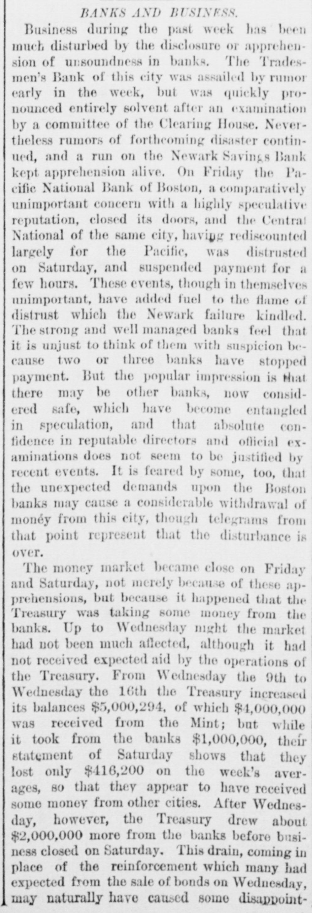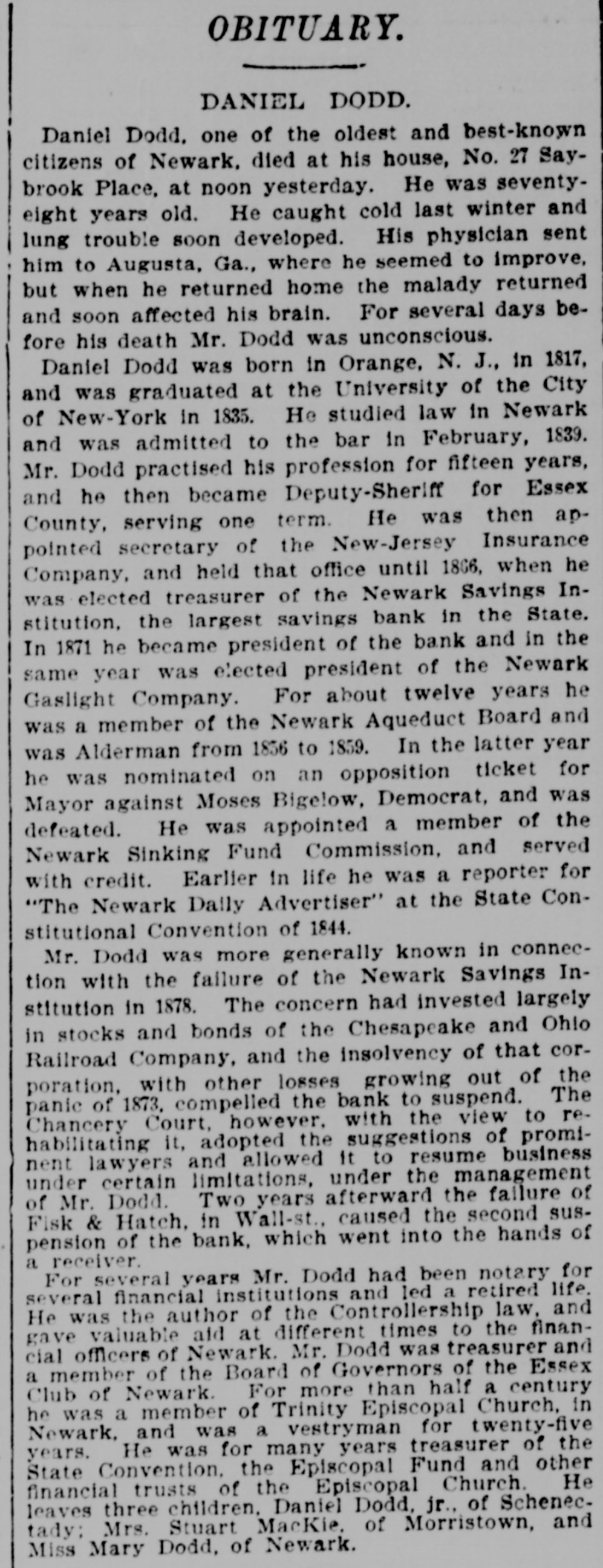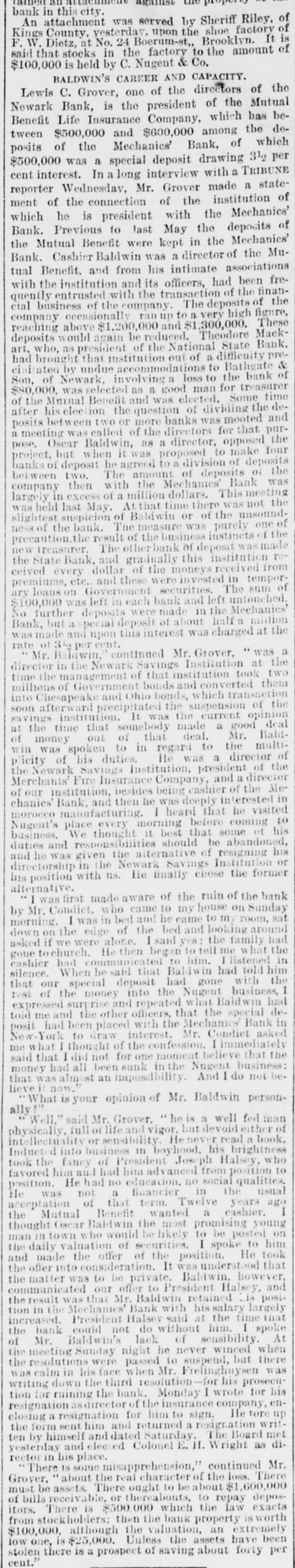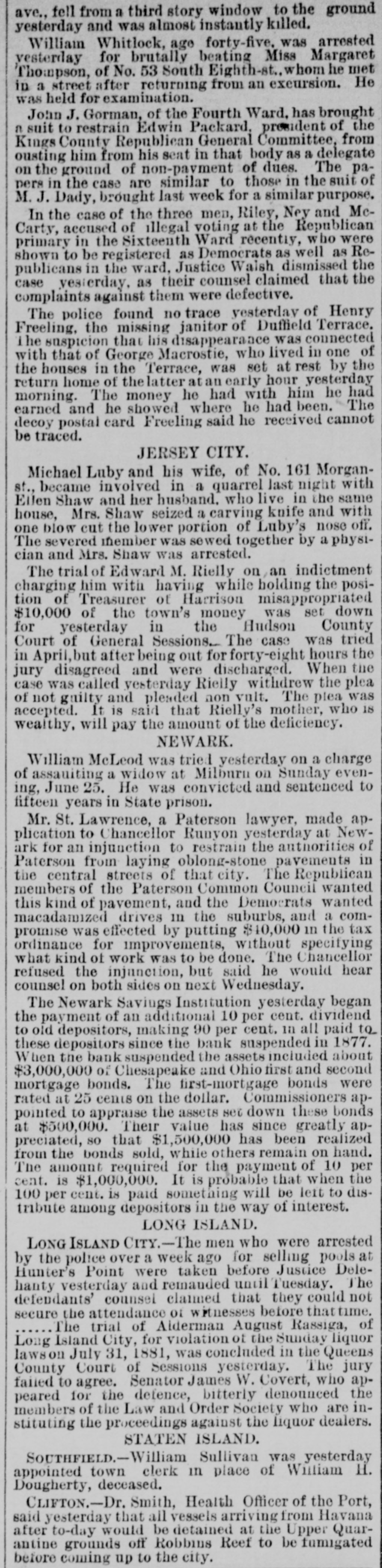 NEW YORK CITY. Last week's record 1,242 arrests, 537 deaths, 563 births, and 227 marriages. The Indies' fair for the benefit of St. Joseph's Church, at One-hundrod-and-twenty-fifth-st. and Ninth-ave., will close to-day. The body of an unknown man, about forty years old, of medium height, and dressed like a longshoroman, was found in the East River at Pier No. 23 yesterday. A meeting of the striking cabinetmakers and varnishers who had been employed by Pottier & Stymus.was held Saturday,and it was reported that 135 men were now on strike. Michael Lavitzki, a Russian pedler, seventy-twovears old, hanged himself at his home, No. 28 Suffolk st., Saturday evening. He was depressed by bad health and the infirmities of old age. The forty-ninth anniversary of the Polish Revolution of 1830 was celebrated by the Polish residents of this city at Dramatic Hall, Houston-st., Saturday evening. Several speeches were made. Drainage and contracts for the laying out of streets the topics discussed at the special meeting of the West Side Association Saturday evening, and among the speakers were General Egbert L. Viele, Dwight H. Olinstead, and John D. Crimmins. A committee of the Westchester Polo Club, consisting of James Gordon Bennett, August Belmont, jr., Herman Oelrichs. F. Gray Griswold and H. L, Herbert. has selected grounds at Fifth-ave. and One-hundred-and-tenth-st, where a club-house will be erected. The total (estimated) amount of grain on the canal from Buffalo and Oswego coming toward tidewater on Saturday noon was Wheat. 179,000 bushels; corn. 273,000 bushels; barley, 94,000 bt shels; rye, 19,600 bushels; peas, 12,200 bushels. The canals will be closed officially on Saturday. The Socialistic Labor party met at the Germania Assembly Rooms Saturday evening, and several speakers spoke of the condition of the workingmen. Resolutions were adopte. protesting against the alleged attempts of the capitalists and their hirelings, the paid politicians of California, to violate the rights of the people." The Tammany committee to investigate the O'Callaghan-Haskin trouble in the XIXth Assembly District met Saturday night. A characteristic letter was received from Mr. Haskin, in which he tried toshow that Callaghan had proved treacherous to the Tammany organization, and asked tbat he be expelled. The subject will next come up before the Committee on Organization. The inmates of the Roosevelt Hospital were gladdened by the gifts which came to them on Thanksgiving Day from the Church of the Covenant, of which the Rev. Dr. Vincent is pastor. These consisted of a bouquet oreach patient, sixteen pots of flowers, a barrel of bananas, apples and oranges, a keg of Malaga grapes, three boxes of grapes, SIX baskets of choice fruits, twelve dozen lemons, a box of oranges, and a box of pears. Information has been received in this city of the arrest in Frankfort-on-the-Main of Alfred Engene Lagrave, who is famous for having swindled prominen! firms in New-York, Boston and Philadelphia in 1871. At that time he fled to Canada, and thence went to Belfast. He was subsequently arrested in London, but was discharged. Again be was arrested in France and brought to New- York, having about $80,000 in his possession, and was again discharged. He 18 now in custody on a charge of forging medical certificates and diplomas. BROOKLYN. The payment of taxes will begin to-day. During the year ending September 30, the Brooklvn, Flatoush and Coney Island Railroad carried 873,960 passengers. Itseatnings were $203,051 30 and its expenditures $155,328 07. Mrs. Barnes, age fifty, living in South Fifth-st., was seiz d with a fit of sickness while walking through Fourth-st. last evening, and died while being taken to St. Catherine's Hospital in an ambulance. Three burglars were discovered in a grocery store at Livingston and Hoyt-sts., Saturday morning, by D. Warms. He caught and held one of them until the arrival of the police. The burglar gave his name as George Watson, of No. 23 Bayard-st., NewYork. Justice Gertrum, of East New-York, has committed to the Penitentiary for thirty days the Rev. David Tibner, a colored preacher, who was charged with assaulting his wife, and whose excuse was that she had gossipped about him among the neighbors. A number of residents of the Eighteenth and Twenty-first Wards held a meeting Saturday night, at Broadway and Myrtle-ave., to protest against the use of steam motors on the Broadway Railroad. A committee of seventeen members was appointed to take proper measures. The St. Matthew's English Lutheran Church Society, which formerly worshipped in State-st., near Hoyt-st., has secured the use of the church at Chinton and Amity-sts., and dedication services were held there yesterday morning. A sermon was preached by the Rev. S. A. Ort, of New York. The Rev. M. W. Hamma IS the pastor of the church. George W. Beilby, of No. 426 Gold-st., who was arrested on Thanksgiving Day on a charge of perjury, has been admitted to bail: He sued W illiam allace and William Lombard, by whom he had been employed as a travelling agent, for breach of contract in lischarging him without paying him his salary for the balance of the year. and recovered a verdict of $560. The defendants have made a joint affidavit that Beilby swore falsely. JERSEY CITY. A hearing in the contest over the $18,000 left by David Leach, the miserly rag-picker who died a year ago, was held in Jersey City on Saturday in the Hudson County Orphan's Court. Mary J. Davis testified that she was a niece of the dead miser, and exhibited some articles which he had given her. Patrolman Thomas Flynn, of the First Police Precinct of Jersey City, died suddenly Saturday morning. He was on duty Thursday night, and returned to the station-house Friday morning with his clothing soiled with mud and his nose bleeding. It was alleged that be had been beaten. Chief of Police Murphy says the officer's death was caused by congestion of the brain. At the last meeting of the Board of 