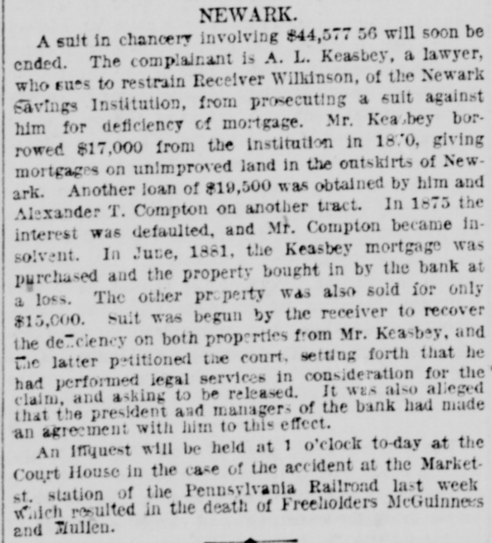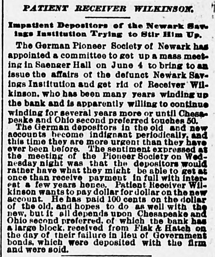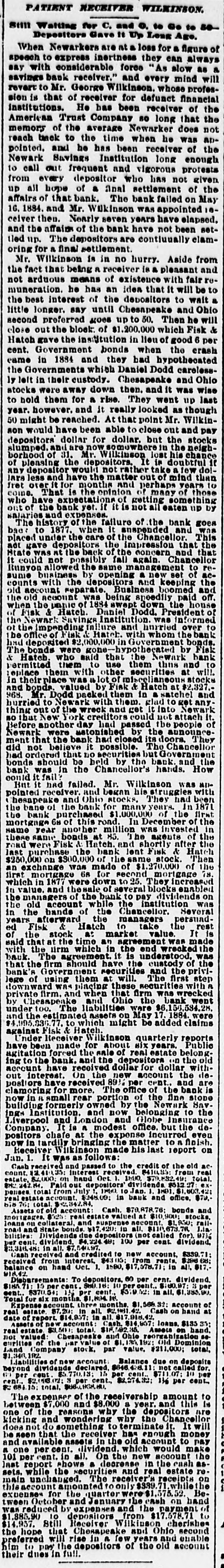 The Newark S Savings Institution is about to disappear, and never was the end of an old institution more welcome. The bank failed owing depositora millions. An arrangement was made by which the bank reorganized, was allowed to pay off its indebtedness as slowly as it pleased, and was permitted to receive new deposits, all under the control and by permission of the Court of Chancery. The first failure had been caused by bad Investments, yet the managers went to the same Wall Street speculators and dabbled in the same stocks which had caused the first collapse, and a new fallure was the natural and legitimate result. The liabilities this time were $6,000,000. The whole matter was then put in a receiver's hands, and has there remained for years. The "old account" has been paid in full, and there was some surplus even. The sale of real estate and the realization of other assets sufficed after a time to pay depositors 89 1-2 per cent, and the negligent managers were compelled to pay $100,000 toward this. The remaining assets were $1,200,000 of Chesapeake and Ohio second preferred stock, and $176,000 of Old Dominion Land Company stock with some other odds and ends-the scrapings of Fish & Hatch's office after the failure of that firm, which also carried down the bank. The receiver has at last sold the Chesapeake and Ohio stock at a good price and has good offers for the Old Dominion stock, and will thus have enough to pay every depositor in full in sixty